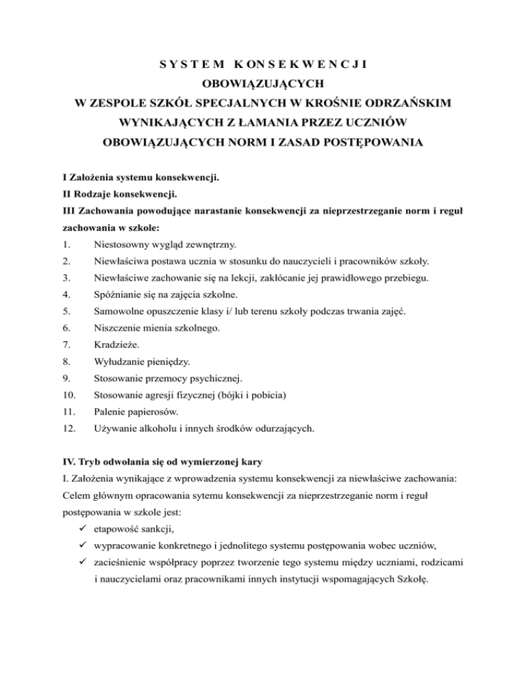 S Y S T E M K ON S E K W E N C J I OBOWIĄZUJĄCYCH W ZESPOLE SZKÓŁ SPECJALNYCH W KROŚNIE ODRZAŃSKIM WYNIKAJĄCYCH Z ŁAMANIA PRZEZ UCZNIÓW OBOWIĄZUJĄCYCH NORM I ZASAD POSTĘPOWANIA I Założenia systemu konsekwencji. II Rodzaje konsekwencji. III Zachowania powodujące narastanie konsekwencji za nieprzestrzeganie norm i reguł zachowania w szkole: 1. Niestosowny wygląd zewnętrzny. 2. Niewłaściwa postawa ucznia w stosunku do nauczycieli i pracowników szkoły. 3. Niewłaściwe zachowanie się na lekcji, zakłócanie jej prawidłowego przebiegu. 4. Spóźnianie się na zajęcia szkolne. 5. Samowolne opuszczenie klasy i/ lub terenu szkoły podczas trwania zajęć. 6. Niszczenie mienia szkolnego. 7. Kradzieże. 8. Wyłudzanie pieniędzy. 9. Stosowanie przemocy psychicznej. 10. Stosowanie agresji fizycznej (bójki i pobicia) 11. Palenie papierosów. 12. Używanie alkoholu i innych środków odurzających. IV. Tryb odwołania się od wymierzonej kary I. Założenia wynikające z wprowadzenia systemu konsekwencji za niewłaściwe zachowania: Celem głównym opracowania sytemu konsekwencji za nieprzestrzeganie norm i reguł postępowania w szkole jest: etapowość sankcji, wypracowanie konkretnego i jednolitego systemu postępowania wobec uczniów, zacieśnienie współpracy poprzez tworzenie tego systemu między uczniami, rodzicami i nauczycielami oraz pracownikami innych instytucji wspomagających Szkołę. Z rozmów z uczniami uzyskaliśmy informację, że konsekwencje stosowane dotychczas w naszej szkole są niejednolite, co budzi pewne poczucie niesprawiedliwości. Nauczyciele i wychowawcy często za to samo przewinienie wyciągają różne konsekwencje. Sytuacja taka może prowadzić do wniosków, że nie wszyscy traktowani są tak samo. Aby zapobiec takiej sytuacji oraz podnieść poziom efektywności wychowania postanowiliśmy opracować system konsekwencji, który w sposób jasny i klarowny określa rodzaj i gradację sankcji za konkretne przewinienia. Mamy nadzieję, że jasno sprecyzowane normy i konsekwentne przestrzeganie zasad zwiększą poczucie samokontroli wśród uczniów, przyczynią się do poprawy stanu bezpieczeństwa w szkole i wyeliminują szereg niepożądanych zjawisk. II. Rodzaje konsekwencji: 1. Wpisanie uwagi do zeszytu uwag. 2. Utrata przywilejów: Zakaz udziału w imprezach szkolnych (wycieczki, dyskoteki), Zakaz reprezentowania szkoły w zawodach sportowych, imprezach. 3. Czasowe wykluczenie w trakcie lekcji – uczeń przebywa w gabinecie psychologa, pedagoga, w bibliotece szkolnej. Podczas wykluczenia uczeń otrzymuje zadanie do wykonania: - przepisanie tekstu np. szkodliwość palenia papierosów, spożywania alkoholu, zasady dobrego zachowania w szkole, zasady obowiązujące uczniów w szkole itp. 4. Uczeń telefonicznie powiadamia rodziców o swoim zachowaniu. 5. Napisanie listu do domu o sytuacji zaistniałej w szkole. 6. Uzupełnienie arkusza przemyśleń. 7. „Minuta po lekcji” – zabierasz czas na lekcji – oddajesz czas po lekcji. 8. Prace społeczno – użyteczne na rzecz szkoły (łamanie zasad, nieobecności nieusprawiedliwione w szkole). 9. Upomnienie ustne wychowawcy w rozmowie bezpośredniej z uczniem. 10. Upomnienie wychowawcy na forum klasy. 11. Rozmowa dyscyplinująca w gabinecie pedagoga szkolnego/ psychologa. 12. Pisemna nagana wychowawcy (z załączeniem do teczki ucznia). 13. Nagana ustna dyrektora podczas apelu ogólnoszkolnego. 14. Nagana pisemna dyrektora szkoły (z wpisem do teczki ucznia). 15. Poinformowanie o przejawach demoralizacji Policji i Sądu Rodzinnego i Nieletnich. III. ZACHOWANIA POWODUJĄCE NARASTANIE KONSEKWENCJI ZA NIEPRZESTRZEGANIE NORM I REGUŁ ZACHOWANIA W SZKOLE: 1. Wygląd zewnętrzny. Przez niestosowny wygląd zewnętrzny rozumie się: brak obowiązującego stroju galowego oraz stroju i obuwia na zajęciach sportowych, farbowane włosy, makijaż oczu, ust i paznokci, kolczyki (dozwolona mała dyskretna biżuteria, inne uczeń ma obowiązek usunąć podczas trwania lekcji), noszenie czapek, kapturów na terenie szkoły, noszenie wszelkich emblematów znamionujących identyfikację z subkulturami lub poglądami uznawanymi powszechnie za negatywne. - pierwszy przypadek – upomnienie ustne wychowawcy, rozmowa z pielęgniarką szkolną, - drugi przypadek - upomnienie wychowawcy, - kolejny przypadek – upomnienie wychowawcy na forum klasy, rozmowa dyscyplinująca w gabinecie pedagoga szkolnego, psychologa, - kolejny – pisemna nagana wychowawcy z powiadomieniem rodziców, - niestosowanie się do wcześniejszych uwag – nagana dyrektora na forum szkoły. 2. Niewłaściwa postawa ucznia w stosunku do nauczycieli i pracowników szkoły. - wobec przypadku pierwszego zajścia – upomnienie ustne nauczyciela, odwołanie się do kontraktu klasowego, - ponowne lekceważące zachowanie – upomnienie ustne wychowawcy, - powtarzające się lekceważące zachowanie – rozmowa dyscyplinująca z pedagogiem, psychologiem, pisemna nagana od wychowawcy z powiadomieniem rodziców, - jeśli do niewłaściwych zachowań dochodzi nadal – wezwanie przez wychowawcę klasy rodzica na posiedzenie zespołu wychowawczego (dyrektor, pedagog, psycholog, rodzic, uczeń, wychowawca klasy), poinformowanie kuratora - kolejny przypadek – nagana dyrektora na forum szkoły, - notoryczne łamanie zasad – poinformowanie Sądu Rodzinnego i Nieletnich, 3. Niewłaściwe zachowanie na lekcji, zakłócanie jej prawidłowego przebiegu. - w przypadku pierwszego incydentu – upomnienie ustne nauczyciela prowadzącego lekcję, odwołanie się do kontraktu klasowego, - kolejny przypadek - wpisanie uwagi do zeszytu uwag, - kolejny przypadek – zgłoszenie problemu wychowawcy, upomnienie wychowawcy, analiza niewłaściwych zachowań ucznia, - powtarzające się niewłaściwe zachowanie – rozmowa interwencyjno – wychowawcza z pedagogiem szkolnym, psychologiem, poinformowanie rodziców, - brak reakcji na podejmowane działania – wezwani