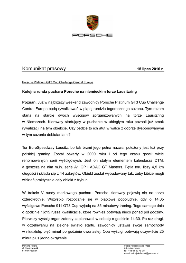 Komunikat prasowy 15 lipca 2016 r. Porsche Platinum GT3 Cup Challenge Central Europe Kolejna runda pucharu Porsche na niemieckim torze Lausitzring Poznań. Już w najbliższy weekend zawodnicy Porsche Platinum GT3 Cup Challenge Central Europe będą rywalizować w piątej rundzie tegorocznego sezonu. Tym razem staną na starcie dwóch wyścigów zorganizowanych na torze Lausitzring w Niemczech. Kierowcy startujący w pucharze w ubiegłym roku poznali już smak rywalizacji na tym obiekcie. Czy będzie to ich atut w walce z dobrze dysponowanymi w tym sezonie debiutantami? Tor EuroSpeedway Lausitz, bo tak brzmi jego pełna nazwa, położony jest tuż przy polskiej granicy. Został otwarty w 2000 roku i od tego czasu gościł wiele renomowanych serii wyścigowych. Jest on stałym elementem kalendarza DTM, a goszczą na nim m.in. serie A1 GP i ADAC GT Masters. Pętla toru liczy 4,5 km długości i składa się z 14 zakrętów. Obiekt został wybudowany tak, żeby kibice mogli widzieć praktycznie cały obiekt z trybun. W trakcie V rundy markowego pucharu Porsche kierowcy pojawią się na torze czterokrotnie. Wszystko rozpocznie się w piątkowe popołudnie, gdy o 14:05 wyścigowe Porsche 911 GT3 Cup wyjadą na 35-minutowy trening. Tego samego dnia o godzinie 16:15 ruszą kwalifikacje, które również potrwają nieco ponad pół godziny. Pierwszy wyścig organizatorzy zaplanowali w sobotę o godzinie 14:30. Po raz drugi, w oczekiwaniu na zielone światło startu, zawodnicy ustawią swoje samochody w niedzielę, pięć minut po godzinie dwunastej. Oba wyścigi potrwają oczywiście 25 minut plus jedno okrążenie. Porsche Polska ul. Krańcowa 44 61-037 Poznań Public Relations and Press Artur Jakubczak tel. +48 61 62 73 911 e-mail: [email protected] Każde Porsche 911 GT3 Cup stające na starcie wyścigów z serii Porsche Platinum GT3 Cup Challenge Central Europe korzysta z ogumienia firmy Michelin, która jest wyłącznym dostawcą opon dla całego pucharu. O dobrą pracę silników pracujących w Porsche 911 GT3 Cup dbają za to oleje silnikowe Platinum, produkowane przez polską firmę Orlen Oil – strategicznego partnera serii. W wyniku tej kooperacji oleje silnikowe Platinum mogą być stale rozwijane i udoskonalane, dzięki czemu klienci otrzymują produkt najwyższej światowej jakości. Po czterech rundach pucharu w klasyfikacji generalnej prowadzi Piotr Parys, który okazał się najszybszy w aż siedmiu wyścigach. Dość niespodziewanie, drugie miejsce ze stratą 56 punktów zajmuje Mariusz Urbański, a trzeci jest kolejny tegoroczny debiutant, Marcin Jaros. Tylko cztery punkty straty do podium ma za to Marcin Jedliński, który w zeszłym roku wygrał jeden z wyścigów na torze EuroSpeedway Lausitz. W klasie S pierwsze miejsce zajmuje, piąty w całym cyklu, Stanisław Jedliński. Na starcie V rundy stanie w sumie 14 zawodników, a ciekawa konfiguracja toru i zacięta rywalizacja w poprzednich rundach jest gwarancją dużych emocji dla kibiców, którzy pojawią się na trybunach niemieckiego obiektu. Wypowiedzi przed piątą rundą Porsche Platinum GT3 Cup Challenge Central Europe: Mariusz Urbański - „Tor Lausitzring to jedyny tor poza torem Poznań, na którym miałem okazję już jeździć. Liczę na dobry wynik, ponieważ chcę walczyć o utrzymanie 2 miejsca w klasyfikacji generalnej. Jak dotąd cały sezon układa się dla mnie dobrze, więc przed najbliższą rundą jestem optymistą. Trzymajcie kciuki.” Marcin Jaros - „Bardzo lubię tor w Lausitz i dobrze się na nim czuję. W najbliższej rundzie Porsche Platinum GT3 Cup Challenge Central Europe oczekuję dobrej pozycji i przy odrobinie szczęścia postaram się powalczyć o zwycięstwo. Podczas moich poprzednich startów na torze w Lausitz, dodatkową motywację generowało liczne grono kibiców z Polskich, których mam nadzieję i tym razem nie zabraknie na trybunach.” V runda Porsche Platinum GT3 Cup Challenge Central Europe Piątek 15 lipca, 14:05 – 14:40 – sesja treningowa Piątek 15 lipca, 16:15 – 16:50 – sesja kwalifikacyjna Sobota 16 lipca, 14:30 – 14:55 – Wyścig 1 Niedziela 17 lipca, 12:05 – 12:30 – Wyścig 2