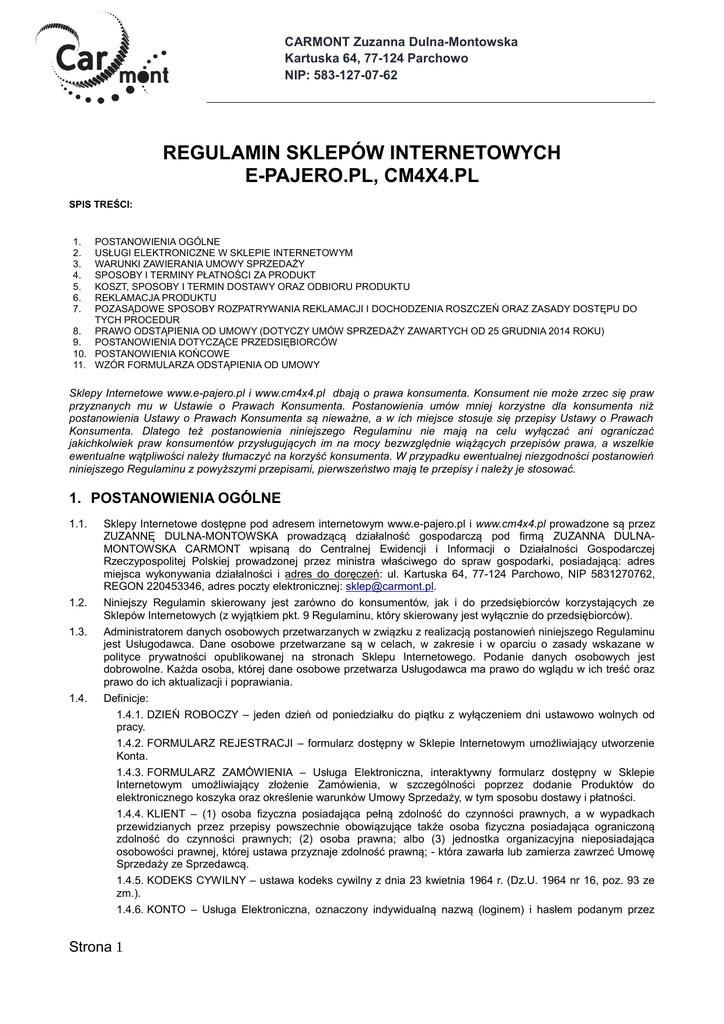 CARMONT Zuzanna Dulna-Montowska Kartuska 64, 77-124 Parchowo NIP: 583-127-07-62 REGULAMIN SKLEPÓW INTERNETOWYCH E-PAJERO.PL, CM4X4.PL SPIS TREŚCI: 1. 2. 3. 4. 5. 6. 7. POSTANOWIENIA OGÓLNE USŁUGI ELEKTRONICZNE W SKLEPIE INTERNETOWYM WARUNKI ZAWIERANIA UMOWY SPRZEDAŻY SPOSOBY I TERMINY PŁATNOŚCI ZA PRODUKT KOSZT, SPOSOBY I TERMIN DOSTAWY ORAZ ODBIORU PRODUKTU REKLAMACJA PRODUKTU POZASĄDOWE SPOSOBY ROZPATRYWANIA REKLAMACJI I DOCHODZENIA ROSZCZEŃ ORAZ ZASADY DOSTĘPU DO TYCH PROCEDUR 8. PRAWO ODSTĄPIENIA OD UMOWY (DOTYCZY UMÓW SPRZEDAŻY ZAWARTYCH OD 25 GRUDNIA 2014 ROKU) 9. POSTANOWIENIA DOTYCZĄCE PRZEDSIĘBIORCÓW 10. POSTANOWIENIA KOŃCOWE 11. WZÓR FORMULARZA ODSTĄPIENIA OD UMOWY Sklepy Internetowe www.e-pajero.pl i www.cm4x4.pl dbają o prawa konsumenta. Konsument nie może zrzec się praw przyznanych mu w Ustawie o Prawach Konsumenta. Postanowienia umów mniej korzystne dla konsumenta niż postanowienia Ustawy o Prawach Konsumenta są nieważne, a w ich miejsce stosuje się przepisy Ustawy o Prawach Konsumenta. Dlatego też postanowienia niniejszego Regulaminu nie mają na celu wyłączać ani ograniczać jakichkolwiek praw konsumentów przysługujących im na mocy bezwzględnie wiążących przepisów prawa, a wszelkie ewentualne wątpliwości należy tłumaczyć na korzyść konsumenta. W przypadku ewentualnej niezgodności postanowień niniejszego Regulaminu z powyższymi przepisami, pierwszeństwo mają te przepisy i należy je stosować. 1. POSTANOWIENIA OGÓLNE 1.1. 1.2. 1.3. 1.4. Sklepy Internetowe dostępne pod adresem internetowym www.e-pajero.pl i www.cm4x4.pl prowadzone są przez ZUZANNĘ DULNA-MONTOWSKA prowadzącą działalność gospodarczą pod firmą ZUZANNA DULNAMONTOWSKA CARMONT wpisaną do Centralnej Ewidencji i Informacji o Działalności Gospodarczej Rzeczypospolitej Polskiej prowadzonej przez ministra właściwego do spraw gospodarki, posiadającą: adres miejsca wykonywania działalności i adres do doręczeń: ul. Kartuska 64, 77-124 Parchowo, NIP 5831270762, REGON 220453346, adres poczty elektronicznej: [email protected]. Niniejszy Regulamin skierowany jest zarówno do konsumentów, jak i do przedsiębiorców korzystających ze Sklepów Internetowych (z wyjątkiem pkt. 9 Regulaminu, który skierowany jest wyłącznie do przedsiębiorców). Administratorem danych osobowych przetwarzanych w związku z realizacją postanowień niniejszego Regulaminu jest Usługodawca. Dane osobowe przetwarzane są w celach, w zakresie i w oparciu o zasady wskazane w polityce prywatności opublikowanej na stronach Sklepu Internetowego. Podanie danych osobowych jest dobrowolne. Każda osoba, której dane osobowe przetwarza Usługodawca ma prawo do wglądu w ich treść oraz prawo do ich aktualizacji i poprawiania. Definicje: 1.4.1. DZIEŃ ROBOCZY – jeden dzień od poniedziałku do piątku z wyłączeniem dni ustawowo wolnych od pracy. 1.4.2. FORMULARZ REJESTRACJI – formularz dostępny w Sklepie Internetowym umożliwiający utworzenie Konta. 1.4.3. FORMULARZ ZAMÓWIENIA – Usługa Elektroniczna, interaktywny formularz dostępny w Sklepie Internetowym umożliwiający złożenie Zamówienia, w szczególności poprzez dodanie Produktów do elektronicznego koszyka oraz określenie warunków Umowy Sprzedaży, w tym sposobu dostawy i płatności. 1.4.4. KLIENT – (1) osoba fizyczna posiadająca pełną zdolność do czynności prawnych, a w wypadkach przewidzianych przez przepisy powszechnie obowiązujące także osoba fizyczna posiadająca ograniczoną zdolność do czynności prawnych; (2) osoba prawna; albo (3) jednostka organizacyjna nieposiadająca osobowości prawnej, której ustawa przyznaje zdolność prawną; - która zawarła lub zamierza zawrzeć Umowę Sprzedaży ze Sprzedawcą. 1.4.5. KODEKS CYWILNY – ustawa kodeks cywilny z dnia 23 kwietnia 1964 r. (Dz.U. 1964 nr 16, poz. 93 ze zm.). 1.4.6. KONTO – Usługa Elektroniczna, oznaczony indywidualną nazwą (loginem) i hasłem podanym przez Strona 1 Usługobiorcę zbiór zasobów w systemie teleinformatycznym Usługodawcy, w którym gromadzone są dane podane przez Usługobiorcę oraz informacje o złożonych przez niego Zamówieniach w Sklepie Internetowym. 1.4.7. PRODUKT – dostępna w Sklepie Internetowym rzecz ruchoma będąca przedmiotem Umowy Sprzedaży między Klientem a Sprzedawcą. 1.4.8. REGULAMIN – niniejszy regulamin Sklepu Internetowego. 1.4.9. SKLEP INTERNETOWY - sklepy internetowe Usługodawcy dostępne pod adresem internetowym: www.e-pajero.pl i www.cm4x4.pl. 1.4.10. SPRZEDAWCA; USŁUGODAWCA – ZUZANNA DULNA-MONTOWSKA prowadząca działalność gospodarczą pod firmą ZUZANNA DULNA-MONTOWSKA CARMONT wpisana do Centralnej Ewidencji i Informacji o Działalności Gospodarczej Rzeczypospolitej Polskiej prowadzonej przez ministra właściwego do spraw gospodarki, posiadająca: adres miejsca wykonywania działalności i adres do doręczeń: ul. Kartuska 64, 77-124 Parchowo, NIP 5831270762, REGON 220453346, adres poczty elektronicznej: [email protected]. 1.4.11. UMOWA SPRZEDAŻY – umowa sprzedaży Produktu zawierana albo zawarta między Klientem a Sprzedawcą za pośrednictwem Sklepu Internetowego. 1.4.12. USŁUGA ELEKTRONICZNA – usługa świadczona drogą elektroniczną przez Usługodawcę na rzecz Usługobiorcy za pośrednictwem Sklepu Internetowego. 1.4.13. USŁUGOBIORCA – (1) osoba fizyczna posiadająca pełną zdolność do czynności prawnych, a w wypadkach przewidzianych przez przepisy powszechnie obowiązujące także osoba fizyczna posiadająca ograniczoną zdolność do czynności prawnych; (2) osoba prawna; albo (3) jednostka organizacyjna nieposiadająca osobowości prawnej, której ustawa przyznaje zdolność prawną; - korzystająca lub zamierzająca korzystać z Usługi Elektronicznej. 1.4.14. USTAWA O PRAWACH KONSUMENTA, USTAWA – ustawa z dnia 30 maja 2014 r. o prawach konsumenta (Dz.U. 2014 poz. 827 ze zm.) 1.4.15. ZAMÓWIENIE - oświadczenie woli Klienta składane za po