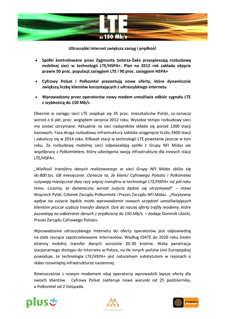 Ultraszybki Internet zwiększa zasięg i prędkość Spółki kontrolowane przez Zygmunta Solorza-Żaka przyspieszają rozbudowę mobilnej sieci w technologii LTE/HSPA+. Plan na 2012 rok zakłada objęcie prawie 50 proc. populacji zasięgiem LTE i 90 proc. zasięgiem HSPA+ Cyfrowy Polsat i Polkomtel prezentują nowe oferty, które dynamicznie zwiększą liczbę klientów korzystających z ultraszybkiego Internetu Wprowadzony przez operatorów nowy modem umożliwia odbiór sygnału LTE z szybkością do 150 Mb/s Obecnie w zasięgu sieci LTE znajduje się 35 proc. mieszkańców Polski, co oznacza wzrost o 6 pkt. proc. względem sierpnia 2012 roku. Wysokie tempo rozbudowy sieci ma zostać utrzymane. Aktualnie na sieć nadajników składa się ponad 1300 stacji bazowych. Faza druga rozbudowy infrastruktury zakłada osiągnięcie liczby 3400 stacji i zakończy się w 2014 roku. Kilkaset stacji w technologii LTE powstanie jeszcze w tym roku. Za rozbudowę mobilnej sieci odpowiadają spółki z Grupy NFI Midas we współpracy z Polkomtelem, który udostępnia swoją infrastrukturę dla nowych stacji LTE/HSPA+. „Wielkość transferu danych realizowanego w sieci Grupy NFI Midas zbliża się do 800 tys. GB miesięcznie. Oznacza to, że klienci Cyfrowego Polsatu i Polkomtela zużywają miesięcznie dwa razy więcej transferu w technologii LTE/HSPA+ niż pół roku temu. Liczymy, że dynamiczny wzrost zużycia będzie się utrzymywał” – mówi Wojciech Pytel, Członek Zarządu Polkomtela i Prezes Zarządu NFI Midas. „Pozytywny wpływ na zużycie będzie miało wprowadzenie nowych urządzeń umożliwiających klientom jeszcze szybszy transfer danych. Dziś do naszej oferty trafiły modemy, które pozwalają na odbieranie danych z prędkością do 150 Mb/s. – dodaje Dominik Libicki, Prezes Zarządu Cyfrowego Polsatu. Wprowadzenie ultraszybkiego Internetu do oferty operatorów jest odpowiedzią na stale rosnące zapotrzebowanie internautów. Według IDATE do 2020 roku średni dzienny mobilny transfer danych wzrośnie 20-30 krotnie. Niska penetracja stacjonarnego dostępu do Internetu w Polsce, na tle innych państw Unii Europejskiej powoduje, że technologia LTE/HSPA+ jest naturalnym substytutem w rejonach o słabo rozwiniętej infrastrukturze naziemnej. Równocześnie z nowym modemem obaj operatorzy wprowadzili lepsze oferty dla swoich klientów. Cyfrowy Polsat zaoferuje nowe warunki od 25 października, a Polkomtel od 2 listopada. O technologii LTE Internet w technologii LTE to rynkowy standard przyszłości. Tylko w ciągu dwóch ostatnich lat liczba państw, w których komercyjnie funkcjonuje tego typu sieć się podwoiła i obecnie 351 operatorów dostarcza Internet w tej technologii w 104 krajach. Spółki z Grupy NFI Midas jako pierwsze na świecie rozpoczęły świadczenie usługi dostępu do Internetu w technologii LTE na paśmie 1800 MHz, który obecnie jest europejskim standardem i funkcjonuje w 8 państwach. Obecnie na całym świecie funkcjonuje ponad 100 urządzeń działa na paśmie 1800 MHz, a najwięksi producenci wprowadzają tą technologię do swoich flagowych modeli. Na dziś Cyfrowy Polsat i Polkomtel są jedynymi operatorami, którzy dostarczają dostęp do tej technologii Klientom ostatecznym w Polsce. Kontakt dla dziennikarzy: Polkomtel Aleksanda Gieros-Brzezińska [email protected] +48 601 137 157 NFI Midas Piotr Sobiś [email protected] +48 720 080 000 Cyfrowy Polsat Olga Zomer [email protected] +48 507 096 883