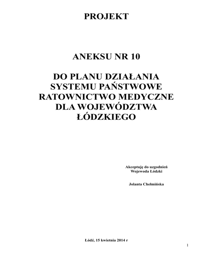 PROJEKT ANEKSU NR 10 DO PLANU DZIAŁANIA SYSTEMU PAŃSTWOWE RATOWNICTWO MEDYCZNE DLA WOJEWÓDZTWA ŁÓDZKIEGO Akceptuję do uzgodnień Wojewoda Łódzki Jolanta Chełmińska Łódź, 15 kwietnia 2014 r 1 Spis treści Rozdział I: CHARAKTERYSTYKA POTENCJALNYCH ZAGROŻEŃ DLA ŻYCIA I ZDROWIA....................................................................................................................................... 4 4. Liczba wyjazdów zespołów ratownictwa medycznego na obszarze województwa.....................4 a) krótka charakterystyka ogólna, czasy dotarcia.........................................................................4 b) tabele 1 i 2 sporządzone w aplikacji umożliwiającej dokonywanie obliczeń w formie tabelarycznej.................................................................................................................................5 TABELA 1 - Wyjazdy zespołów ratownictwa medycznego w 2013 r................................................ 6 TABELA 2 – Wyjazdy zespołów ratownictwa medycznego w roku 2013........................................10 5. Liczba wylotów lotniczych zespołów ratownictwa medycznego na obszarze województwa. . .14 b) tabele 3 i 4 sporządzone w aplikacji umożliwiającej dokonywanie obliczeń w formie tabelarycznej...............................................................................................................................14 TABELA 3 - Wyloty lotniczych zespołów ratownictwa medycznego w roku 2013.........................14 TABELA 4 - Wyloty lotniczych zespołów ratownictwa medycznego w roku 2013.........................15 6. Hospitalizacja osób w stanach nagłego zagrożenia zdrowotnego..............................................16 a) krótka charakterystyka ogólna............................................................................................... 16 b) tabele 5 i 6 sporządzone w aplikacji umożliwiającej dokonywanie obliczeń w formie tabelarycznej...............................................................................................................................17 TABELA 5 - Liczba przyjęć pacjentów w szpitalnym oddziale ratunkowym w 2013 roku.............17 TABELA 6 - Liczba przyjęć pacjentów w izbie przyjęć w 2013 roku..............................................22 II. INFORMACJE O LICZBIE I ROZMIESZCZENIU NA OBSZARZE WOJEWÓDZTWA JEDNOSTEK SYSTEMU ORAZ CENTRÓW URAZOWYCH, JEDNOSTEK ORGANIZACYJNYCH WYSPECJALIZOWANYCH W ZAKRESIE UDZIELANIA ŚWIADCZEŃ ZDROWOTNYCH NIEZBĘDNYCH DLA RATOWNICTWA MEDYCZNEGO I INNE (stan na dzień 31 grudnia 2013 r.)............................................................................................33 1.Zespoły ratownictwa medycznego - liczba, rodzaje, rejony operacyjne, obszary działania, dysponenci - tabele 7, 8 i 9 sporządzone w aplikacji umożliwiającej dokonywanie obliczeń w formie tabelarycznej.......................................................................................................................33 TABELA 7 – Rejony operacyjne i miejsca stacjonowania zespołów ratownictwa medycznego......33 TABELA 8 – Zespoły ratownictwa medycznego włączone do Systemu Państwowe Ratownictwo Medyczne – stan na dzień 31 grudnia 2013 r..................................................................................... 47 TABELA 9 – Dodatkowe zespoły ratownictwa medycznego – stan na dzień 31.12.2013 r.............70 2. Szpitalne oddziały ratunkowe - liczba, rozmieszczenie, struktura organizacyjna - tabela 10 sporządzona w aplikacji umożliwiającej dokonywanie obliczeń w formie tabelarycznej.............72 TABELA 10 - Szpitalne oddziały ratunkowe – stan na dzień 31.12.2013 r...................................... 72 3. Centrum urazowe – rozmieszczenie, struktura organizacyjna, liczba pacjentów urazowych – tabela 11 sporządzona w aplikacji umożliwiającej dokonywanie obliczeń w formie tabelarycznej ……………………………………………………………………………………………….77 TABELA 11 – Centra urazowe – stan na dzień 31.12.2013 r............................................................77 4. Jednostki organizacyjne szpitali wyspecjalizowane w zakresie udzielania świadczeń zdrowotnych niezbędnych dla ratownictwa medycznego – liczba, rozmieszczenie, ze wskazaniem liczby łóżek – tabela 12 sporządzona w aplikacji umożliwiającej dokonywanie obliczeń w formie 2 tabelarycznej...................................................................................................................................78 TABELA 12 – Jednostki organizacyjne szpitala wyspecjalizowane w zakresie udzielania świadczeń zdrowotnych niezbędnych dla ratownictwa medycznego..................................................................79 5. Liczba i rozmieszczenie szpitali w poszczególnych powiatach wraz z profilem oddziałów oraz liczbą łóżek stałych i gotowych do rozwinięcia.............................................................................99 6.Organizacja systemu powiadamiania o stanach nagłego zagrożenia zdrowotnego, w szczególności:...........................................................................................................................135 b) struktura i organizacja systemów teleinformatycznych wykorzystywanych na potrzeby systemu powiadamiania o stanach nagłego zagrożenia zdrowotnego, w szczególności funkcjonowania numerów alarmowych 999 i 112................................................................... 135 c) organizacja i procedury koordynacji działań jednostek systemu......................................... 142 d) stanowiska dyspozytorów medycznych – lokalizacja, liczba dyspozytorów medycznych i ich stanowisk, liczba dysponowanych zespołów ratownictwa medycznego ze wskazaniem łącznego obszaru działania.......................................................................................