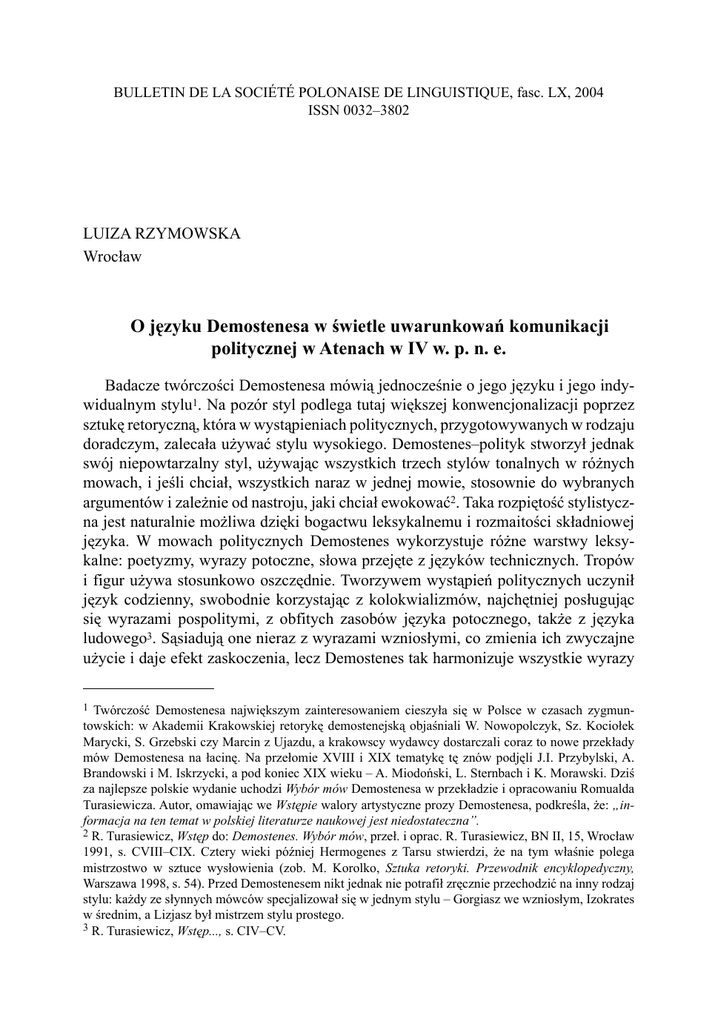 BULLETIN DE LA SOCIÉTÉ POLONAISE DE LINGUISTIQUE, fasc. LX, 2004 ISSN 0032–3802 LUIZA RZYMOWSKA Wrocław O języku Demostenesa w świetle uwarunkowań komunikacji politycznej w Atenach w IV w. p. n. e. Badacze twórczości Demostenesa mówią jednocześnie o jego języku i jego indywidualnym stylu1. Na pozór styl podlega tutaj większej konwencjonalizacji poprzez sztukę retoryczną, która w wystąpieniach politycznych, przygotowywanych w rodzaju doradczym, zalecała używać stylu wysokiego. Demostenes–polityk stworzył jednak swój niepowtarzalny styl, używając wszystkich trzech stylów tonalnych w różnych mowach, i jeśli chciał, wszystkich naraz w jednej mowie, stosownie do wybranych argumentów i zależnie od nastroju, jaki chciał ewokować2. Taka rozpiętość stylistyczna jest naturalnie możliwa dzięki bogactwu leksykalnemu i rozmaitości składniowej języka. W mowach politycznych Demostenes wykorzystuje różne warstwy leksykalne: poetyzmy, wyrazy potoczne, słowa przejęte z języków technicznych. Tropów i figur używa stosunkowo oszczędnie. Tworzywem wystąpień politycznych uczynił język codzienny, swobodnie korzystając z kolokwializmów, najchętniej posługując się wyrazami pospolitymi, z obfitych zasobów języka potocznego, także z języka ludowego3. Sąsiadują one nieraz z wyrazami wzniosłymi, co zmienia ich zwyczajne użycie i daje efekt zaskoczenia, lecz Demostenes tak harmonizuje wszystkie wyrazy 1 Twórczość Demostenesa największym zainteresowaniem cieszyła się w Polsce w czasach zygmuntowskich: w Akademii Krakowskiej retorykę demostenejską objaśniali W. Nowopolczyk, Sz. Kociołek Marycki, S. Grzebski czy Marcin z Ujazdu, a krakowscy wydawcy dostarczali coraz to nowe przekłady mów Demostenesa na łacinę. Na przełomie XVIII i XIX tematykę tę znów podjęli J.I. Przybylski, A. Brandowski i M. Iskrzycki, a pod koniec XIX wieku – A. Miodoński, L. Sternbach i K. Morawski. Dziś za najlepsze polskie wydanie uchodzi Wybór mów Demostenesa w przekładzie i opracowaniu Romualda Turasiewicza. Autor, omawiając we Wstępie walory artystyczne prozy Demostenesa, podkreśla, że: „informacja na ten temat w polskiej literaturze naukowej jest niedostateczna”. 2 R. Turasiewicz, Wstęp do: Demostenes. Wybór mów, przeł. i oprac. R. Turasiewicz, BN II, 15, Wrocław 1991, s. CVIII–CIX. Cztery wieki później Hermogenes z Tarsu stwierdzi, że na tym właśnie polega mistrzostwo w sztuce wysłowienia (zob. M. Korolko, Sztuka retoryki. Przewodnik encyklopedyczny, Warszawa 1998, s. 54). Przed Demostenesem nikt jednak nie potrafił zręcznie przechodzić na inny rodzaj stylu: każdy ze słynnych mówców specjalizował się w jednym stylu – Gorgiasz we wzniosłym, Izokrates w średnim, a Lizjasz był mistrzem stylu prostego. 3 R. Turasiewicz, Wstęp..., s. CIV–CV. 170 LUIZA RZYMOWSKA ze sobą, że wrażenie jednolitości stylu pozostaje niezakłócone. Mówca używa języka ludowego, ale mocne, obraźliwe słowa czy rubaszne obelgi to specyfika jego mów sądowych i polityczno–sądowych. Fraza demostenejska jest wprost niezwykle zróżnicowana strukturalnie4, kunsztownie rozbudowana, choć słynne są też bardzo krótkie frazy Demostenesa (najczęściej pytania lub polecenia), jak i zgrupowania krótkich, żywych fraz, oszałamiające słuchacza, intensywne i dramatyczne5. Mimo że w demostenejskim okresie retorycznym znajdujemy wiele imiesłowowych równoważników zdania, przeważają tu związki współrzędności, nie podrzędności, co pozwalało mówcy wydłużać zdania w sposób naturalny. Demostenes nadaje im nadzwyczajną regularność brzmieniową poprzez paralelizm konstrukcji, mnożenie anafor i zagęszczanie wyrazów w wyliczenia. Należy jednak w tym miejscu zwrócić uwagę na fakt, że ponieważ na tle greckiej tradycji retorycznej Demostenes wyodrębnia się jako mówca–polityk, oryginalność jego języka i stylu zawiera się poza rejestrem tropów i figur i poza specyfiką retorycznego okresu – pisał Turasiewicz, twierdząc, że właśnie dlatego „przeprowadzone analizy formalne jego mów zawodzą”6. W moim przekonaniu język mów Demostenesa uwierzytelnia jego wysoką kulturę polityczną, w mowach tych bowiem znalazły wyraz zarówno jego poglądy polityczne, jak i postawa wobec wartości o powszechnym charakterze – wobec bezpieczeństwa, wolności, niezależności, równości, honoru. W dojrzały sposób korzystając z wolności słowa, Demostenes realizował konkretne cele, wykazując, że odchodząca w cień demokracja ateńska jest narzędziem autentycznego samostanowienia – przynajmniej dla tych obywateli, którzy potrafili i mogli z tego korzystać. Wymaga zatem nowych badań bogate słownictwo polityczne Demostenesa, jego sposób porozumiewania się z Ateńczykami poprzez wartości wyrażane w języku i należące do sfery kultury politycznej, wspólnej mówcy i jego publiczności przynajmniej po części. W artykule tym chcę wskazać niektóre tylko własności języka i stylu Demostenesa – własności determinowane samą praktyką porozumiewania się na Pnyksie, wykształconą w warunkach demokracji bezpośredniej. Sądzę, że zachodzi związek pomiędzy kształtem językowo-stylistycznym przemówień Demostenesa a konkretnymi uwarunkowaniami komunikacji politycznej w Atenach w IV w. p.n.e. Te uwarunkowania wyznacza charakter posiedzeń Zgromadzenia Ludowego na Pnyksie, oryginalność zaś mówcy przejawiała się w tym, że dostosowując się do konwencji wystąpień przed Zgromadzeniem, potrafił wypracować indywidualne środki wyrazu. Komunikacją polityczną nazywam oczywiście ten rodzaj komunikacji społecznej – czyli procesu tworzenia i przekazywania informacji między podmiotami w społeczeństwie – który w warunkach demokratyczności systemu politycznego osiąga szczególnie wysoki poziom. Komunikacja polityczna w relacji nierównorzędnych podmiotów w systemie politycz