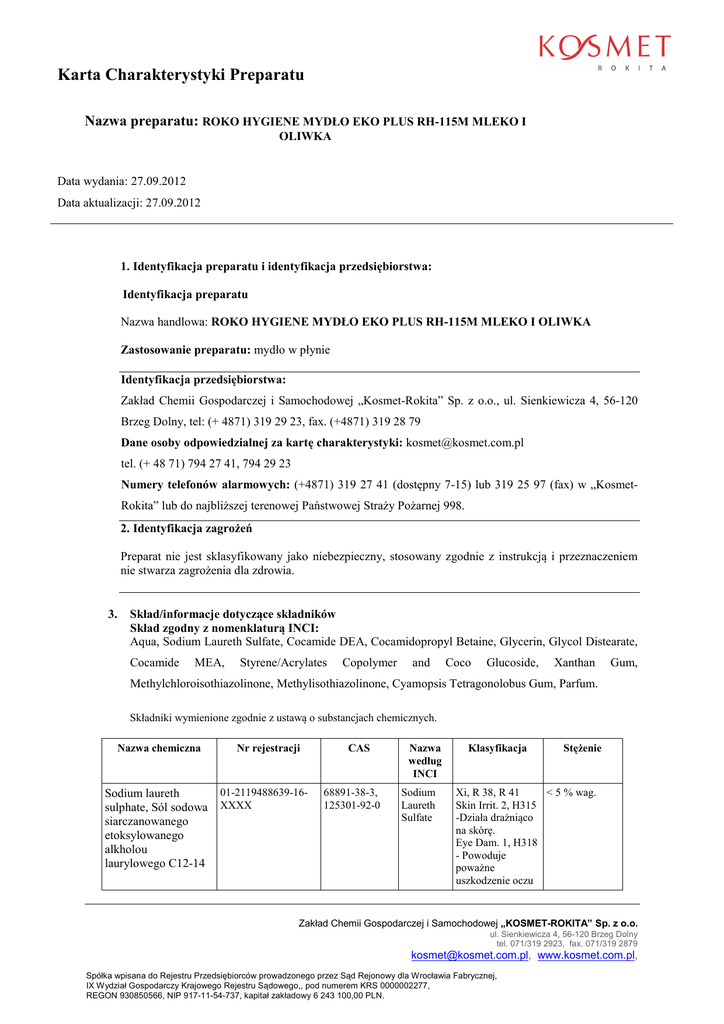 Karta Charakterystyki Preparatu Nazwa preparatu: ROKO HYGIENE MYDŁO EKO PLUS RH-115M MLEKO I OLIWKA Data wydania: 27.09.2012 Data aktualizacji: 27.09.2012 1. Identyfikacja preparatu i identyfikacja przedsiębiorstwa: Identyfikacja preparatu Nazwa handlowa: ROKO HYGIENE MYDŁO EKO PLUS RH-115M MLEKO I OLIWKA Zastosowanie preparatu: mydło w płynie Identyfikacja przedsiębiorstwa: Zakład Chemii Gospodarczej i Samochodowej „Kosmet-Rokita” Sp. z o.o., ul. Sienkiewicza 4, 56-120 Brzeg Dolny, tel: (+ 4871) 319 29 23, fax. (+4871) 319 28 79 Dane osoby odpowiedzialnej za kartę charakterystyki: [email protected] tel. (+ 48 71) 794 27 41, 794 29 23 Numery telefonów alarmowych: (+4871) 319 27 41 (dostępny 7-15) lub 319 25 97 (fax) w „KosmetRokita” lub do najbliższej terenowej Państwowej Straży Pożarnej 998. 2. Identyfikacja zagrożeń Preparat nie jest sklasyfikowany jako niebezpieczny, stosowany zgodnie z instrukcją i przeznaczeniem nie stwarza zagrożenia dla zdrowia. 3. Skład/informacje dotyczące składników Skład zgodny z nomenklaturą INCI: Aqua, Sodium Laureth Sulfate, Cocamide DEA, Cocamidopropyl Betaine, Glycerin, Glycol Distearate, Cocamide MEA, Styrene/Acrylates Copolymer and Coco Glucoside, Xanthan Gum, Methylchloroisothiazolinone, Methylisothiazolinone, Cyamopsis Tetragonolobus Gum, Parfum. Składniki wymienione zgodnie z ustawą o substancjach chemicznych. Nazwa chemiczna Sodium laureth sulphate, Sól sodowa siarczanowanego etoksylowanego alkholou laurylowego C12-14 Nr rejestracji 01-2119488639-16XXXX CAS 68891-38-3, 125301-92-0 Nazwa według INCI Sodium Laureth Sulfate Klasyfikacja Stężenie Xi, R 38, R 41 < 5 % wag. Skin Irrit. 2, H315 -Działa drażniąco na skórę. Eye Dam. 1, H318 - Powoduje poważne uszkodzenie oczu Zakład Chemii Gospodarczej i Samochodowej „KOSMET-ROKITA” Sp. z o.o. ul. Sienkiewicza 4, 56-120 Brzeg Dolny tel. 071/319 2923, fax. 071/319 2879 [email protected], www.kosmet.com.pl, Spółka wpisana do Rejestru Przedsiębiorców prowadzonego przez Sąd Rejonowy dla Wrocławia Fabrycznej, IX Wydział Gospodarczy Krajowego Rejestru Sądowego,, pod numerem KRS 0000002277, REGON 930850566, NIP 917-11-54-737, kapitał zakładowy 6 243 100,00 PLN. Karta Charakterystyki Preparatu Nazwa preparatu: ROKO HYGIENE MYDŁO EKO PLUS RH-115M MLEKO I OLIWKA Data wydania: 27.09.2012 Data aktualizacji: 27.09.2012 Dietanoloamid kwasów 01-2119490100-53oleju kokosowego C8- XXX 18 i C18 nienasyconego (Amides C8-18 (even numbered) and C18unsatd,., N,Nbis(hydroxyethyl) 931-329-6 Cocamide Xi, R 38, R 41, DEA H315 -Działa drażniąco na skórę. Eye Dam. 1, H318 - Powoduje poważne uszkodzenie oczu < 5 % wag. 4. Pierwsza pomoc Wdychanie Zapewnić dostęp świeżego powietrza. Kontakt ze skórą Spłukać wodą. Kontakt z okiem Zanieczyszczone oczy płukać natychmiast dużą ilością wody. Zapewnić pomoc okulisty. Połknięcie Podać poszkodowanemu do wypicia dużą ilość wody. Nie podejmować prób neutralizacji, nie prowokować wymiotów ( ryzyko pienienia). Zapewnić natychmiastową pomoc lekarską. 5. Postępowanie w przypadku pożaru Środki gaśnicze właściwe Stosować środki gaśnicze odpowiednie do otaczającego ognia. Środki gaśnicze niewłaściwe Nie są znane Szczególne zagrożenia Nie występują Informacje dodatkowe Preparat niepalny. W wysokich temperaturach może wydzielać się tlenek węgla i dwutlenek siarki. Środki ochrony indywidualnej dla strażaków Stosować maski przeciw gazowe z pochłaniaczem uniwersalnym. 6. Postępowanie w przypadku niezamierzonego uwolnienia do środowiska Indywidualne środki ostrożności Nie wdychać opar. Zakład Chemii Gospodarczej i Samochodowej „KOSMET-ROKITA” Sp. z o.o. ul. Sienkiewicza 4, 56-120 Brzeg Dolny tel. 071/319 2923, fax. 071/319 2879 [email protected], www.kosmet.com.pl, Spółka wpisana do Rejestru Przedsiębiorców prowadzonego przez Sąd Rejonowy dla Wrocławia Fabrycznej, IX Wydział Gospodarczy Krajowego Rejestru Sądowego,, pod numerem KRS 0000002277, REGON 930850566, NIP 917-11-54-737, kapitał zakładowy 6 243 100,00 PLN. Karta Charakterystyki Preparatu Nazwa preparatu: ROKO HYGIENE MYDŁO EKO PLUS RH-115M MLEKO I OLIWKA Data wydania: 27.09.2012 Data aktualizacji: 27.09.2012 Środowiskowe środki ostrożności Nie dopuścić do przedostania się do źródeł wody pitnej. Zlikwidować wyciek poprzez zamknięcie zaworów, uszczelnienie uszkodzonych opakowań. Procedura oczyszczania Rozlaną ciecz obwałować, a następnie wypompować. Pozostałość przysypać materiałem chłonnym i zebrać do zamykanych pojemników wraz z ziemią. Przeznaczyć do spalenia. Zanieczyszczoną powierzchnię dokładnie spłukać wodą. 7. Postępowanie z preparatem i jego magazynowanie Postępowanie z preparatem Unikać kontaktu i wdychania opar. Nie jeść i nie pić na stanowisku pracy. Przechowywanie Przechowywać w szczelnych opakowaniach. Wymagania dotyczące magazynów i opakowań Kryte magazyny. 8. Kontrola narażenia i środki ochrony indywidualnej Normatywy higieniczne Brak danych Ochrona dróg oddechowych Brak zagrożeń. Ochrona oczu i twarzy Nie wymaga się. Ochrona rąk Nie wymaga się. Inny sprzęt ochronny Nie wymaga się. Środki higieny Niezwłocznie zmienić zanieczyszczone ubranie. Po pracy umyć ręce i twarz. Zakład Chemii Gospodarczej i Samochodowej „KOSMET-ROKITA” Sp. z o.o. ul. Sienkiewicza 4, 56-120 Brzeg Dolny tel. 071/319 2923, fax. 071/319 2879 [email protected], www.kosmet.com.pl, Spółka wpisana do Rejestru Przedsiębiorców prowadzonego przez Sąd Rejonowy dla Wrocławia Fabrycznej, IX Wydział Gospodarczy Krajowego Rejestru Sądowego,, pod numerem KRS 0000002277, REGON 930850566, NIP 917-11-54-737, kapitał zakładowy 6 243 100,00 PLN. Karta Charakterystyki Preparatu Nazwa preparatu: ROKO HYGIENE MYDŁO EKO PLUS RH-115M MLEKO I OLIWKA Data wydania: 27.09.2012 Data aktualizacji: 27.09.2012 9. Własności fizyczne i chemiczne: Informacje ogólne: Postać Barwa Z
