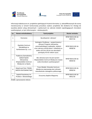 Informacja tabelaryczna nt. projektów spełniających kryteria formalne, tj. zakwalifikowanych do oceny merytorycznej w ramach konkursowej procedury wyboru projektów dla działania 8.1 Dostęp do wysokiej jakości usług zdrowotnych i społecznych (w zakresie działań zapobiegających chorobom cywilizacyjnym, w tym informacyjno – edukacyjnych). Lp. Nazwa wnioskodawcy Tytuł projektu Numer wniosku 1 Humaneo Żyj aktywnie i zdrowo! RPOP.08.01.00-160027/16 2 Opolskie Centrum Rehabilitacji w Korfantowie Sp. z o.o. Subregion Środkowy - wysportowany i zdrowy! Program zdrowotny przeciwdziałający nadwadze, otyłości oraz cukrzycy wśród dzieci i młodzieży w wieku od 6 do 18 lat oraz dorosłych pomiędzy 45-65 rokiem życia. RPOP.08.01.00-160028/16 3 Publiczny Samodzielny Zakład Opieki Zdrowotnej Wojewódzkie Centrum Medyczne w Opolu Bez zdrowia życie nie jest życiem Wojewódzkie Centrum Medyczne stawia czoła chorobom cywilizacyjnym! RPOP.08.01.00-160029/16 4 Majchrzyk Piotr TRANSMEDYK RATOWNICTWO Trans Medyk i Brzeskie Centrum Medyczne poprawiają stan zdrowia mieszkańców subregionu północnego RPOP.08.01.00-160030/16 5 Szpital Powiatowy im. Prałata J. Glowatzkiego Zrzucamy zbędne kilogramy RPOP.08.01.00-160031/16 Źródło: opracowanie własne.