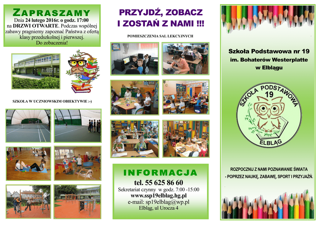 Zapraszamy Dnia 24 lutego 2016r. o godz. 17:00 na DRZWI OTWARTE. Podczas wspólnej zabawy pragniemy zapoznać Państwa z ofertą klasy przedszkolnej i pierwszej. Do zobaczenia! PRZYJDŹ, ZOBACZ I ZOSTAŃ Z NAMI !!! POMIESZCZENIA SAL LEKCYJNYCH Szkoła Podstawowa nr 19 im. Bohaterów Westerplatte w Elblągu SZKOŁA W UCZNIOWSKIM OBIEKTYWIE :-) informacja tel. 55 625 86 60 Sekretariat czynny w godz. 7:00 -15:00 www.ssp19elblag.hg.pl e-mail: [email protected] Elbląg, ul Urocza 4 ROZPOCZNIJ Z NAMI POZNAWANIE ŚWIATA - POPRZEZ NAUKĘ, ZABAWĘ, SPORT I PRZYJAŹŃ. Szanowni Rodzice, jeżeli Wasze dziecko dobrze radzi sobie w przedszkolu, jest bystre, ciekawe świata, zadaje pytania i chce iść do szkoły, dajcie mu Państwo szansę na szybszy rozwój. Pozwólcie Waszemu dziecku pójść o krok dalej.... OFERTA SZKOŁY: Zajęcia lekcyjne odbywają się w bogato wyposażonych w pomoce dydaktyczne oraz urządzenia multimedialne gabinetach (m.in.. komputery, projektory, tablice interaktywne, dwie skrzynie z przenośnymi nootebookami oraz wizualizery). Gabinety lekcyjne są odnowione, wyposażone w nowe meble, dostosowane do wzrostu dziecka ławki i krzesła. Podzielone są na dwie części, w jednej jest miejsce do rekreacji, wyposażone w pomoce dydaktyczne i zabawki, wpływające na rozwój psychofizyczny dzieci i pobudzające ich wyobraźnię. Oddziały rocznego przygotowania przedszkolnego mają wydzielone wejście do placówki, odrębną szatnię i toalety. Uczniowie klas I-III uczą się w pomieszczeniach w wyodrębnionej części szkoły. Czekają tu na przyszłych uczniów niezapomniane wrażenia. Nauka połączona z zabawą, radość odkrywania i wysoki poziom nauczania. Tworzymy atmosferę kreatywnego rozwoju, radości poznania i bezpieczeństwa. Jesteśmy szkołą przyjazną sześciolatkom, bogato zaopatrzoną w odpowiednie dla ich poziomu pomoce dydaktyczne oraz zatrudniającą kadrę pedagogiczną wykształconą i doświadczoną w pracy z najmłodszymi. SP 19 to szkoła, która uczy w nowoczesny i ciekawy sposób. Każdy uczeń może w niej rozwijać swoje zdolności i zainteresowania. Dzięki nowoczesnemu wyposażeniu i kwalifikacjom nauczycieli każdy uczeń poznaje radość zdobywania wiedzy i rozumienia świata. ZAJĘCIA DODATKOWE Oprócz zajęć obowiązkowych szkoła oferuje uczniom bogaty wybór zajęć pozalekcyjnych. Nasze dzieciaki mogą pogłębiać i zdobywać wiedzę oraz rozwijać zainteresowania w ramach dodatkowych zajęć: dziennikarskich, komputerowych, grupy recytatorsko-teatralnej, plastycznych, artystycznych, matematycznych i polonistycznych, przyrodniczych, czytelniczych i historycznych, ekologicznych, zajęć terapeutyczno-kompensacyjnych, wokalnomuzycznych oraz zajęć szachowych. W szkole aktywnie działają także Szkolne Koła Sportowe. Dzieci uczestniczą w zawodach sportowych, zajmując w nich czołowe miejsca. W 19-stce można, więc spędzać czas na sportowo i … nie można się nudzić. ZAPEWNIAMY: ŚWIETLICA SZKOLNA Po zajęciach edukacyjnych uczniowie uczestniczą w zajęciach świetlicowych. Zajęcia stymulują rozwój dziecka, jego zainteresowania i uzdolnienia. Świetlica czynna jest od godz. 6:30 do 16:30. W ramach zajęć świetlicowych uczniowie otrzymują fachową pomoc w odrabianiu lekcji. Z udziałem najmłodszych uczniów odbywają się różne przedsięwzięcia edukacyjne m. in. szeroka paleta zajęć dodatkowych: artystycznych, recytatorskich oraz muzycznych. Dzieci mają możliwość atrakcyjnego spędzenia czasu podczas licznych gier i zabaw ogólnorozwojowych. Bardzo dobry poziom nauczania. Wykwalifikowaną kadrę pedagogiczną. Bezpieczeństwo. Indywidualne podejście do ucznia. Opiekę pedagoga, psychologa i logopedy. 10-godzinną opiekę świetlicową (6:30-16:30). Możliwość korzystania z ciepłych posiłków . Opiekę pielęgniarki szkolnej. Przestronne i nowocześnie wyposażone gabinety. Salę komputerową z dostępem do Internetu. Bibliotekę z czytelnią. Dwie sale gimnastyczne (mała sala wyposażona w specjalistyczny sprzęt w ramach programu Radosna Szkoła) oraz halę sportową do gry w tenisa ziemnego. Nowoczesny plac zabaw wybudowany w ramach programu Radosna Szkoła. Dwa języki obce (j.angielski i j. niemiecki). Zajęcia na lodzie oraz basenie. Sklepik szkolny promujący zdrową żywność. Rodzicu masz wybór!
