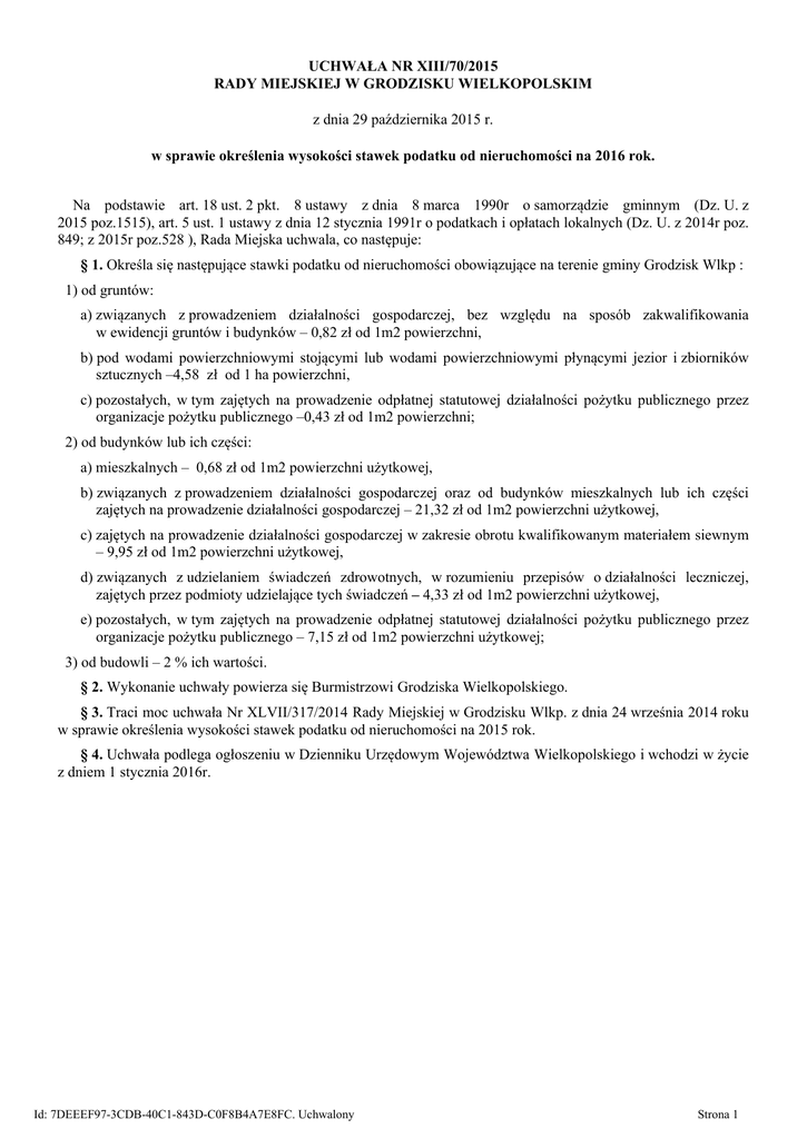 UCHWAŁA NR XIII/70/2015 RADY MIEJSKIEJ W GRODZISKU WIELKOPOLSKIM z dnia 29 października 2015 r. w sprawie określenia wysokości stawek podatku od nieruchomości na 2016 rok. Na podstawie art. 18 ust. 2 pkt. 8 ustawy z dnia 8 marca 1990r o samorządzie gminnym (Dz. U. z 2015 poz.1515), art. 5 ust. 1 ustawy z dnia 12 stycznia 1991r o podatkach i opłatach lokalnych (Dz. U. z 2014r poz. 849; z 2015r poz.528 ), Rada Miejska uchwala, co następuje: § 1. Określa się następujące stawki podatku od nieruchomości obowiązujące na terenie gminy Grodzisk Wlkp : 1) od gruntów: a) związanych z prowadzeniem działalności gospodarczej, bez względu na sposób zakwalifikowania w ewidencji gruntów i budynków – 0,82 zł od 1m2 powierzchni, b) pod wodami powierzchniowymi stojącymi lub wodami powierzchniowymi płynącymi jezior i zbiorników sztucznych –4,58 zł od 1 ha powierzchni, c) pozostałych, w tym zajętych na prowadzenie odpłatnej statutowej działalności pożytku publicznego przez organizacje pożytku publicznego –0,43 zł od 1m2 powierzchni; 2) od budynków lub ich części: a) mieszkalnych – 0,68 zł od 1m2 powierzchni użytkowej, b) związanych z prowadzeniem działalności gospodarczej oraz od budynków mieszkalnych lub ich części zajętych na prowadzenie działalności gospodarczej – 21,32 zł od 1m2 powierzchni użytkowej, c) zajętych na prowadzenie działalności gospodarczej w zakresie obrotu kwalifikowanym materiałem siewnym – 9,95 zł od 1m2 powierzchni użytkowej, d) związanych z udzielaniem świadczeń zdrowotnych, w rozumieniu przepisów o działalności leczniczej, zajętych przez podmioty udzielające tych świadczeń – 4,33 zł od 1m2 powierzchni użytkowej, e) pozostałych, w tym zajętych na prowadzenie odpłatnej statutowej działalności pożytku publicznego przez organizacje pożytku publicznego – 7,15 zł od 1m2 powierzchni użytkowej; 3) od budowli – 2 % ich wartości. § 2. Wykonanie uchwały powierza się Burmistrzowi Grodziska Wielkopolskiego. § 3. Traci moc uchwała Nr XLVII/317/2014 Rady Miejskiej w Grodzisku Wlkp. z dnia 24 września 2014 roku w sprawie określenia wysokości stawek podatku od nieruchomości na 2015 rok. § 4. Uchwała podlega ogłoszeniu w Dzienniku Urzędowym Województwa Wielkopolskiego i wchodzi w życie z dniem 1 stycznia 2016r. Id: 7DEEEF97-3CDB-40C1-843D-C0F8B4A7E8FC. Uchwalony Strona 1 UZASADNIENIE DO UCHWAŁY Nr XIII/70/2015 RADY MIEJSKIEJ W GRODZISKU WIELKPOLSKIM Z DNIA 29 października 2015r w sprawie określenia wysokości stawek podatku od nieruchomości na 2016 rok Na podstawie art. 5 ust.1 ustawy o podatkach i opłatach lokalnych ( tekst jednolity Dz.U. z 2014r., poz. 849 ze zmianami) Rada Gminy w drodze uchwały określa wysokość stawek podatku od nieruchomości, z tym, że stawki nie mogą przekroczyć rocznie górnych granic stawek kwotowych obwieszczanych przez ministra właściwego do spraw finansów publicznych. Stawki te corocznie podlegają zmianie na następny rok podatkowy z uwzględnieniem wskaźnika wzrostu cen detalicznych towarów i usług konsumpcyjnych. Po przeanalizowaniu stawek podatkowych podatku od nieruchomości z poszczególnych źródeł określonych w ustawie o podatkach i opłatach lokalnych stawki na rok 2016 proponuje się zwiększyć o 1,7% tj. o stopień planowanej w 2016r inflacji. Id: 7DEEEF97-3CDB-40C1-843D-C0F8B4A7E8FC. Uchwalony Strona 1