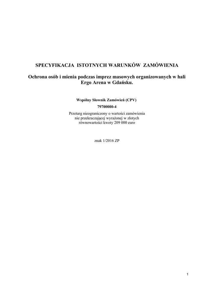 SPECYFIKACJA ISTOTNYCH WARUNKÓW ZAMÓWIENIA Ochrona osób i mienia podczas imprez masowych organizowanych w hali Ergo Arena w Gdańsku. Wspólny Słownik Zamówień (CPV) 79700000-4 Przetarg nieograniczony o wartości zamówienia nie przekraczającej wyrażonej w złotych równowartości kwoty 209 000 euro znak 1/2016 ZP 1 I. NAZWA (FIRMA) ORAZ ADRES ZAMAWIAJĄCEGO. Hala Gdańsk - Sopot Spółka z o.o. z siedzibą w Gdańsku przy Placu Dwóch Miast 1, wpisana do Rejestru przedsiębiorców KRS pod numerem 0000216102 prowadzonego przez Sąd Rejonowy Gdańsk-Północ w Gdańsku, legitymującym się numerem NIP 5832870317 oraz REGON 193078050 Tel. 58-76-72-101 fax 58-760-10-29 II. TRYB UDZIELENIA ZAMÓWIENIA. Przetarg nieograniczony na podstawie art. 39 ustawy z dnia 29 stycznia 2004 r. - Prawo zamówień publicznych (t.j. Dz. U. z 2015r. poz. 2164 ze zm.), zwanej dalej „ustawą”. III. OPIS PRZEDMIOTU ZAMÓWIENIA. 1. Świadczenie usług polegających na zabezpieczeniu imprezy masowej przez służby porządkowe i służby informacyjne w miejscu i w czasie ich trwania oraz na czas niezbędny do przygotowania obiektu na potrzeby imprezy : a) Koncert „THE SHOW A TRIBUTE TO ABBA”, 20 marca 2016 r. - w tym również w czasie niezbędnym do przygotowania obiektu do imprezy i demontażu urządzeń towarzyszących przebiegowi imprezy - zgodnie z Ustawą o bezpieczeństwie imprez masowych z dnia 20 marca 2009 roku oraz Rozporządzeniem RM z dnia 23 marca 2010 roku ws. wymogów jakie powinni spełnić kierownik ds. Bezpieczeństwa, służby porządkowe i służby informacyjne – w szacowanej maksymalnej ilości 400 rb/h; b) zapewnieniu min. 1 pracownika posiadającego niezbędne doświadczenie i kwalifikacje do pełnienia funkcji kierownika ds. bezpieczeństwa imprez masowych w rozumieniu przepisów Ustawy o bezpieczeństwie imprez masowych oraz zgodnie z Rozporządzeniem RM z dnia 23 marca 2010 roku ws. wymogów jakie powinni spełnić kierownik ds. Bezpieczeństwa, służby porządkowe i służby informacyjne; c) zapewnieniu maksymalnie 20 m.b. tzw. ciężkich płotów koncertowych odgradzających strefę sceny od publiczności na potrzeby powyższej imprezy masowej wraz z zapewnieniem pracowników do rozłożenia i złożenia płotów w terminie wskazanym przez Zamawiającego – maksimum i cykl. Za jeden cykl należy rozumieć rozłożenie i złożenie płotów. 2. Zamawiający nie gwarantuje wykonania zamówienia w pełnej ilości rb/h w okresie związania umową a rozliczenie końcowe nastąpi na podstawie faktycznej ilości przepracowanych rb/h wynikających ze zlecenia. 3. Wykonawca dysponuje conajmniej 15 profesjonalnymi radiotelefonami o mocy powyżej 1W, których działanie zapewni łączność pomiędzy pracownikami Wykonawcy na terenie Hali Ergo Arena; 4. Wymagania osobowe: Wykonawca dysponuje conajmniej 60 pracownikami ochrony jednolicie oznakowanymi oraz przeszkolonymi zgodnie z obowiązującymi przepisami w zakresie członków służby porządkowej i służby informacyjnej; 5. Wymagania w zakresie ubioru pracowników Wykonawcy : - ubiór czysty, schludny; - długie spodnie koloru ciemnego; - ubiór – koszulki typu polo lub inny uzgodniony i zaakceptowany przez Zamawiającego; - w zależności od pory roku wyposażenie pracowników w odpowiedni ubiór wierzchni pozwalający na realizację zadań na otwartej przestrzeni; - Zamawiający nie dopuszcza możliwości ubioru pracowników w umundurowanie typu roboczego lub polowego ( kombinezony, uniformy itp. ); 6. Zgłoszenie zapotrzebowania na konkretną ilość pracowników niezbędną do zabezpieczenia imprezy przesyłane będzie drogą elektroniczną na wskazany przez Wykonawcę adres email w terminie do 7 dni przed dniem rozpoczęcia realizacji usługi dla danej imprezy z określeniem daty realizacji usługi, godziny rozpoczęcia i przewidywanej godziny zakończenia oraz niezbędnej ilości członków służby porządkowej i informacyjnej; 7. Zamawiający lub upoważniona przez niego osoba zastrzega sobie możliwość wydawania wiążących poleceń pracownikom ochrony w uzasadnionych przypadkach wynikających ze 2 stwierdzonych nieprawidłowości, konieczności reakcji służby ochrony na przypadki naruszenia porządku prawnego oraz konieczności korekty sposobu rozmieszczenia służb ochrony w trakcie realizacji zamówienia; 8. Obowiązki pracowników ochrony skierowanych do realizacji zadań przez Wykonawcę : a) W okresie przygotowania obiektu i demontażu po zakończeniu imprezy : - sprawdzanie uprawnień do wjazdu na wyznaczone parkingi zlokalizowane w obrębie obiektu; - dbałość o zapewnienie drożności przejazdu w obrębie parkingów P0 i P1; - sprawdzanie uprawnień do wejścia do obiektu; - sprawdzanie zawartości ładunku i wnoszonych przedmiotów, w tym żywności i napojów zgodnie z regulaminem obiektu; - wydawanie przepustek, akredytacji, identyfikatorów i innych dokumentów stanowiących podstawę do wjazdu lub wejścia do obiektu; - dbałość o mienie pozostające w obiekcie; - wykonywanie bieżących poleceń wydawanych przez uprawnionego pracownika Zamawiającego; b) W okresie udostępnienia obiektu dla publiczności w trakcie trwania imprezy masowej – obowiązki jak pkt „a” ponadto : - realizacja zadań i czynności ujętych szczegółowo w Ustawie o bezpieczeństwie imprez masowych oraz Rozporządzeniu RM z dnia 23 marca 2010 roku ws. wymogów jakie powinni spełnić kierownik ds. Bezpieczeństwa, służby porządkowe i służby informacyjne; 9. Wymagania dot. sposobu realizacji zamówienia : a) Zamawiający zastrzega sobie prawo do sporządzania przez uprawnionego pracownika Planu Ochrony Imprezy Masowej dla poszczególnych imprez, który to Plan zawierać będzie wytyczne w zakresie zabezpieczenia imprezy z uwzględnieniem jej charakteru i przyjętych rozwiązań natury organizacyjnej; b) Wszyscy pracownicy Wykonawcy powinni przejawiać : b.1. wysoką kulturę osobistą; b.2. komunikatywnoś