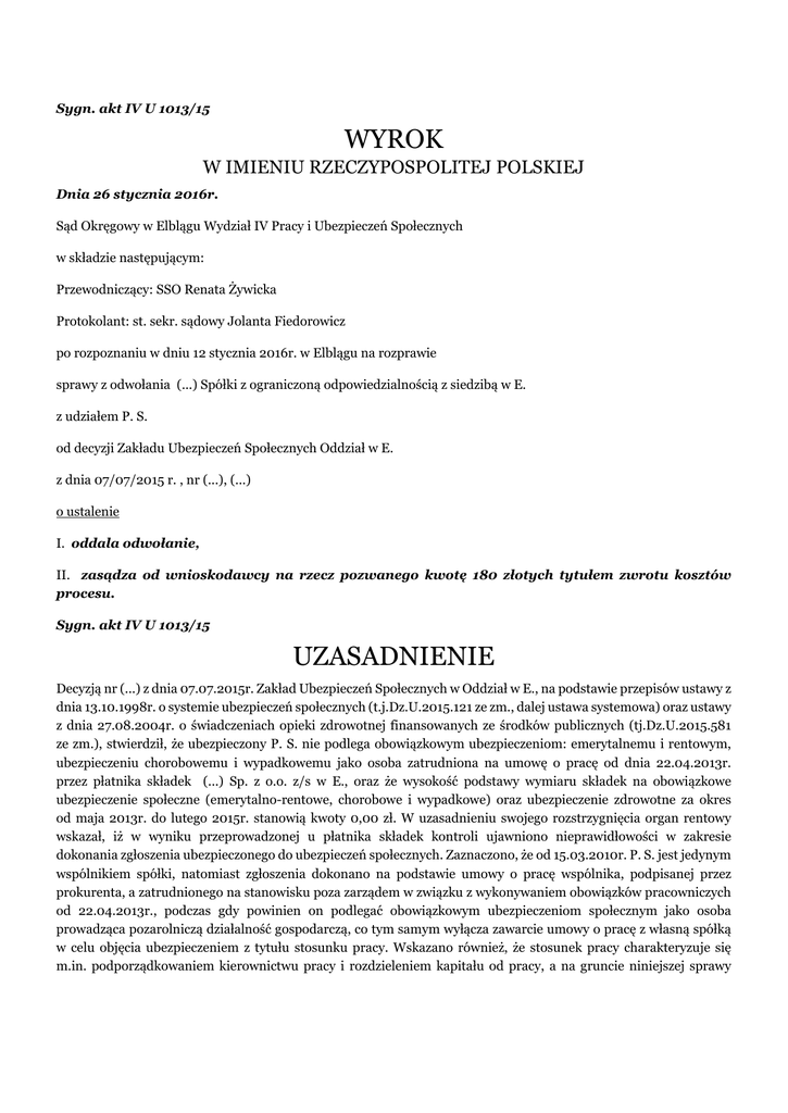 Sygn. akt IV U 1013/15 WYROK W IMIENIU RZECZYPOSPOLITEJ POLSKIEJ Dnia 26 stycznia 2016r. Sąd Okręgowy w Elblągu Wydział IV Pracy i Ubezpieczeń Społecznych w składzie następującym: Przewodniczący: SSO Renata Żywicka Protokolant: st. sekr. sądowy Jolanta Fiedorowicz po rozpoznaniu w dniu 12 stycznia 2016r. w Elblągu na rozprawie sprawy z odwołania (...) Spółki z ograniczoną odpowiedzialnością z siedzibą w E. z udziałem P. S. od decyzji Zakładu Ubezpieczeń Społecznych Oddział w E. z dnia 07/07/2015 r. , nr (...), (...) o ustalenie I. oddala odwołanie, II. zasądza od wnioskodawcy na rzecz pozwanego kwotę 180 złotych tytułem zwrotu kosztów procesu. Sygn. akt IV U 1013/15 UZASADNIENIE Decyzją nr (...) z dnia 07.07.2015r. Zakład Ubezpieczeń Społecznych w Oddział w E., na podstawie przepisów ustawy z dnia 13.10.1998r. o systemie ubezpieczeń społecznych (t.j.Dz.U.2015.121 ze zm., dalej ustawa systemowa) oraz ustawy z dnia 27.08.2004r. o świadczeniach opieki zdrowotnej finansowanych ze środków publicznych (tj.Dz.U.2015.581 ze zm.), stwierdził, że ubezpieczony P. S. nie podlega obowiązkowym ubezpieczeniom: emerytalnemu i rentowym, ubezpieczeniu chorobowemu i wypadkowemu jako osoba zatrudniona na umowę o pracę od dnia 22.04.2013r. przez płatnika składek (...) Sp. z o.o. z/s w E., oraz że wysokość podstawy wymiaru składek na obowiązkowe ubezpieczenie społeczne (emerytalno-rentowe, chorobowe i wypadkowe) oraz ubezpieczenie zdrowotne za okres od maja 2013r. do lutego 2015r. stanowią kwoty 0,00 zł. W uzasadnieniu swojego rozstrzygnięcia organ rentowy wskazał, iż w wyniku przeprowadzonej u płatnika składek kontroli ujawniono nieprawidłowości w zakresie dokonania zgłoszenia ubezpieczonego do ubezpieczeń społecznych. Zaznaczono, że od 15.03.2010r. P. S. jest jedynym wspólnikiem spółki, natomiast zgłoszenia dokonano na podstawie umowy o pracę wspólnika, podpisanej przez prokurenta, a zatrudnionego na stanowisku poza zarządem w związku z wykonywaniem obowiązków pracowniczych od 22.04.2013r., podczas gdy powinien on podlegać obowiązkowym ubezpieczeniom społecznym jako osoba prowadząca pozarolniczą działalność gospodarczą, co tym samym wyłącza zawarcie umowy o pracę z własną spółką w celu objęcia ubezpieczeniem z tytułu stosunku pracy. Wskazano również, że stosunek pracy charakteryzuje się m.in. podporządkowaniem kierownictwu pracy i rozdzieleniem kapitału od pracy, a na gruncie niniejszej sprawy ubezpieczony podlegał swojemu własnemu kierownictwu, ponosząc jednocześnie ryzyko gospodarcze związane z wykonywaniem pracy. W odwołaniu od decyzji płatnik składek wniósł o jej uchylenie. W uzasadnieniu spółka podniosła, iż ważność zawartej umowy o pracę nie była kwestionowana, a wręcz stwierdzono, że umowa wygasła, co mogło dotyczyć jedynie umowy zawartej. Zaznaczono również, że ze stanowiska judykatury wynika, iż praca członka zarządu na rzecz spółki jest możliwa przy wykonywaniu czynności niewiązanych z zarządzaniem spółką, a właśnie takie czynności w ramach zawartego stosunku pracy wykonywał ubezpieczony. Płatnik składek wskazał, że skoro zawarto umowę o pracę to zatrudnienie nie było fikcyjne, o czym świadczy przedłożona karta opisu pracy, brak jest podstaw do utrzymania zaskarżonej decyzji w mocy. W odpowiedzi na odwołanie Zakład Ubezpieczeń Społecznych wniósł o jego oddalenie. W uzasadnieniu organ rentowy powtórzył argumentację podnoszoną w zaskarżonej decyzji, jak również wskazał, że zawarcie umowy o pracę ze spółką reprezentowaną przez prokurenta ustanowionego przez jedynego członka zarządu, będącego jednocześnie stroną umowy nie mogło mieć wpływu na sytuację prawną ubezpieczonego, gdyż umowa taka z mocy samego prawa jest bezwzględnie nieważna. W piśmie procesowym datowanym na 08.01.2016r. płatnik składek podtrzymał twierdzenia wyrażone w odwołaniu od decyzji i potwierdził fakt świadczenia pracy przez P. S. na stanowisku kierownika zarządzającego. W piśmie procesowym datowanym na 05.01.2016r. P. S. nie zgodził się ze stanowiskiem organu rentowego, wyrażonym w decyzji i odpowiedzi na odwołanie, podnosząc, że nawet przy uznaniu, że członek jednoosobowego zarządu spółki nie może upoważnić prokurenta do zawarcia umowy o pracę ze sobą, to na gruncie przedmiotowej sprawy doszło do dorozumianego nawiązania stosunku pracy. Do pisma dołączono dokumentację mającą potwierdzić fakt wykonywania przez ubezpieczonego pracy na rzecz spółki na stanowisku kierownika zarządzającego. Sąd ustalił i zważył, co następuje: P. S. od 15.03.2010r., tj. od dnia nabycia wszystkich udziałów, prowadzi działalność gospodarczą jako wspólnik jednoosobowej spółki z o.o. (...) z/s w E.. Nie został on z tego tytułu zgłoszony do ubezpieczeń społecznych. Od 22.04.2013r. ubezpieczony został zgłoszony do obowiązkowych ubezpieczeń społecznych jako pracownik zatrudniony w oparciu o umowę o pracę na stanowisku kierownika zarządzającego. Umowa o pracę w imieniu spółki została podpisana przez prokurenta B. S., będącego synem P. S.. Od 07.04 do 13.04.2015 Zakład Ubezpieczeń Społecznych przeprowadził kontrolę okresową u płatnika składek mającą na celu ustalenie prawidłowości i rzetelności obliczania składek na ubezpieczenia społeczne i innych składek, ustalenie uprawnień do świadczeń z ubezpieczeń społecznych i ich wypłacanie oraz rozliczanie z tego tytułu, ustalenie prawidłowości i terminowości opracowywania wniosków o świadczenia emerytalne i rentowe, wystawianie zaświadczeń lub zgłaszanie danych dla celów ubezpieczeń społecznych. Po zapoznaniu z protokołem kontroli płatnik składek wniósł zastrzeżenia, przedkładając kartę opisu pracy na stanowisku kierownika zarządzającego. Głównym przedmiotem faktycznej działalności nieruchomości. spółki (...)