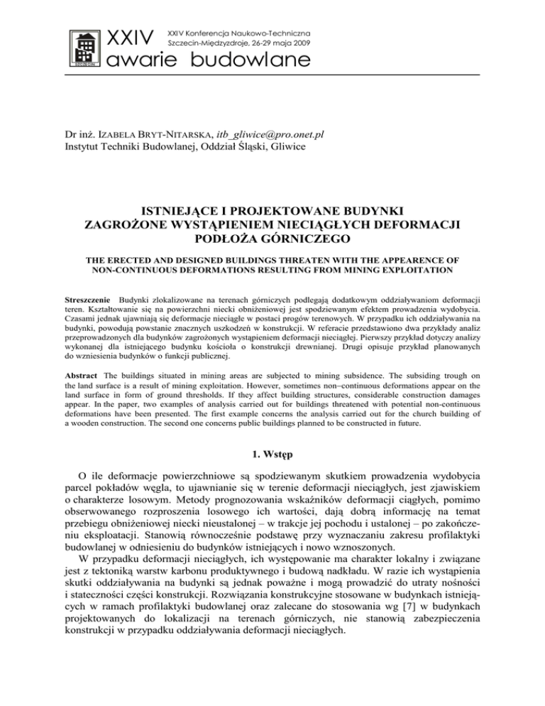 XXIV awarie budowlane XXIV Konferencja Naukowo-Techniczna Szczecin-Międzyzdroje, 26-29 maja 2009 Dr inŜ. IZABELA BRYT-NITARSKA, [email protected] Instytut Techniki Budowlanej, Oddział Śląski, Gliwice ISTNIEJĄCE I PROJEKTOWANE BUDYNKI ZAGROśONE WYSTĄPIENIEM NIECIĄGŁYCH DEFORMACJI PODŁOśA GÓRNICZEGO THE ERECTED AND DESIGNED BUILDINGS THREATEN WITH THE APPEARENCE OF NON-CONTINUOUS DEFORMATIONS RESULTING FROM MINING EXPLOITATION Streszczenie Budynki zlokalizowane na terenach górniczych podlegają dodatkowym oddziaływaniom deformacji teren. Kształtowanie się na powierzchni niecki obniŜeniowej jest spodziewanym efektem prowadzenia wydobycia. Czasami jednak ujawniają się deformacje nieciągłe w postaci progów terenowych. W przypadku ich oddziaływania na budynki, powodują powstanie znacznych uszkodzeń w konstrukcji. W referacie przedstawiono dwa przykłady analiz przeprowadzonych dla budynków zagroŜonych wystąpieniem deformacji nieciągłej. Pierwszy przykład dotyczy analizy wykonanej dla istniejącego budynku kościoła o konstrukcji drewnianej. Drugi opisuje przykład planowanych do wzniesienia budynków o funkcji publicznej. Abstract The buildings situated in mining areas are subjected to mining subsidence. The subsiding trough on the land surface is a result of mining exploitation. However, sometimes non−continuous deformations appear on the land surface in form of ground thresholds. If they affect building structures, considerable construction damages appear. In the paper, two examples of analysis carried out for buildings threatened with potential non-continuous deformations have been presented. The first example concerns the analysis carried out for the church building of a wooden construction. The second one concerns public buildings planned to be constructed in future. 1. Wstęp O ile deformacje powierzchniowe są spodziewanym skutkiem prowadzenia wydobycia parcel pokładów węgla, to ujawnianie się w terenie deformacji nieciągłych, jest zjawiskiem o charakterze losowym. Metody prognozowania wskaźników deformacji ciągłych, pomimo obserwowanego rozproszenia losowego ich wartości, dają dobrą informację na temat przebiegu obniŜeniowej niecki nieustalonej – w trakcje jej pochodu i ustalonej – po zakończeniu eksploatacji. Stanowią równocześnie podstawę przy wyznaczaniu zakresu profilaktyki budowlanej w odniesieniu do budynków istniejących i nowo wznoszonych. W przypadku deformacji nieciągłych, ich występowanie ma charakter lokalny i związane jest z tektoniką warstw karbonu produktywnego i budową nadkładu. W razie ich wystąpienia skutki oddziaływania na budynki są jednak powaŜne i mogą prowadzić do utraty nośności i stateczności części konstrukcji. Rozwiązania konstrukcyjne stosowane w budynkach istniejących w ramach profilaktyki budowlanej oraz zalecane do stosowania wg [7] w budynkach projektowanych do lokalizacji na terenach górniczych, nie stanowią zabezpieczenia konstrukcji w przypadku oddziaływania deformacji nieciągłych. Geotechnika W przypadku moŜliwości powstania deformacji nieciągłej, która moŜe oddziaływać na budynek istniejący lub projektowany, konieczna jest indywidualna ocena poziomu zagroŜenia konstrukcji i sposobu ograniczenia niekorzystnego oddziaływania tej deformacji. W takiej sytuacji podstawę działań z zakresu profilaktyki budowlanej stanowi szczegółowa opinia geologiczno-górnicza. W zakresie tej opinii musi znajdować się równieŜ ocena poziomu zagroŜenia powierzchni wystąpieniem deformacji nieciągłej. PoniewaŜ brak jest metod matematycznych słuŜących do prognozowania liniowych deformacji nieciągłych ocenę taka przeprowadza się na podstawie skutków eksploatacji dokonanej oraz analizy obliczeniowej wskaźników deformacji wynikających z wybranych juŜ parcel eksploatacyjnych. Jak wynika z obserwacji powstawanie na powierzchni deformacji w formie progów terenowych związane jest z prowadzeniem eksploatacji górniczej w sąsiedztwie stref zaburzeń tektonicznych karbonu lub prowadzenia eksploatacji w kilku pokładach do jednej, wspólnej krawędzi. Zwykle deformacje liniowe występują w postaci progów – stopni, o wysokości do kilkudziesięciu centymetrów, które mogą przebiegać na długości od kilku do kilkudziesięciu metrów. Występują jako deformacje pojedyncze lub w grupie kilku równoległych progów. W warunkach prowadzenia eksploatacji górniczej w strefach uskoków występują dodatkowo anomalie w rozkładzie wskaźników ciągłych deformacji powierzchni. W referacie przedstawiono dwa przypadki zagroŜenia budynków oddziaływaniem deformacji nieciągłej. Pierwszy dotyczy zabytkowego budynku kościoła w sąsiedztwie, którego wystąpił próg terenowy. Drugi, to przykład analizy zagroŜenia wystąpienia deformacji nieciągłych w miejscu lokalizacji planowanych do wzniesienia budynków o funkcji publicznej. W obu przypadkach celem podjętych działań jest zapobieŜenie powstania stanów awaryjnych w konstrukcji budynków. 2. Budynek kościoła zagroŜony progiem terenowym 2.1. Opis konstrukcji Wzniesiony w 1737 r. drewniany budynek kościoła w 1938 r. przeniesiono w miejsce jego obecnej lokalizacji. Jest to obiekt zabytkowy. Gabarytowe wymiary rzutu poziomego budynku wynoszą ok. 17,0 m×30,0 m (rys.1). Kościół wzniesiono w układzie jednonawowym z trójbocznie zamkniętym prezbiterium i przeciwległą kwadratową wieŜą o wysokości 20 m z wejściem głównym. Ściany budynku wykonane są w konstrukcji drewnianej – zrębowej. W nawie, prezbiterium i kaplicy znajdują się pozorne sklepienia kolebkowe i dach w konstrukcji drewnianej kryty gontem. W poziomie górnych zrębów ścian podłuŜnych, załoŜone są cztery poprzeczne ściągi stalowe – dwa w części prezbiterialnej i dwa w nawie. W 1996 r. jako zabezpieczenie na wpływy eksploatacji górniczej wg dokumentacji [1] pod budynkiem wykonano monolityczną przeponę o grubo