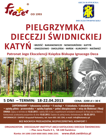 AKCJA KATOLICKA od 1993 DIECEZJI ŚWIDNICKIEJ Pielgrzymka DiecezJI ŚWIDNICKIEJ KATYŃ · BRZEŚĆ · BARANOWICZE · NOWOGRÓDEK · KATYŃ · GNIEZDOWO · SMOLEŃSK · MIŃSK · KUROPATY · NIEŚWIEŻ Patronat Jego Ekscelencji Księdza Biskupa Ignacego Deca 5 dni – TERMIN: 18-22.04.2013 CENA: 2200 zł + 30 € ZAPEWNIAMY • luksusowy autokar • 4 noclegi • 4 śniadania, 4 obiadokolacje • opiekę pilota - przewodnika • opiekę kapłana • pełne ubezpieczenie • wizy do Białorusi i Rosji UWAGI: Zapisy w terminie do 15.02.2013 z wpłatą 500 zł oraz z wypełnionymi wnioskami wizowymi do Rosji oraz na Białoruś. Konieczność przekazania paszportów do dnia 15.02.2013. Dopłata do pełnej kwoty złotówkowej do 18.03.2013. INFORMACJE I ZAPISY: Krzysztof Kotowicz, tel. kom 601 181 334, e-mail: [email protected] BEZ NOCNYCH PRZEJAZDÓW, BEZPIECZEŃSTWO, KOMFORT ! ORGANIZATOR: DIECEZJALNY INSTYTUT AKCJI KATOLICKIEJ DIECEZJI ŚWIDNICKIEJ – Plac Jana Pawła II 1, 58-100 Świdnica Konto: 84 1090 2369 0000 0001 0486 2591 www.diak.swidnica.pl AKCJA KATOLICKA od 1993 DIECEZJI ŚWIDNICKIEJ Pielgrzymka DiecezJI ŚWIDNICKIEJ KATYŃ 5 dni – TERMIN: 18-22.04.2013 CENA: 2200 zł + 30 € DZIEŃ 1 Wyjazd ze Świdnicy we wczesnych godzinach porannych. Przejazd do Brześcia. Nawiedzimy kościół katolicki pw. Podwyższenia Krzyża Świętego w stylu klasycystycznym. We wnętrzu kościoła umieszczony jest słynny obraz Matki Boskiej Ocalenia w sukience z pozłacanego srebra – kopia wizerunku z rzymskiej bazyliki Matki Bożej Większej. Zobaczymy także Twierdzę Brzeską. Następnie udamy się na obiadokolację i nocleg w okolice Baranowicz. DZIEŃ 2 Śniadanie. Przejazd do Nowogródka – pierwszej stolicy dawnego Wielkiego Księstwa Litewskiego. Zwiedzanie miasta: Dworek – Muzeum Adama Mickiewicza, kościół farny pw. Przemienienia Pańskiego (miejsce chrztu św. poety), kościół pw. św. Michała Archanioła, Kopiec Mickiewicza, ruiny zamku Książąt Litewskich na Górze Zamkowej. Przejazd na obiadokolację i nocleg w okolice Orszy. DZIEŃ 3 Śniadanie, po którym przejazd do Katynia. Udamy się na polski cmentarz wojenny, na którym w sześciu mogiłach zbiorowych i dwóch generalskich spoczywa 4 412 oficerów wojska polskiego, rozstrzelanych w 1940 roku. Msza święta. Następnie udamy się do Gniezdowa, stacji kolejowej dokąd przybywały transporty jeńców polskich z obozu w Kozielsku. Przejazd do Smoleńska – udamy się w kierunku lotniska – miejsca tragicznej katastrofy samolotu z uczestnikami delegacji Rzeczypospolitej Polskiej zmierzającej na obchody 70 rocznicy zbrodni katyńskiej. Powrót na obiadokolację i nocleg. DZIEŃ 4 Śniadanie, po którym przejazd do Mińska. Zobaczymy kościół pod wezwaniem św. Szymona i Heleny, Ratusz, dawny zespół klasztorny bernardynek, obecnie sobór prawosławny. Przejazd na obrzeża Mińska, do miejscowości Kuropaty – miejsca śmierci i pochówku tysięcy ofiar stalinowskiego terroru. Przejazd na obiadokolację i nocleg w okolice Baranowicz. DZIEŃ 5 Śniadanie, przejazd do Nieświeża. Zobaczymy zespół zamkowo-pałacowy – dawną rezydencję Radziwiłłów wpisaną na listę UNESCO, pojezuicki wczesnobarokowy kościół farny pw. Bożego Ciała z XVI wieku – pierwszy barokowy kościół w Polsce wybudowany na wzór rzymskiego kościoła Il Gesu. W podziemiach fary spoczywają ciała 102 Radziwiłłów. Zobaczymy również ratusz z sukiennicami. W drodze powrotnej do Świdnicy obiad pożegnalny w późnych godzinach wieczornych. ORGANIZATOR: DIECEZJALNY INSTYTUT AKCJI KATOLICKIEJ DIECEZJI ŚWIDNICKIEJ – Plac Jana Pawła II 1, 58-100 Świdnica Konto: 84 1090 2369 0000 0001 0486 2591 www.diak.swidnica.pl