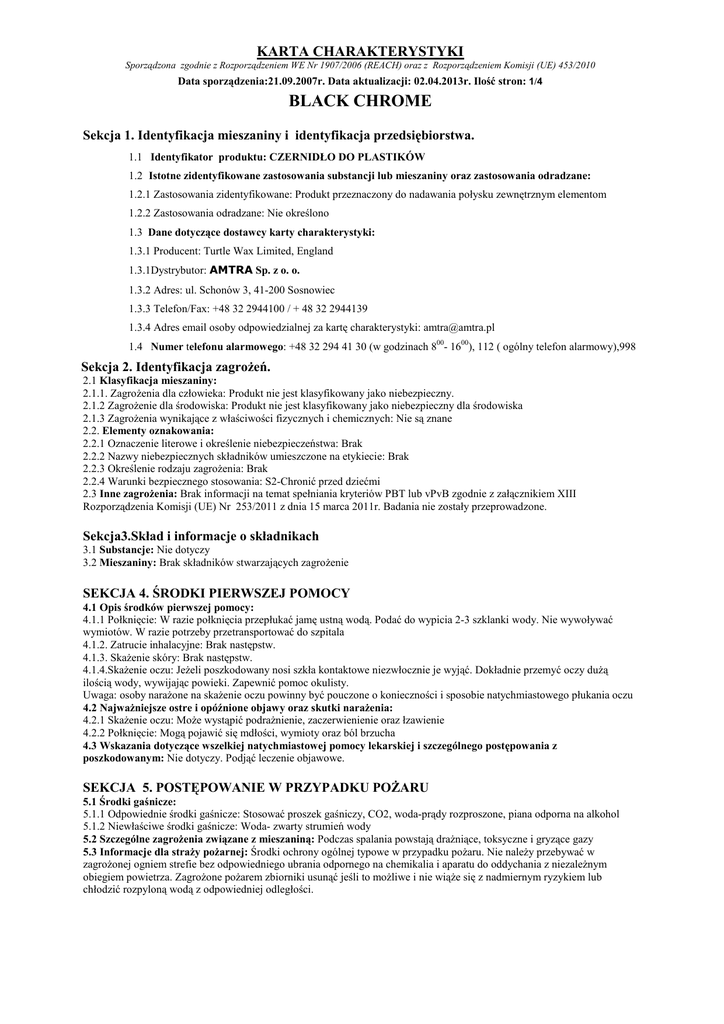 KARTA CHARAKTERYSTYKI Sporządzona zgodnie z Rozporządzeniem WE Nr 1907/2006 (REACH) oraz z Rozporządzeniem Komisji (UE) 453/2010 Data sporządzenia:21.09.2007r. Data aktualizacji: 02.04.2013r. Ilość stron: 1/4 BLACK CHROME Sekcja 1. Identyfikacja mieszaniny i identyfikacja przedsiębiorstwa. 1.1 Identyfikator produktu: CZERNIDŁO DO PLASTIKÓW 1.2 Istotne zidentyfikowane zastosowania substancji lub mieszaniny oraz zastosowania odradzane: 1.2.1 Zastosowania zidentyfikowane: Produkt przeznaczony do nadawania połysku zewnętrznym elementom 1.2.2 Zastosowania odradzane: Nie określono 1.3 Dane dotyczące dostawcy karty charakterystyki: 1.3.1 Producent: Turtle Wax Limited, England 1.3.1Dystrybutor: AMTRA Sp. z o. o. 1.3.2 Adres: ul. Schonów 3, 41-200 Sosnowiec 1.3.3 Telefon/Fax: +48 32 2944100 / + 48 32 2944139 1.3.4 Adres email osoby odpowiedzialnej za kartę charakterystyki: [email protected] 1.4 Numer telefonu alarmowego: +48 32 294 41 30 (w godzinach 800- 1600), 112 ( ogólny telefon alarmowy),998 Sekcja 2. Identyfikacja zagrożeń. 2.1 Klasyfikacja mieszaniny: 2.1.1. Zagrożenia dla człowieka: Produkt nie jest klasyfikowany jako niebezpieczny. 2.1.2 Zagrożenie dla środowiska: Produkt nie jest klasyfikowany jako niebezpieczny dla środowiska 2.1.3 Zagrożenia wynikające z właściwości fizycznych i chemicznych: Nie są znane 2.2. Elementy oznakowania: 2.2.1 Oznaczenie literowe i określenie niebezpieczeństwa: Brak 2.2.2 Nazwy niebezpiecznych składników umieszczone na etykiecie: Brak 2.2.3 Określenie rodzaju zagrożenia: Brak 2.2.4 Warunki bezpiecznego stosowania: S2-Chronić przed dziećmi 2.3 Inne zagrożenia: Brak informacji na temat spełniania kryteriów PBT lub vPvB zgodnie z załącznikiem XIII Rozporządzenia Komisji (UE) Nr 253/2011 z dnia 15 marca 2011r. Badania nie zostały przeprowadzone. Sekcja3.Skład i informacje o składnikach 3.1 Substancje: Nie dotyczy 3.2 Mieszaniny: Brak składników stwarzających zagrożenie SEKCJA 4. ŚRODKI PIERWSZEJ POMOCY 4.1 Opis środków pierwszej pomocy: 4.1.1 Połknięcie: W razie połknięcia przepłukać jamę ustną wodą. Podać do wypicia 2-3 szklanki wody. Nie wywoływać wymiotów. W razie potrzeby przetransportować do szpitala 4.1.2. Zatrucie inhalacyjne: Brak następstw. 4.1.3. Skażenie skóry: Brak następstw. 4.1.4.Skażenie oczu: Jeżeli poszkodowany nosi szkła kontaktowe niezwłocznie je wyjąć. Dokładnie przemyć oczy dużą ilością wody, wywijając powieki. Zapewnić pomoc okulisty. Uwaga: osoby narażone na skażenie oczu powinny być pouczone o konieczności i sposobie natychmiastowego płukania oczu 4.2 Najważniejsze ostre i opóźnione objawy oraz skutki narażenia: 4.2.1 Skażenie oczu: Może wystąpić podrażnienie, zaczerwienienie oraz łzawienie 4.2.2 Połknięcie: Mogą pojawić się mdłości, wymioty oraz ból brzucha 4.3 Wskazania dotyczące wszelkiej natychmiastowej pomocy lekarskiej i szczególnego postępowania z poszkodowanym: Nie dotyczy. Podjąć leczenie objawowe. SEKCJA 5. POSTĘPOWANIE W PRZYPADKU POŻARU 5.1 Środki gaśnicze: 5.1.1 Odpowiednie środki gaśnicze: Stosować proszek gaśniczy, CO2, woda-prądy rozproszone, piana odporna na alkohol 5.1.2 Niewłaściwe środki gaśnicze: Woda- zwarty strumień wody 5.2 Szczególne zagrożenia związane z mieszaniną: Podczas spalania powstają drażniące, toksyczne i gryzące gazy 5.3 Informacje dla straży pożarnej: Środki ochrony ogólnej typowe w przypadku pożaru. Nie należy przebywać w zagrożonej ogniem strefie bez odpowiedniego ubrania odpornego na chemikalia i aparatu do oddychania z niezależnym obiegiem powietrza. Zagrożone pożarem zbiorniki usunąć jeśli to możliwe i nie wiąże się z nadmiernym ryzykiem lub chłodzić rozpyloną wodą z odpowiedniej odległości. KARTA CHARAKTERYSTYKI Sporządzona zgodnie z Rozporządzeniem WE Nr 1907/2006 (REACH) oraz z Rozporządzeniem Komisji (UE) 453/2010 Data sporządzenia:21.09.2007r. Data aktualizacji: 02.04.2013r. Ilość stron: 2/4 BLACK CHROME SEKCJA 6. POSTĘPOWANIE W PRZYPADKU NIEZAMIERZONEGO UWOLIENIA DO ŚRODOWISKA 6.1 Indywidualne środki ostrożności, wyposażenie ochronne i procedury w sytuacjach awaryjnych: 6.1.1 Dla osób niezależących do personelu likwidującego skutki awarii: Ograniczyć dostęp osób postronnych do obszaru awarii do czasu usunięcia awarii. W przypadku dużych wycieków odizolować zagrożony obszar. Stosować środki ochrony indywidualnej. Unikać długotrwałego kontaktu ze skórą. Unikać kontaktu z oczami. Przestrzegać zasad i przepisów BHP obowiązujących przy pracy z preparatami chemicznymi. 6.1.2 Dla osób likwidujących skutki awarii: Usuwanie awarii i jej skutków może przeprowadzać wyłącznie przeszkolony personel. Stosować odzież ochronną na chemikalia. 6.2 Środki ostrożności w zakresie ochrony środowiska: Nie dopuścić do przedostania się do źródeł wody pitnej, gleby, kanalizacji. O ile to możliwe zlikwidować wyciek ( zamknąć dopływ cieczy, uszczelnić, uszkodzone opakowanie umieścić w szczelnym opakowaniu ochronnym). W razie potrzeby powiadomić władze i służby ratownictwa chemicznego. 6.3 Metody i materiały zapobiegające rozprzestrzenieniu się skażenia i służące do usuwania skażenia: Mniejszy wyciek zatrzeć ręcznikiem papierowym. Przy dużych wyciekach miejsca gromadzenia się substancji obwałować i oczyścić -posypać materiałem chłonnym, np. piaskiem, ziemią i zebrać do zamkniętego, odpowiednio oznakowanego pojemnika. Miejsca zanieczyszczone spłukać dużą ilością wody. 6.4 Odniesienia do innych sekcji: Postępowanie z odpadami produktu – sekcja 13 karty charakterystyki, środki ochrony indywidualnej – sekcja 8 karty charakterystyki SEKCJA 7. POSTĘPOWANIE Z MIESZANINĄ ORAZ JEJ MAGAZYNOWANIE 7.1 Środki ostrożności dotyczące bezpiecznego postępowanie: Postępować zgodnie z zasadami BHP. Unikać zanieczyszczenia oczu. Nie wdychać par produktu. Przed przerwą i po