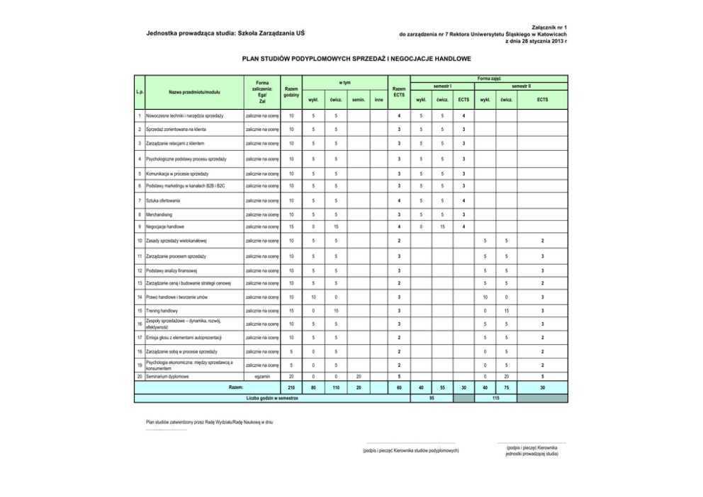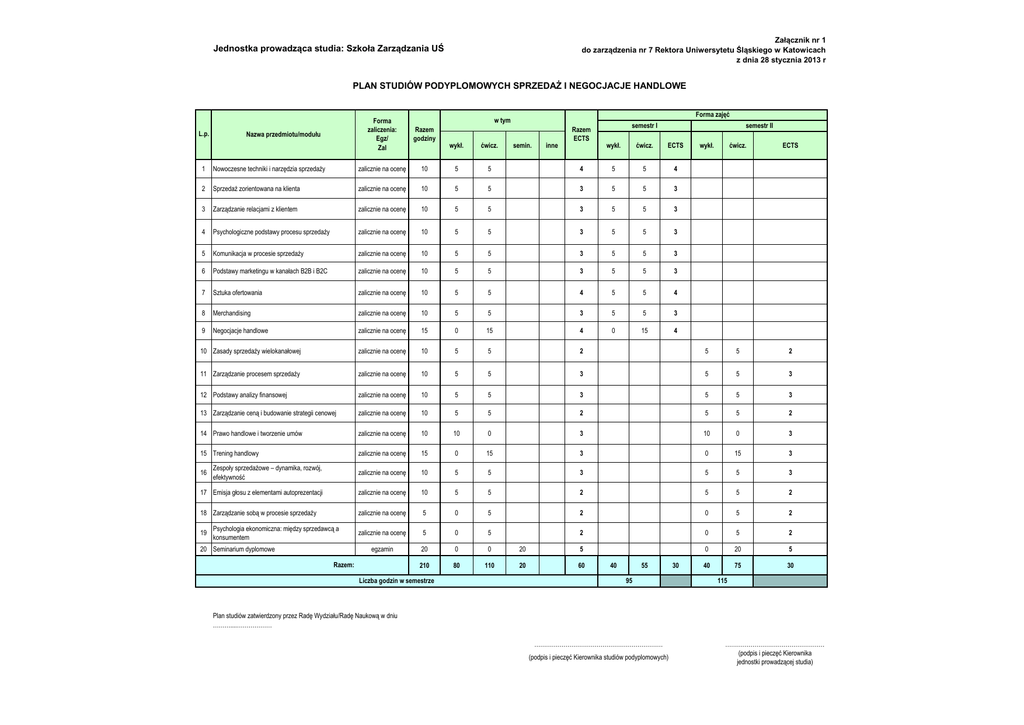 Załącznik nr 1 do zarządzenia nr 7 Rektora Uniwersytetu Śląskiego w Katowicach z dnia 28 stycznia 2013 r Jednostka prowadząca studia: Szkoła Zarządzania UŚ PLAN STUDIÓW PODYPLOMOWYCH SPRZEDAŻ I NEGOCJACJE HANDLOWE L.p. Nazwa przedmiotu/modułu Forma zajęć w tym Forma zaliczenia: Egz/ Zal Razem godziny wykł. ćwicz. semin. inne Razem ECTS semestr I semestr II wykł. ćwicz. ECTS wykł. ćwicz. ECTS 1 Nowoczesne techniki i narzędzia sprzedaży zalicznie na ocenę 10 5 5 4 5 5 4 2 Sprzedaż zorientowana na klienta zalicznie na ocenę 10 5 5 3 5 5 3 3 Zarządzanie relacjami z klientem zalicznie na ocenę 10 5 5 3 5 5 3 4 Psychologiczne podstawy procesu sprzedaży zalicznie na ocenę 10 5 5 3 5 5 3 5 Komunikacja w procesie sprzedaży zalicznie na ocenę 10 5 5 3 5 5 3 6 Podstawy marketingu w kanałach B2B i B2C zalicznie na ocenę 10 5 5 3 5 5 3 7 Sztuka ofertowania zalicznie na ocenę 10 5 5 4 5 5 4 8 Merchandising zalicznie na ocenę 10 5 5 3 5 5 3 9 Negocjacje handlowe zalicznie na ocenę 15 0 15 4 0 15 4 10 Zasady sprzedaży wielokanałowej zalicznie na ocenę 10 5 5 2 5 5 2 11 Zarządzanie procesem sprzedaży zalicznie na ocenę 10 5 5 3 5 5 3 12 Podstawy analizy finansowej zalicznie na ocenę 10 5 5 3 5 5 3 13 Zarządzanie ceną i budowanie strategii cenowej zalicznie na ocenę 10 5 5 2 5 5 2 14 Prawo handlowe i tworzenie umów zalicznie na ocenę 10 10 0 3 10 0 3 15 Trening handlowy zalicznie na ocenę 15 0 15 3 0 15 3 Zespoły sprzedażowe – dynamika, rozwój, 16 efektywność zalicznie na ocenę 10 5 5 3 5 5 3 17 Emisja głosu z elementami autoprezentacji zalicznie na ocenę 10 5 5 2 5 5 2 18 Zarządzanie sobą w procesie sprzedaży zalicznie na ocenę 5 0 5 2 0 5 2 zalicznie na ocenę 5 0 5 2 0 5 2 egzamin 20 0 0 20 5 0 20 5 210 80 110 20 60 40 75 30 19 Psychologia ekonomiczna: między sprzedawcą a konsumentem 20 Seminarium dyplomowe Razem: Liczba godzin w semestrze 40 55 95 30 115 Plan studiów zatwierdzony przez Radę Wydziału/Radę Naukową w dniu ………....……………… ………………………………………………………… (podpis i pieczęć Kierownika studiów podyplomowych) …………………………………………… (podpis i pieczęć Kierownika jednostki prowadzącej studia)