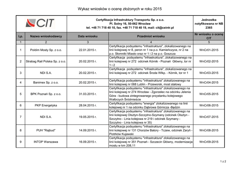Wykaz wniosków o ocenę złożonych w roku 2015 Certyfikacja Infrastruktury Transportu Sp. z o.o. Pl. Solny 16, 50-062 Wrocław tel. +48 71 718 40 10, fax. +48 71 718 40 19, mail: [email protected] Lp. Nazwa wnioskodawcy Data wniosku Przedmiot wniosku 1 2 3 1 Poldim Mosty Sp. z o.o. 22.01.2015 r. 2 Strabag Rail Polska Sp. z o.o. 20.02.2015 r. 3 NDI S.A. 20.02.2015 r. 4 Certyfikacja podsystemu "infrastruktura", zlokalizowanego na linii kolejowej nr 8, peron nr 1 na p.o. Kamieńczyce, nr 2 na p.o. Słomniki Miasto oraz nr 1 i 2 na p.o. Goszcza Certyfikacja podsystemu "infrastruktura", zlokalizowanego na linii kolejowej nr 272 odcinek Kórnik - Poznań Główny, tor nr 1i2 Certyfikacja podsystemu "infrastruktura", zlokalizowanego na linii kolejowej nr 272 odcinek Środa Wlkp. - Kórnik, tor nr 1 4 Banimex Sp. z o.o. 20.02.2015 r. 5 BPK Poznań Sp. z o.o. 31.03.2015 r. 6 PKP Energetyka 28.04.2015 r. 7 NDI S.A. 19.05.2015 r. 8 PUH "Rajbud" 14.09.2015 r. 9 INTOP Warszawa 16.09.2015 r. Certyfikacja podsystemu "infrastruktura" zlokalizowanego na linii kolejowej nr 068 Lublin - Przeworsk, most stalowy Certyfikacja podsystemu "infrastruktura" zlokalizowanego na linii kolejowej nr 274 Wrocław - Zgorzelec na odcinku Jelenia Góra - budowa zintegrowanego przystanku kolejowego Wałbrzych Śródmieście Certyfikacja podsystemu "energia" zlokalizowanego na linii kolejowej nr 1 na odcinku Dąbrowa Górnicza -Będzin Certyfikacja podsystemu "infrastruktura" zlokalizowanego na linii kolejowej Olsztyn-Szczytno-Szymany (odcinek Olsztyn Szczytno - Linia kolejowa nr 219 i odcinek Szymany Szczytno - Linia kolejowa nr 35) Certyfikacja podsystemu "infrastruktura" zlokalizowanego na linii kolejowej nr 131 Chorzów Batory - Tczew, odcinek Zaryń Piotrków Kujawski Certyfikacja podsystemu "infrastruktura" zlokalizowanego na linii kolejowej nr 351 Poznań - Szczecin Główny, modernizacja mostu w km 208,11 Jednostka notyfikowana nr NB 2365 Nr wniosku o ocenę CIT 5 WnCr01-2015 WnCr02-2015 WnCr03-2015 WnCr04-2015 WnCr05-2015 WnCr06-2015 WnCr07-2015 WnCr08-2015 WnCr09-2015 1z2 10 STRABAG Sp. z o.o. 15.09.2015 r. Certyfikacja podsystemu "infrastruktura" zlokalizowanego na linii kolejowej nr 353 Poznań Wschód - Skandawa, odcinek Poznań Wschód - Trzemeszno WnCr10-2015 11 INTOP Warszawa 23.09.2015 r. Certyfikacja podsystemu "energia" zlokalizowanego na linii kolejowej nr 351 Poznań - Szczecin, most w km 208,211 WnCr11-2015 12 Banimex Sp. z o.o. 25.09.2015 r. 13 Skanska S.A. 21.10.2015 r. 14 Porr POLSKA Construction S.A. 12.11.2015 r. 15 Intop Warszawa 29.10.2015 16 NDI S.A. 05.11.2015 r. 17 Skanska S.A. 17.11.2015 r. 18 Intop Warszawa 09.12.2015 r. Ceryfikacja podsystemu "infrastruktura" zlokalizowanego na linii kolejowej 281 Oleśnica - Chojnice most w km 110,586 WnCr18-2015 19 Vias Y Construcciones 17.12.2015 r. Ceryfikacja podsystemu "infrastruktura" zlokalizowanego na linii kolejowej nr 8 Skarżysko SKA - Skarżysko Sy WnCr19-2015 Certyfikacja podsystemu "energia" zlokalizowanego na linii kolejowej nr 068 Lublin - Przeworsk, most stalowy w km 167,561 Certyfikacja podsystemu "infrastruktura" zlokalizowanego na linii kolejowej nr 8 Radom - Kielce, szlak Sk. Kamienna Suchedniów Certyfikacja podsystemu "infrastruktura" zlokalizowanego na linii kolejowej nr 131 Chorzów Batory - Tczew, odcinek Bydgoszcz Główna - granica IZ Bydgoszcz Ceryfikacja podsystemu "energia" zlokalizowanego na linii kolejowej 281 Oleśnica - Chojnice most w km 110,586 Certyfikacja podsystemu "infrastruktura", zlokalizowanego na linii nr 272 Kluczbork - Poznań tor nr 1 w km 181,781 185,704 oraz tor nr 2 w km 185,167 - 185,460 Certyfikacja podsystemu "infrastruktura", zlokalizowanego na linii nr 25 tor nr 1 i 2 na szlaku Ożarów - Jakubowice; tor nr 1 i 2 na szlaku Jakubowice - Dwikozy WnCr12-2015 WnCr13-2015 WnCr14-2015 WnCr15-2015 WnCr16-2015 WnCr17-2015