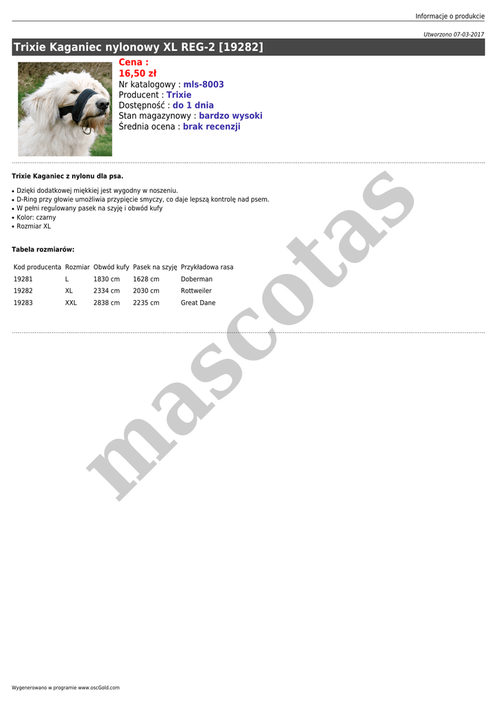 Informacje o produkcie Utworzono 07-03-2017 Trixie Kaganiec nylonowy XL REG-2 [19282] Cena : 16,50 zł Nr katalogowy : mls-8003 Producent : Trixie Dostępność : do 1 dnia Stan magazynowy : bardzo wysoki Średnia ocena : brak recenzji ● ● ● ● Dzięki dodatkowej miękkiej jest wygodny w noszeniu. D-Ring przy głowie umożliwia przypięcie smyczy, co daje lepszą kontrolę nad psem. W pełni regulowany pasek na szyję i obwód kufy Kolor: czarny Rozmiar XL Tabela rozmiarów: co ta ● Kod producenta Rozmiar Obwód kufy Pasek na szyję Przykładowa rasa L 1830 cm 1628 cm 19282 XL 2334 cm 2030 cm 19283 XXL 2838 cm 2235 cm Doberman Rottweiler Great Dane m as 19281 Wygenerowano w programie www.oscGold.com s Trixie Kaganiec z nylonu dla psa.