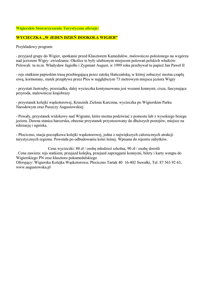 Wigierskie Stowarzyszenie Turystyczne oferuje: WYCIECZKA „W JEDEN DZIEŃ DOOKOŁA WIGIER” Przykładowy program: - przyjazd grupy do Wigier, spotkanie przed Klasztorem Kamedułów, malowniczo położonego na wzgórzu nad jeziorem Wigry- zwiedzanie. Okolice te były ulubionym miejscem polowań polskich władców. Polowali tu m.in. Władysław Jagiełło i Zygmunt August, w 1999 roku przebywał tu papież Jan Paweł II - rejs statkiem papieskim trasą przebiegającą przez zatokę Hańczańską, w której zobaczyć można czaplę siwą, kormorany, statek przepływa przez Plos w najgłębszym 73 metrowym miejscu jeziora Wigry - przystań Jastrzęby, przesiadka, dalej wycieczka kontynuowana jest wozami konnymi, cisza, fascynująca przyroda, malownicze krajobrazy - przystanek kolejki wąskotorowej, Krusznik Zielona Karczma, wycieczka po Wigierskim Parku Narodowym oraz Puszczy Augustowskiej - Powały, przystanek widokowy nad Wigrami, które można podziwiać z pomostu lub z wysokiego brzegu jeziora. Dawna stanica harcerska, obecnie przystanek przystosowany do dłuższych postojów, miejsce na rekreację i ogniska. - Płociczno, stacja początkowa kolejki wąskotorowej, jedna z największych całorocznych atrakcji turystycznych regionu. Powstała po odbudowaniu kolei leśnej. Wpisana do rejestru zabytków. Cena wycieczki: 80 zł / osobę młodzież szkolna, 90 zł / osobę dorośli Cena zawiera: rejs statkiem, przejazd kolejką, przejazd zaprzęgami konnymi, bilety i karty wstępu do Wigierskiego PN oraz klasztoru pokamedulskiego Oferujący: Wigierska Kolejka Wąskotorowa; Płociczno Tartak 40 16-402 Suwałki, Tel. 87 563 92 63, www.augustowska.pl