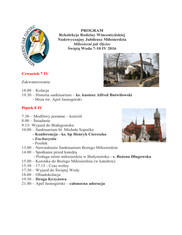 PROGRAM Rekolekcje Rodziny Wincentyńskiej Nadzwyczajny Jubileusz Miłosierdzia Miłosierni jak Ojciec Świętą Woda 7-10 IV 2016 Czwartek 7 IV Zakwaterowanie 18.00 – Kolacja 19.30 – Historia sanktuarium – ks. kustosz Alfred Butwiłowski - Msza św. Apel Jasnogórski Piątek 8 IV 7.30 – Modlitwy poranne – kościół 8.00 – Śniadanie 9.15- Wyjazd do Białegostoku 10.00 – Sanktuarium bł. Michała Sopoćko - Konferencja - ks. bp Henryk Ciereszko - Eucharystia - Posiłek 13.00 – Nawiedzenie Sanktuarium Bożego Miłosierdzia 14.00 – Spotkanie przed katedrą - Posługa sióstr miłosierdzia w Białymstoku - s. Bożena Długowska 15.00 – Koronka do Bożego Miłosierdzia (w katedrze) 15.30 – 17.15 - Czas wolny 17.30 – Wyjazd do Świętej Wody 18.00 – Obiadokolacja 19.30 – Droga Krzyżowa 21.00 – Apel Jasnogórski – całonocna adoracja Sobota 9 IV 7.30 – Zakończenie adoracji – modlitwy poranne 8.00 – Śniadanie 8.45 – Wyjazd do Sokółki 9.30 – Sokółka – Kolegiata św. Antoniego Sanktuarium Cudu Eucharystycznego - słowo kustosza - ks. Stanisław Gniedziejko - Eucharystia 12. 00 – Wyjazd do Różanego Stoku (sanktuarium maryjne) i Suchowoli ( izba pamięci bł. Jerzego Popiełuszki) Ok. 15.30 - powrót do Świętej Wody 16.00 – Konferencja - ks. bp Henryk Ciereszko 18.00 – Kolacja 18.45 – Różaniec na dróżkach Siedmiu Boleści 19.30 – Spotkanie przy ognisku 21.00 – Apel Jasnogórski Niedziela 10 IV 8.00 – Śniadanie 9.00 – Eucharystia 10.30 – 11.30 – Spotkana w ramach stowarzyszeń 12.00 - Obiad – Zakończenie rekolekcji