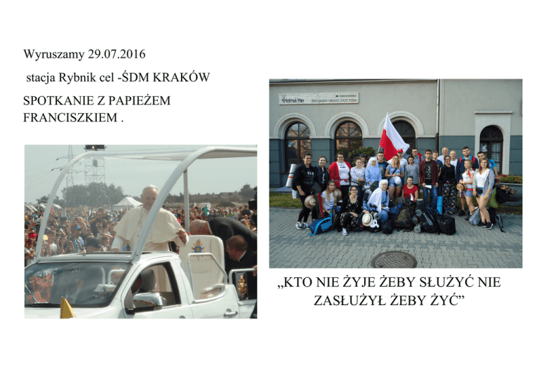 Wyruszamy 29.07.2016 stacja Rybnik cel -ŚDM KRAKÓW SPOTKANIE Z PAPIEŻEM FRANCISZKIEM . „KTO NIE ŻYJE ŻEBY SŁUŻYĆ NIE ZASŁUŻYŁ ŻEBY ŻYĆ” CZASEM BYŁO TRUDNO ALE WARTO!!!!