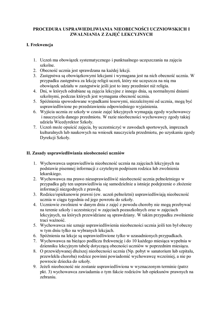 PROCEDURA USPRAWIEDLIWIANIA NIEOBECNOŚCI UCZNIOWSKICH I ZWALNIANIA Z ZAJĘĆ LEKCYJNYCH I. Frekwencja 1. Uczeń ma obowiązek systematycznego i punktualnego uczęszczania na zajęcia szkolne. 2. Obecność ucznia jest sprawdzana na każdej lekcji. 3. Zastępstwa są obowiązkowymi lekcjami i wymagana jest na nich obecność ucznia. W przypadku zastępstwa za lekcję religii uczeń, który nie uczęszcza na nią ma obowiązek udziału w zastępstwie jeśli jest to inny przedmiot niż religia. 4. Dni, w których odrabiane są zajęcia lekcyjne z innego dnia, są normalnymi dniami szkolnymi, podczas których jest wymagana obecność ucznia. 5. Spóźnienia spowodowane wypadkami losowymi, niezależnymi od ucznia, mogą być usprawiedliwione po przedstawieniu odpowiedniego wyjaśnienia. 6. Wyjścia ucznia ze szkoły w czasie zajęć lekcyjnych wymagają zgody wychowawcy i nauczyciela danego przedmiotu. W razie nieobecności wychowawcy zgody takiej udziela Wicedyrektor Szkoły. 7. Uczeń może opuścić zajęcia, by uczestniczyć w zawodach sportowych, imprezach kulturalnych lub naukowych na wniosek nauczyciela przedmiotu, po uzyskaniu zgody Dyrekcji Szkoły. II. Zasady usprawiedliwiania nieobecności uczniów 1. Wychowawca usprawiedliwia nieobecność ucznia na zajęciach lekcyjnych na podstawie pisemnej informacji z czytelnym podpisem rodzica lub zwolnienia lekarskiego. 2. Wychowawca ma prawo nieusprawiedliwić nieobecność ucznia pełnoletniego w przypadku gdy ten usprawiedliwia się samodzielnie a istnieje podejrzenie o złożenie informacji niezgodnych z prawdą. 3. Rodzice/opiekunowie prawni (ew. uczeń pełnoletni) usprawiedliwiają nieobecność ucznia w ciągu tygodnia od jego powrotu do szkoły. 4. Uczniowie zwolnieni w danym dniu z zajęć z powodu choroby nie mogą przebywać na terenie szkoły i uczestniczyć w zajęciach pozaszkolnych oraz w zajęciach lekcyjnych, na których przewidziane są sprawdziany. W takim przypadku zwolnienie traci ważność. 5. Wychowawca nie uznaje usprawiedliwienia nieobecności ucznia jeśli ten był obecny w tym dniu tylko na wybranych lekcjach. 6. Spóźnienia na lekcje są usprawiedliwione tylko w uzasadnionych przypadkach. 7. Wychowawca na bieżąco podlicza frekwencję i do 10 każdego miesiąca wypełnia w dzienniku lekcyjnym tabelę dotyczącą obecności uczniów w poprzednim miesiącu. 8. O przewidywanej dłuższej nieobecności ucznia (Np. pobyt w sanatorium lub szpitalu, przewlekła choroba) rodzice powinni powiadomić wychowawcę wcześniej, a nie po powrocie dziecka do szkoły. 9. Jeżeli nieobecność nie zostanie usprawiedliwiona w wyznaczonym terminie (patrz pkt. 3) wychowawca zawiadamia o tym fakcie rodziców lub opiekunów prawnych na zebraniu. 10. Uczeń który chce się zwolnić z ostatnich lekcji w danym dniu (Np. z powodu wizyty u lekarza) ma obowiązek przedstawić wychowawcy pisemną zgodę rodziców. 11. Każdy nauczyciel odnotowuje i kontroluje nieobecności uczniów w przypadku często powtarzających się absencji ucznia na swoim przedmiocie. 12. Nieobecności ucznia mają istotny wpływ na uzyskiwane oceny i mogą spowodować brak podstaw do klasyfikacji ucznia. 13. Nieobecność ucznia w szkole nie zwalnia go z obowiązku nadrobienia zaległości szkolnych.