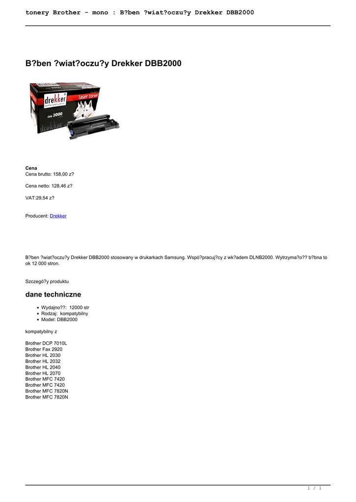 tonery Brother - mono : B?ben ?wiat?oczu?y Drekker DBB2000 B?ben ?wiat?oczu?y Drekker DBB2000 Cena Cena brutto: 158,00 z? Cena netto: 128,46 z? VAT:29,54 z? Producent: Drekker B?ben ?wiat?oczu?y Drekker DBB2000 stosowany w drukarkach Samsung. Wspó?pracuj?cy z wk?adem DLNB2000. Wytrzyma?o?? b?bna to ok 12 000 stron. Szczegó?y produktu dane techniczne Wydajno??: 12000 str Rodzaj: kompatybilny Model: DBB2000 kompatybilny z Brother DCP 7010L Brother Fax 2920 Brother HL 2030 Brother HL 2032 Brother HL 2040 Brother HL 2070 Brother MFC 7420 Brother MFC 7420 Brother MFC 7820N Brother MFC 7820N 1 / 1 Powered by TCPDF (www.tcpdf.org)