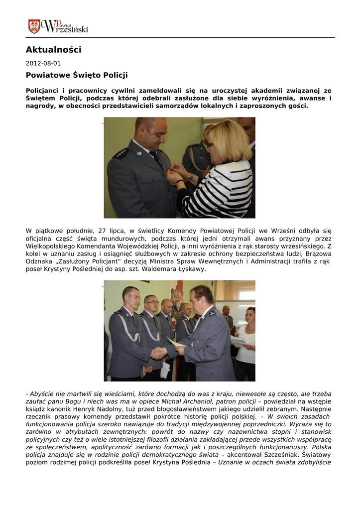 Aktualności 2012-08-01 Powiatowe Święto Policji Policjanci i pracownicy cywilni zameldowali się na uroczystej akademii związanej ze Świętem Policji, podczas której odebrali zasłużone dla siebie wyróżnienia, awanse i nagrody, w obecności przedstawicieli samorządów lokalnych i zaproszonych gości. W piątkowe południe, 27 lipca, w świetlicy Komendy Powiatowej Policji we Wrześni odbyła się oficjalna część święta mundurowych, podczas której jedni otrzymali awans przyznany przez Wielkopolskiego Komendanta Wojewódzkiej Policji, a inni wyróżnienia z rąk starosty wrzesińskiego. Z kolei w uznaniu zasług i osiągnięć służbowych w zakresie ochrony bezpieczeństwa ludzi, Brązowa Odznaka „Zasłużony Policjant” decyzją Ministra Spraw Wewnętrznych i Administracji trafiła z rąk poseł Krystyny Pośledniej do asp. szt. Waldemara Łyskawy. - Abyście nie martwili się wieściami, które dochodzą do was z kraju, niewesołe są często, ale trzeba zaufać panu Bogu i niech was ma w opiece Michał Archanioł, patron policji – powiedział na wstępie ksiądz kanonik Henryk Nadolny, tuż przed błogosławieństwem jakiego udzielił zebranym. Następnie rzecznik prasowy komendy przedstawił pokrótce historię policji polskiej. – W swoich zasadach funkcjonowania policja szeroko nawiązuje do tradycji międzywojennej poprzedniczki. Wyraża się to zarówno w atrybutach zewnętrznych: powrót do nazwy czy nazewnictwa stopni i stanowisk policyjnych czy też o wiele istotniejszej filozofii działania zakładającej przede wszystkich współpracę ze społeczeństwem, apolityczność zarówno formacji jak i poszczególnych funkcjonariuszy. Polska policja znajduje się w rodzinie policji demokratycznego świata – akcentował Szcześniak. Światowy poziom rodzimej policji podkreśliła poseł Krystyna Poślednia – Uznanie w oczach świata zdobyliście podczas Euro 2012. Wszystkie pochwały płynące z całego świata, a szczególnie z Europy w kierunku polskiej policji świadczyć mogą o jej wysokiej klasie – chwaliła poseł. Pełni dumy, po awanse wręczane przez komendanta wychodzili kolejno wywoływani funkcjonariusze. Na stopień aspiranta sztabowego awansował Szcześniak Krzysztof, rzecznik prasowy Komendy Powiatowej Policji we Wrześni. Stopień starszego aspiranta otrzymali: Maciej Jankowski i Jacek Wieczorek. Z kolei aspirantami zostali: Krzysztof Frąckowiak, Ryszard Kobielak, Mariusz Kucza, Grzegorz Matuszak, Mariusz Mielcarek, Marcin Stanisławski, Tomasz Szarzyński, Sebastian Waliński, Marcin Walczak, Piotr Wieczorek. Awans na stopień młodszego aspiranta przyjęli: Tomasz Giżewski, Jonasz Stramczewski oraz Marek Zdrojek. Szeregi sierżantów sztabowych zasilą: Magdalena Antczak, Adam Antkowiak, Artur Cwujdziński, Marcin Frydryszak, Piotr Goździewicz, Krzysztof Krawiec, Roman Michalak, Marcin Nawrocki, Krzysztof Rewers, Bartosz Staszewski, Zbigniew Twardowski, Marcin Zdziennicki. Sierżanci: Anna Frecho-Frankowska i Maciej Klamecki-Cichy awansowali na stopień starszego sierżanta. Za szczególne zaangażowanie w służbę policyjną starosta wrzesiński Dionizy Jaśniewicz postanowił wyróżnić dziewięciu policjantów: asp. Marcina Walczaka, nadkom. Roberta Nawrockiego, sierż. szt. Zbigniewa Twardowskiego, asp. Krzysztofa Frąckowiaka, asp. Ryszarda Kobielaka, st. asp. Macieja Jankowskiego, mł. asp. Marka Zdrojka, asp. szt. Artura Kubiaka, sierż. szt. Grzegorza Głowackiego, a także za długoletni staż pracy pełnej zaangażowania, pracownika cywilnego Zbigniewa Kuczę. – Chciałbym pogratulować i podziękować wyróżnionym policjantom oraz wszystkim pozostałym za zaangażowanie w pracę wykonywaną na co dzień oraz życzyć skoku cywilizacyjnego w policji w zakresie polepszenia warunków pracy jak i płac – powiedział starosta. Życzeń i pochlebnych słów pod kierunkiem policji zdawało się nie mieć końca. - Nasza jednostka jest bardzo młodą jednostką. Nastąpiło odmłodzenie kadry policyjnej i dlatego te życzenia i ciepłe słowa są im wyjątkowo potrzebne, szczególnie w tym początkowym okresie, bo dziś trzydzieści procent stanu osobowego to policjanci, którzy mają nie więcej niż pięć lat służby –mówił Jarosław Gruszczyński komendant Komendy Powiatowej Policji. Dziękując gościom za życzenia komendant podkreślił jak bardzo policja się przeobraziła i dostosowała do potrzeb społecznych. Anna Olejniczak