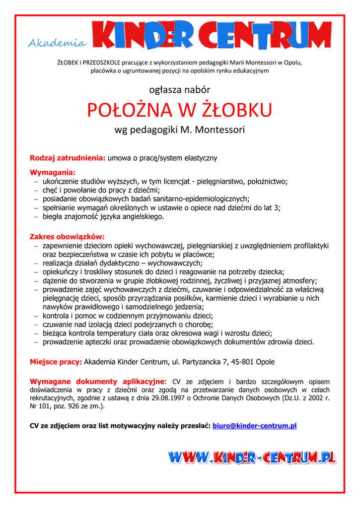 ŻŁOBEK i PRZEDSZKOLE pracujące z wykorzystaniem pedagogiki Marii Montessori w Opolu, placówka o ugruntowanej pozycji na opolskim rynku edukacyjnym ogłasza nabór POŁOŻNA W ŻŁOBKU wg pedagogiki M. Montessori Rodzaj zatrudnienia: umowa o pracę/system elastyczny Wymagania: − ukończenie studiów wyższych, w tym licencjat - pielęgniarstwo, położnictwo; − chęć i powołanie do pracy z dziećmi; − posiadanie obowiązkowych badań sanitarno-epidemiologicznych; − spełnianie wymagań określonych w ustawie o opiece nad dziećmi do lat 3; − biegła znajomość języka angielskiego. Zakres obowiązków: − zapewnienie dzieciom opieki wychowawczej, pielęgniarskiej z uwzględnieniem profilaktyki oraz bezpieczeństwa w czasie ich pobytu w placówce; − realizacja działań dydaktyczno – wychowawczych; − opiekuńczy i troskliwy stosunek do dzieci i reagowanie na potrzeby dziecka; − dążenie do stworzenia w grupie żłobkowej rodzinnej, życzliwej i przyjaznej atmosfery; − prowadzenie zajęć wychowawczych z dziećmi, czuwanie i odpowiedzialność za właściwą pielęgnację dzieci, sposób przyrządzania posiłków, karmienie dzieci i wyrabianie u nich nawyków prawidłowego i samodzielnego jedzenia; − kontrola i pomoc w codziennym przyjmowaniu dzieci; − czuwanie nad izolacją dzieci podejrzanych o chorobę; − bieżąca kontrola temperatury ciała oraz okresowa wagi i wzrostu dzieci; − prowadzenie apteczki oraz prowadzenie obowiązkowych dokumentów zdrowia dzieci. Miejsce pracy: Akademia Kinder Centrum, ul. Partyzancka 7, 45-801 Opole Wymagane dokumenty aplikacyjne: CV ze zdjęciem i bardzo szczegółowym opisem doświadczenia w pracy z dziećmi oraz zgodą na przetwarzanie danych osobowych w celach rekrutacyjnych, zgodnie z ustawą z dnia 29.08.1997 o Ochronie Danych Osobowych (Dz.U. z 2002 r. Nr 101, poz. 926 ze zm.). CV ze zdjęciem oraz list motywacyjny należy przesłać: [email protected]