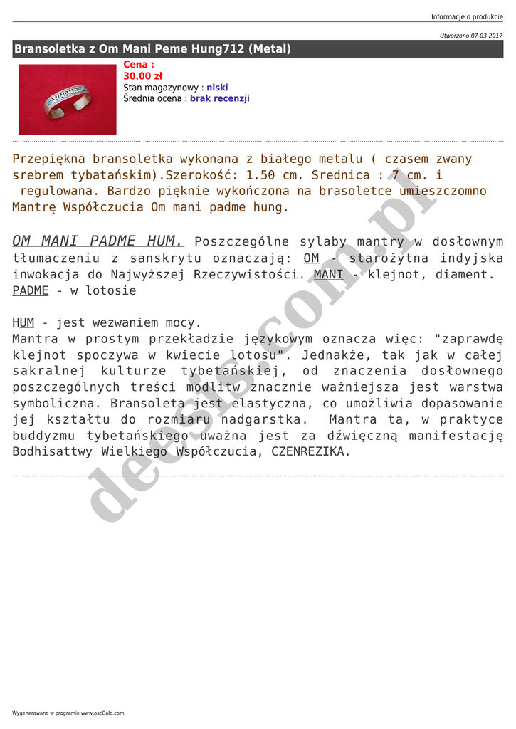 Informacje o produkcie Utworzono 07-03-2017 Bransoletka z Om Mani Peme Hung712 (Metal) Cena : 30.00 zł Stan magazynowy : niski Średnia ocena : brak recenzji m .p l Przepiękna bransoletka wykonana z białego metalu ( czasem zwany srebrem tybatańskim).Szerokość: 1.50 cm. Srednica : 7 cm. i regulowana. Bardzo pięknie wykończona na brasoletce umieszczomno Mantrę Współczucia Om mani padme hung. OM MANI PADME HUM. Poszczególne sylaby mantry w dosłownym .c o tłumaczeniu z sanskrytu oznaczają: OM - starożytna indyjska inwokacja do Najwyższej Rzeczywistości. MANI - klejnot, diament. PADME - w lotosie de es is HUM - jest wezwaniem mocy. Mantra w prostym przekładzie językowym oznacza więc: "zaprawdę klejnot spoczywa w kwiecie lotosu". Jednakże, tak jak w całej sakralnej kulturze tybetańskiej, od znaczenia dosłownego poszczególnych treści modlitw znacznie ważniejsza jest warstwa symboliczna. Bransoleta jest elastyczna, co umożliwia dopasowanie jej kształtu do rozmiaru nadgarstka. Mantra ta, w praktyce buddyzmu tybetańskiego uważna jest za dźwięczną manifestację Bodhisattwy Wielkiego Współczucia, CZENREZIKA. Wygenerowano w programie www.oscGold.com