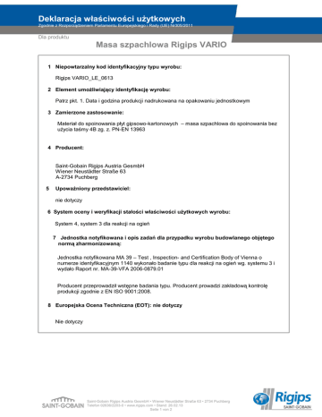 Deklaracja właściwości użytkowych Zgodnie z Rozporządzeniem Parlamentu Europejskiego i Rady (UE) Nr305/2011 Dla produktu Masa szpachlowa Rigips VARIO 1 Niepowtarzalny kod identyfikacyjny typu wyrobu: Rigips VARIO_LE_0613 2 Element umożliwiający identyfikację wyrobu: Patrz pkt. 1. Data i godzina produkcji nadrukowana na opakowaniu jednostkowym 3 Zamierzone zastosowanie: Materiał do spoinowania płyt gipsowo-kartonowych – masa szpachlowa do spoinowania bez użycia taśmy 4B zg. z. PN-EN 13963 4 Producent: Saint-Gobain Rigips Austria GesmbH Wiener Neustädter Straße 63 A-2734 Puchberg 5 Upoważniony przedstawiciel: nie dotyczy 6 System oceny i weryfikacji stałości właściwości użytkowych wyrobu: System 4, system 3 dla reakcji na ogień 7 Jednostka notyfikowana i opis zadań dla przypadku wyrobu budowlanego objętego normą zharmonizowaną: Jednostka notyfikowana MA 39 – Test , Inspection- and Certification Body of Vienna o numerze identyfikacyjnym 1140 wykonało badanie typu dla reakcji na ogień wg. systemu 3 i wydało Raport nr. MA-39-VFA 2006-0879.01 Producent przeprowadził wstępne badania typu. Producent prowadzi zakładową kontrolę produkcji zgodnie z EN ISO 9001:2008. 8 Europejska Ocena Techniczna (EOT): nie dotyczy Nie dotyczy Saint-Gobain Rigips Austria GesmbH • Wiener Neustädter Straße 63 • 2734 Puchberg Telefon 02636/2203-0 • www.rigips.com • Stand: 26.02.13 Seite 1 von 2 Deklaracja właściwości użytkowych Zgodnie z Rozporządzeniem Parlamentu Europejskiego i Rady (UE) Nr305/2011 Dla produktu Masa szpachlowa Rigips VARIO 9 Deklarowane właściwości użytkowe Zasadnicze charakterystyki Właściwości użytkowe Zhar onizowana specyfikacja techniczna Reakcja na ogień Klasa A1 EN 13501-1 Wytrzymałość na zginanie NPD EN 13963 *UWAGA: Te własności są przypisane do systemu i są zamieszczone w literaturze producenta 10 Właściwości użytkowe wyrobu określonego w pkt 1 i 2 są zgodne z właściwościami użytkowymi deklarowanymi w pkt 9. Niniejsza deklaracja właściwości użytkowych wydana zostaje na wyłączną odpowiedzialność producenta określonego w pkt 4. W imieniu producenta podpisał: Peter Giffinger, Managing Director ──────────────────────── (Imię i nazwisko, stanowisko ) th Puchberg, 27 June 2013 ──────────────────── (miejsce i data wydania) ────────────────────────────── (Podpis) Saint-Gobain Rigips Austria GesmbH • Wiener Neustädter Straße 63 • 2734 Puchberg Telefon 02636/2203-0 • www.rigips.com • Stand: 26.02.13 Seite 2 von 2