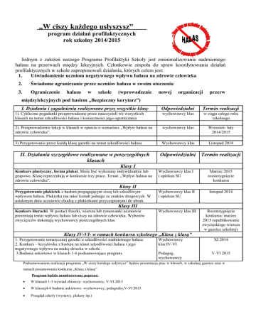 „W ciszy każdego usłyszysz” program działań profilaktycznych rok szkolny 2014/2015 Jednym z założeń naszego Programu Profilaktyki Szkoły jest zminimalizowanie nadmiernego hałasu na przerwach między lekcyjnych. Członkowie zespołu do spraw koordynowania działań profilaktycznych w szkole zaproponowali działania, których celem jest: 1. Uświadomienie uczniom negatywnego wpływu hałasu na zdrowie człowieka 2. Świadome ograniczanie przez uczniów hałasu w swoim otoczeniu 3. Ograniczenie hałasu w szkole (wprowadzenie nowej organizacji przerw międzylekcyjnych pod hasłem „Bezpieczny korytarz”) Odpowiedzialni Termin realizacji 1). Cykliczne pogadanki przeprowadzane przez nauczycieli we wszystkich klasach na temat szkodliwości hałasu i konieczności jego ograniczania I. Działania i zagadnienia realizowane przez wszystkie klasy wychowawcy klas w ciągu całego roku szkolnego 2). Przeprowadzenie lekcji w klasach w oparciu o scenariusz „Wpływ hałasu na zdrowie człowieka”. wychowawcy klas Wrzesień- luty 2014/2015 3) Przygotowanie przez każdą klasę gazetki na temat szkodliwości hałasu Wychowawcy klas Listopad 2014 II. Działania szczegółowe realizowane w poszczególnych klasach Odpowiedzialni Termin realizacji Klasy I Konkurs plastyczny, forma plakat. Może być wykonany indywidualnie lub grupowo. Klasę reprezentują w konkursie trzy prace. Temat: „Wpływ hałasu na zdrowie człowieka”. Wychowawcy klas I i opiekun SU Marzec 2015 rozstrzygnięcie konkursu Wychowawcy klas II i opiekun SU listopad 2014 Wychowawcy klas III Rozstrzygnięcie konkursu: marzec 2015 (opublikowanie zwycięskiego wiersza w gazetce szkolnej) Klasy II Przygotowanie plakietek z hasłem propagującym ciszę lub szkodliwym wpływem hałasu. Plakietka ma mieć kształt jednego ze znaków drogowych. W ustalonym dniu uczniowie chodzą z plakietkami przyczepionymi do ubrań. Klasy III Konkurs literacki. W postaci fraszki, wiersza lub rymowanki uczniowie prezentują temat wpływu hałasu lub ciszy na zdrowie człowieka. Wyborów zwycięzców dokonują wychowawcy poszczególnych klas. Klasy IV-VI- w ramach konkursu szkolnego „Klasa z klasą” 1. Przygotowanie tematycznej gazetki o szkodliwości nadmiernego hałasu. 2. Konkurs – krzyżówka z hasłem na temat szkodliwości hałasu i jego negatywnego wpływu na naukę dziecka w szkole. 3.Badania ankietowe w klasach 1-6 podsumowujące program. Wychowawcy klas IV-VI XI 2014 Pedagog, wychowawcy V-VI 2015 Podsumowaniem realizacji programu „W ciszy każdego usłyszysz” będzie prezentacja prac w klasach, w szkolnej gazetce oraz w ramach posumowania konkursu „Klasa z klasą” Program będzie monitorowany poprzez: W klasach 1-3 wywiad zbiorczy- wychowawcy, V-VI 2015 W klasacj4-6 badanie ankietowe- wychowawcy, pedagodzy,V-VI 2015 Przegląd szkoły (wystawy, plakaty itp.) PYTANIA ANKIETOWE 1. Czy są w szkole miejsca, gdzie odczuwasz nadmiar hałasu? TAK/NIE 2. Jeśli tak, wskaż te miejsca. …................ ….............. ….................. …................ …................... 3.Czy podobała Ci się nowa organizacja przerw międzylekcyjnych? TAK/NIE 4.W której z wymienionych form najczęściej uczestniczyłaś/eś? KLASY I-III KLASY IV-VI a) rysowanie -własna książka b)słuchanie bajek c) taniec d) gry a)zajęcia ruchowe, b)zajęcia komputerowe, c)zajęcia relaksacyjne, d) cichy kącik e)kostka rubika