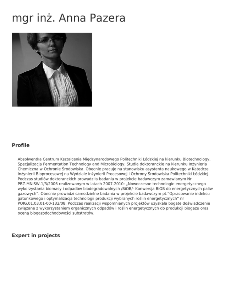 mgr inż. Anna Pazera Profile Absolwentka Centrum Kształcenia Międzynarodowego Politechniki Łódzkiej na kierunku Biotechnology. Specjalizacja Fermentation Technology and Microbiology. Studia doktoranckie na kierunku Inżynieria Chemiczna w Ochronie Środowiska. Obecnie pracuje na stanowisku asystenta naukowego w Katedrze Inżynierii Bioprocesowej na Wydziale Inżynierii Procesowej i Ochrony Środowiska Politechniki Łódzkiej. Podczas studiów doktoranckich prowadziła badania w projekcie badawczym zamawianym Nr PBZ-MNiSW-1/3/2006 realizowanym w latach 2007-2010: „Nowoczesne technologie energetycznego wykorzystania biomasy i odpadów biodegradowalnych /BiOB/- Konwersja BiOB do energetycznych paliw gazowych”. Obecnie prowadzi samodzielne badania w projekcie badawczym pt.”Opracowanie indeksu gatunkowego i optymalizacja technologii produkcji wybranych roślin energetycznych” nr POIG.01.03.01-00-132/08. Podczas realizacji wspomnianych projektów uzyskała bogate doświadczenie związane z wykorzystaniem organicznych odpadów i roślin energetycznych do produkcji biogazu oraz oceną biogazodochodowości substratów. Expert in projects Bioenergia dla branży rolno-spoży wczej Doradztwo KSI KSU dla innowacyjny ch Knowledge View more Aspekty logistyczne i technologiczne procesu gromadzenia i przetwarzania odpadów View more INNOVATIVE DAIRIES ENERGY INDEPENDENCE AND NON‐WASTE TECHNOLOGIES AS A CONSEQUENCE OF BIOGAS AND PHOTOVOLTAIC S INV View more Innovative solutions in the field of dairy industry waste management for energy purposes View more VERBAL MODEL FOR ENERGY AND CARBON DIOXIDE BALANCING IN PRODUCTION AND USE OF BIOFUELS View more Werbalny model bilansowania energii i dwutlenku węgla w produkcji i wykorzystywani u biopaliw View more Wpływ przemysłu mleczarskiego na środowisko. Standardowe metody zagospodarowa nia odpadów i ścieków poprodukcyjnyc h View more
