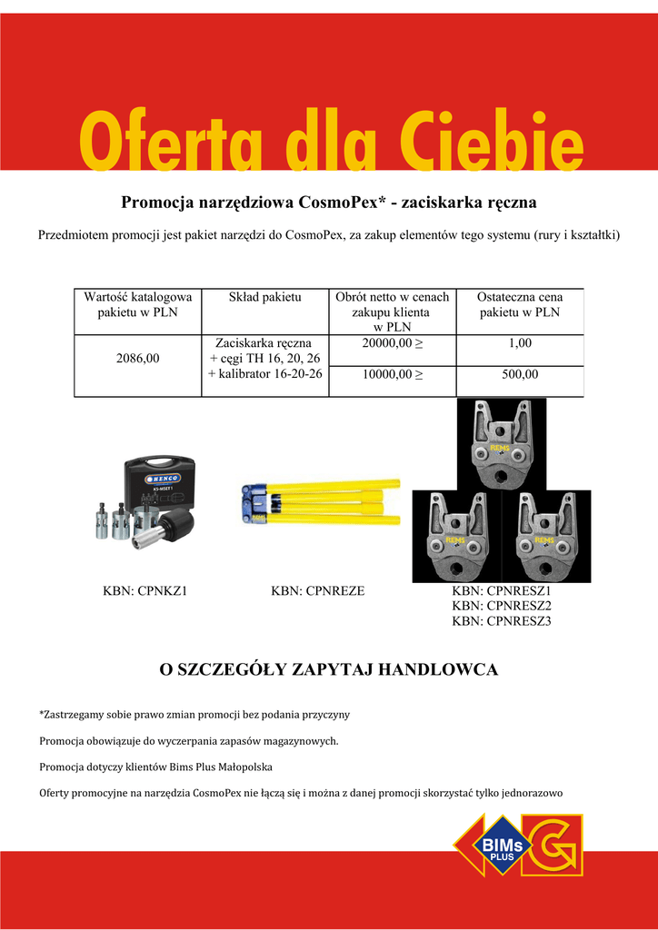 Promocja narzędziowa CosmoPex* - zaciskarka ręczna Przedmiotem promocji jest pakiet narzędzi do CosmoPex, za zakup elementów tego systemu (rury i kształtki) Wartość katalogowa pakietu w PLN 2086,00 KBN: CPNKZ1 Skład pakietu Zaciskarka ręczna + cęgi TH 16, 20, 26 + kalibrator 16-20-26 Obrót netto w cenach zakupu klienta w PLN 20000,00 ≥ Ostateczna cena pakietu w PLN 10000,00 ≥ 500,00 KBN: CPNREZE 1,00 KBN: CPNRESZ1 KBN: CPNRESZ2 KBN: CPNRESZ3 O SZCZEGÓŁY ZAPYTAJ HANDLOWCA *Zastrzegamy sobie prawo zmian promocji bez podania przyczyny Promocja obowiązuje do wyczerpania zapasów magazynowych. Promocja dotyczy klientów Bims Plus Małopolska Oferty promocyjne na narzędzia CosmoPex nie łączą się i można z danej promocji skorzystać tylko jednorazowo