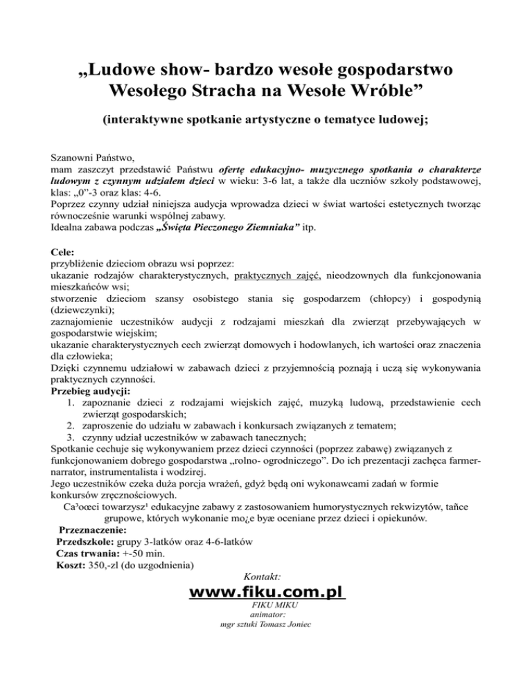 „Ludowe show- bardzo wesołe gospodarstwo Wesołego Stracha na Wesołe Wróble” (interaktywne spotkanie artystyczne o tematyce ludowej; Szanowni Państwo, mam zaszczyt przedstawić Państwu ofertę edukacyjno- muzycznego spotkania o charakterze ludowym z czynnym udziałem dzieci w wieku: 3-6 lat, a także dla uczniów szkoły podstawowej, klas: „0”-3 oraz klas: 4-6. Poprzez czynny udział niniejsza audycja wprowadza dzieci w świat wartości estetycznych tworząc równocześnie warunki wspólnej zabawy. Idealna zabawa podczas „Święta Pieczonego Ziemniaka” itp. Cele: przybliżenie dzieciom obrazu wsi poprzez: ukazanie rodzajów charakterystycznych, praktycznych zajęć, nieodzownych dla funkcjonowania mieszkańców wsi; stworzenie dzieciom szansy osobistego stania się gospodarzem (chłopcy) i gospodynią (dziewczynki); zaznajomienie uczestników audycji z rodzajami mieszkań dla zwierząt przebywających w gospodarstwie wiejskim; ukazanie charakterystycznych cech zwierząt domowych i hodowlanych, ich wartości oraz znaczenia dla człowieka; Dzięki czynnemu udziałowi w zabawach dzieci z przyjemnością poznają i uczą się wykonywania praktycznych czynności. Przebieg audycji: 1. zapoznanie dzieci z rodzajami wiejskich zajęć, muzyką ludową, przedstawienie cech zwierząt gospodarskich; 2. zaproszenie do udziału w zabawach i konkursach związanych z tematem; 3. czynny udział uczestników w zabawach tanecznych; Spotkanie cechuje się wykonywaniem przez dzieci czynności (poprzez zabawę) związanych z funkcjonowaniem dobrego gospodarstwa „rolno- ogrodniczego”. Do ich prezentacji zachęca farmernarrator, instrumentalista i wodzirej. Jego uczestników czeka duża porcja wrażeń, gdyż będą oni wykonawcami zadań w formie konkursów zręcznościowych. Ca³oœci towarzysz¹ edukacyjne zabawy z zastosowaniem humorystycznych rekwizytów, tañce grupowe, których wykonanie mo¿e byæ oceniane przez dzieci i opiekunów. Przeznaczenie: Przedszkole: grupy 3-latków oraz 4-6-latków Czas trwania: +-50 min. Koszt: 350,-zl (do uzgodnienia) Kontakt: www.fiku.com.pl FIKU MIKU animator: mgr sztuki Tomasz Joniec tel: 515- 726-174 e-mail: [email protected]