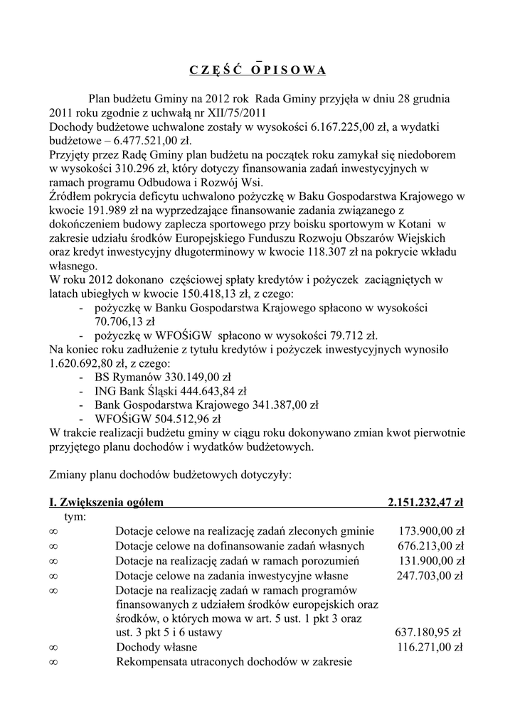 C Z Ę Ś Ć O PI S O WA Plan budżetu Gminy na 2012 rok Rada Gminy przyjęła w dniu 28 grudnia 2011 roku zgodnie z uchwałą nr XII/75/2011 Dochody budżetowe uchwalone zostały w wysokości 6.167.225,00 zł, a wydatki budżetowe – 6.477.521,00 zł. Przyjęty przez Radę Gminy plan budżetu na początek roku zamykał się niedoborem w wysokości 310.296 zł, który dotyczy finansowania zadań inwestycyjnych w ramach programu Odbudowa i Rozwój Wsi. Źródłem pokrycia deficytu uchwalono pożyczkę w Baku Gospodarstwa Krajowego w kwocie 191.989 zł na wyprzedzające finansowanie zadania związanego z dokończeniem budowy zaplecza sportowego przy boisku sportowym w Kotani w zakresie udziału środków Europejskiego Funduszu Rozwoju Obszarów Wiejskich oraz kredyt inwestycyjny długoterminowy w kwocie 118.307 zł na pokrycie wkładu własnego. W roku 2012 dokonano częściowej spłaty kredytów i pożyczek zaciągniętych w latach ubiegłych w kwocie 150.418,13 zł, z czego: - pożyczkę w Banku Gospodarstwa Krajowego spłacono w wysokości 70.706,13 zł - pożyczkę w WFOŚiGW spłacono w wysokości 79.712 zł. Na koniec roku zadłużenie z tytułu kredytów i pożyczek inwestycyjnych wynosiło 1.620.692,80 zł, z czego: - BS Rymanów 330.149,00 zł - ING Bank Śląski 444.643,84 zł - Bank Gospodarstwa Krajowego 341.387,00 zł - WFOŚiGW 504.512,96 zł W trakcie realizacji budżetu gminy w ciągu roku dokonywano zmian kwot pierwotnie przyjętego planu dochodów i wydatków budżetowych. Zmiany planu dochodów budżetowych dotyczyły: I. Zwiększenia ogółem 2.151.232,47 zł tym: • Dotacje celowe na realizację zadań zleconych gminie 173.900,00 zł • Dotacje celowe na dofinansowanie zadań własnych 676.213,00 zł • Dotacje na realizację zadań w ramach porozumień 131.900,00 zł • Dotacje celowe na zadania inwestycyjne własne 247.703,00 zł • Dotacje na realizację zadań w ramach programów finansowanych z udziałem środków europejskich oraz środków, o których mowa w art. 5 ust. 1 pkt 3 oraz ust. 3 pkt 5 i 6 ustawy 637.180,95 zł • Dochody własne 116.271,00 zł • Rekompensata utraconych dochodów w zakresie • • • podatków Środki funduszu europejskiego za zrealizowane zadania inwestycyjne w roku poprzednim Dotacja z tytułu rozliczenia funduszu sołeckiego za 2011 rok część oświatowa subwencji Zmniejszenia ogółem w tym: • Dotacje celowe na realizację zadań zleconych gminie • Dotacje celowe na realizację zadań własnych • Subwencja oświatowa • Dotacje na realizację zadań w ramach programów finansowanych z udziałem środków europejskich oraz środków, o których mowa w art. 5 ust. 1 pkt 3 oraz ust. 3 pkt 5 i 6 ustawy 53.098,00 zł 70.706,00 zł 20.705,52 zł 23.555,00 zł 576.881,00 zł 2.593,00 zł 250,00 zł 72.873,00 zł 501.165,00 zł Zmiany planu wydatków budżetowych dotyczyły: Zwiększenia ogółem w tym: • Dz. 010 – Rolnictwo i łowiectwo • Dz. 020 - Leśnictwo • Dz. 600 – Transport i łączność • Dz. 700 – Gospodarka mieszkaniowa • Dz. 710 – Działalność usługowa • Dz. 720 – Informatyka • Dz. 750 – Administracja publiczna • Dz.757 – Obsługa długu publicznego • Dz. 801 – Oświata i wychowanie • Dz. 852 – Pomoc społeczna • Dz. 854 – Edukacyjna opieka wychowawcza • Dz. 900 – Gospodarka komunalna i ochrona środowiska • Dz. 921 – Kultura i ochrona dziedzictwa narodowego • Dz. 926 – Kultura fizyczna i sport Zmniejszenia ogółem W tym: • Dz. 720 - Informatyka • Dz. 750 – Administracja publiczna • Dz. 754 – Bezpieczeństwo publiczne i ochrona przeciwpożarowa 2.006.817,47 zł 219.475,00 zł 573,00 zł 868.279,00 zł 22.556,00 zł 45.000,00 zł 17.425,00 zł 22.948,52 zł 5.000,00 zł 108.648,03 zł 303.369,00 zł 245.566,92 zł 137.985,00 zł 9.892,00 zł 100,00 zł 432.466,00 zł 294.466,00 zł 42.200,00 zł 14.400,00 zł • • Dz. 852 – Pomoc społeczna Dz. 900 – Gospodarka komunalna i ochrona środowiska 12.733,00 zł 3.000,00 zł Zarządzeniami Wójta Gminy rozdysponowano środki rezerwy ogólnej w kwocie 38.820 zł i przeznaczono na: - utrzymanie i remont dróg gminnych – 13.000 zł. - remont dróg dojazdowych do pól – 1.820 zł. - opracowanie dokumentacji projektowej remontu kanalizacji sanitarnej – 3.000 zł. - prace remontowe w budynku gminnym – ośrodek zdrowia – 21.000 zł. Do końca roku nie wpłynęły środki dotacji w wysokości 25.000 zł na sfinansowanie nakładów na budowę placu zabaw. W dalszym ciągu gmina nie otrzymała środków z Funduszu Spójności. Po uwzględnieniu wszystkich zmian plan dochodów budżetowych na 2012 rok wyniósł 7.741.576,47 zł, a plan wydatków budżetowych – 8.051.872,47 zł. DOCHODY BUDŻETOWE Roczna realizacja dochodów budżetowych wyniosła 7.543.546,54 zł, co stanowi 97,44 % planu rocznego. Analizując realizację dochodów budżetowych należy stwierdzić, iż przebiegała ona prawidłowo w stosunku do założonego planu. W niektórych pozycjach wykonanie roczne przekroczyło 100% planu, lecz są pozycje, w których wykonanie odbiega nieco od planu rocznego. Pozycje te dotyczą wpływów z tytułu czynszów za lokale użytkowe i mieszkalne – wykonanie 66,06%, wpływów ze sprzedaży składników mienia komunalnego – 81,58%, nie zrealizowano planu dochodów z tytułu przekształcenia prawa użytkowania wieczystego. Po rozliczeniu wszystkich wydatków finansowanych z dotacji celowych do końca roku 2012 dokonano zwrotu niewykorzystanych środków w łącznej kwocie 665,03 zł. Realizacja dochodów w poszczególnych działach klasyfikacji budżetowej przedstawia się następująco: Dz. 010 – ROLNICTWO Na remont ujęcia wody w Ożennej otrzymano bezzwrotną pomoc finansową z Agencji Nieruchomości Rolnych w wysokości 34.300 zł. Na remont dróg rolniczych otrzymano kwotę w wysokości 66.000 zł Z tytułów czynszów za tereny łowieckie wpłynęła kwota 2.388,21 zł Na zwrot