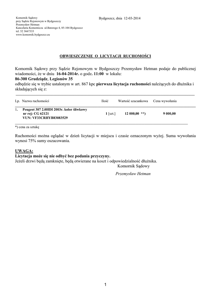 Komornik Sądowy przy Sądzie Rejonowym w Bydgoszczy Przemysław Hetman Kancelaria Komornicza ul.Batorego 4, 85-104 Bydgoszcz tel. 52 3667333 www.komornik.bydgoszcz.eu Bydgoszcz, dnia 12-03-2014 OBWIESZCZENIE O LICYTACJI RUCHOMOŚCI Komornik Sądowy przy Sądzie Rejonowym w Bydgoszczy Przemysław Hetman podaje do publicznej wiadomości, że w dniu 16-04-2014r. o godz. 11:00 w lokalu: 86-300 Grudziądz, Legionów 35 odbędzie się w trybie ustalonym w art. 867 kpc pierwsza licytacja ruchomości należących do dłużnika i składających się z: ____________________________________________________________________________________________________ Lp. Nazwa ruchomości Ilość Wartość szacunkowa Cena wywołania _____________________________________________________________________________________________________ 1. Peugeot 307 2.0HDI 2003r. kolor śliwkowy nr rej: CG 62121 1 [szt.] 12 000,00 **) 9 000,00 VUN: VF33CRHYB83083529 _______________________________________________________________________________________________________________________ *) cena za sztukę Ruchomości można oglądać w dzień licytacji w miejscu i czasie oznaczonym wyżej. Suma wywołania wynosi 75% sumy oszacowania. UWAGA: Licytacja może się nie odbyć bez podania przyczyny. Jeżeli drzwi będą zamknięte, będą otwierane na koszt i odpowiedzialność dłużnika. Komornik Sądowy Przemysław Hetman 1 Adresat oryginału: Maciej Konieczny Do wiadomości: 1. Radca Prawny Mariusz Łątkowski Kancelaria Radcy Prawnego, 85-104 Bydgoszcz 2. Sąd Rejonowy w Bydgoszczy Tablica Ogłoszeń, 85-131 Bydgoszcz 3. Urząd Miasta Bydgoszczy Tablica Ogłoszeń, 85-102 Bydgoszcz 4. Maciej Konieczny, 86-300 Grudziądz 5. Sąd Rejonowy w Grudziądzu Tablica Ogłoszeń, 86-300 GRUDZIĄDZ 6. a/a 2