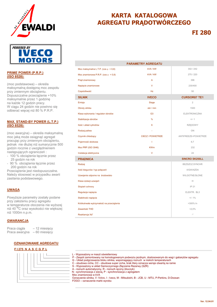 FI 280 KARTA KATALOGOWA AGREGATU PRĄDOTWÓRCZEGO