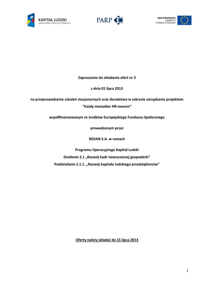Zaproszenie do składania ofert nr 3 z dnia 01 lipca 2013 na przeprowadzenie szkoleń stacjonarnych oraz doradztwo w zakresie zarządzania projektem "Każdy menadżer HR-owcem” współfinansowanym ze środków Europejskiego Funduszu Społecznego prowadzonym przez REDAN S.A. w ramach Programu Operacyjnego Kapitał Ludzki Działanie 2.1 „Rozwój kadr nowoczesnej gospodarki" Poddziałanie 2.1.1. „Rozwój kapitału ludzkiego przedsiębiorstw" Oferty należy składać do 15 lipca 2013 1 REDAN S.A. zwraca się do Państwa z propozycją przedstawienia oferty w konkursie ofert, którego celem jest wyłonienie firmy, która przeprowadzi szkolenia stacjonarne w projekcie współfinansowanym ze środków Europejskiego Funduszu Społecznego w ramach poddziałania 2.1.1 Programu Operacyjnego Kapitał Ludzki, realizowanym w okresie 07.2013 – 04.2015. I. Tryb udzielenia zamówienia Postępowanie jest prowadzone zgodnie z zasadą konkurencyjności opisaną w Wytycznych w zakresie kwalifikowania wydatków ramach Programu Operacyjnego Kapitał Ludzki oraz informacjami zawartymi w niniejszym zapytaniu. Zapytanie ofertowe ma na celu zebranie ofert od podmiotów zainteresowanych świadczeniem usług, zwanych dalej „Wykonawcami” lub „Oferentami”. Umowa zostanie podpisana z Wykonawcą, którego oferta zostanie wybrana jako najkorzystniejsza na podstawie kryteriów zawartych w niniejszym zapytaniu. II. Opis przedmiotu Zamówienia: 1. Szkolenia stacjonarne Szczegółowy opis przedmiotu zamówienia znajduje się w załączniku nr 1 do niniejszego zapytania. Wg Wspólnego Słownika Zamówień (CPV): 80500000-9 Usługi szkoleniowe Okres realizacji zamówienia: 07.2013 – 04.2015 oraz 2. Doradztwo w zakresie zarządzania projektem Szczegółowy opis przedmiotu zamówienia znajduje się w załączniku nr 2 do niniejszego zapytania. Wg Wspólnego Słownika Zamówień (CPV): 72224000-1 Usługi doradcze w zakresie zarządzania projektem Okres realizacji zamówienia: 07.2013 – 04.2015 Dopuszcza się składanie ofert wspólnych składanych przez firmy szkoleniowe wraz z firmami doradczymi świadczącymi usługi doradztwa w zakresie zarządzania projektem. Nie dopuszcza się składania ofert częściowych co oznacza, że oferta musi dotyczyć zarówno szkoleń stacjonarnych jak i doradztwa w zakresie zarządzania projektem. III. Warunki udziału oraz sposób dokonywania oceny spełniania tych warunków O udzielenie zamówienia mogą ubiegać się podmioty posiadające niezbędną wiedzę i doświadczenie, dysponujące odpowiednim potencjałem technicznym i osobami zdolnymi do 2 wykonania zamówienia oraz znajdujące się w sytuacji ekonomicznej i finansowej umożliwiającej należyte wykonanie zamówienia. Podmioty ubiegające się o udzielenie zamówienia muszą spełnić następujące warunki: 1. Warunki udziału dotyczące szkoleń a. Oferent zrealizował co najmniej 3 duże projekty rozwojowe, których przedmiotem było wdrożenie standardów obsługi Klienta w sprzedaży detalicznej lub z zakresu zarządzania lub train the trainer dla klientów posiadających sieć sprzedaży detalicznej. Przez projekt rozumie się przeprowadzenie co najmniej 250 dni szkoleniowych dla firmy posiadającej co najmniej 50 placówek jednej sieci sprzedaży detalicznej lub 250 dni szkoleniowych dla jednej sieci sprzedaży detalicznej złożonej z co najmniej 50 placówek w czasie 24 miesięcy. b. Oferent wykaże doświadczenie w prowadzeniu co najmniej 100 dni szkoleń dla co najmniej 50 przedsiębiorstw branży fashion i pokrewnych z zakresu sprzedaży detalicznej, zarządzania lub train the trainer, w ramach których przeszkolono nie mniej niż 400 osób w ciągu ostatnich 4 lat. c. Oferent przeprowadził minimum 100 dni szkoleniowych łącznie dla co najmniej 50 firm z sektora Małych i Średnich Przedsiębiorstw w zakresie sprzedaży detalicznej, obsługi klienta lub zarządzania przedsiębiorstwem) w ciągu ostatnich 3 lat. d. Oferent współpracował w okresie co najmniej 3 lat przed złożeniem oferty, w sposób ciągły lub powtarzalny z co najmniej 10 trenerami i może potwierdzić to umową z każdym z trenerów oraz dedykuje trenerów wyłącznie z tej grupy do realizacji zamówienia. e. Doświadczenie trenerów dedykowanych do realizacji zamówienia: i. Każdy z trenerów dedykowanych do realizacji zamówienia przeprowadził co najmniej 200 dni szkoleniowych w ostatnich 5 latach liczonych od upływu terminu składania ofert. ii. Każdy z trenerów posiada doświadczenie w przeprowadzeniu co najmniej 150 dni szkoleniowych z tematyki związanej ze sprzedażą oraz co najmniej 150 dni szkoleniowych z tematyki związanej z zarządzaniem. Potwierdzeniem spełnienia warunków będzie przedstawienie informacji w formularzu zawartym w załączniku nr 3 do niniejszego zapytania „Doświadczenie w zakresie prowadzenia szkoleń” oraz CV wszystkich trenerów dedykowanych do realizacji szkoleń. Powyższe warunki powinny być spełnione łącznie. 2. Warunki udziału dotyczące doradztwa w zakresie zarządzania a. Oferent zrealizował jako Projektodawca lub jako zewnętrzna firma doradcza w zakresie zarządzania projekty współfinansowane ze środków EFS w ramach POKL, w których 3 występowało łącznie doradztwo i szkolenia stacjonarne oraz łącznie w tych projektach przeprowadzono nie mniej niż 750 dni szkoleniowych i nie mniej niż 500 godzin doradztwa. b. Oferent posiada doświadczenie w sporządzaniu umów szkoleniowo – doradczych z Beneficjentami pomocy, sporządzanie sprawozdań z pomocy publicznej na szkolenia, a także znajomość zasad i doświadczenie w udzielaniu pomocy de minimis. Minimalna wartość pomocy publicznej na szkolenia udzielona w prowadzonych projektach wymienionych w punkcie a) wynosi 4 000 000 zł. Minimalna wartość pomocy de minimis udzielona w realizowanych projektach wymienionych w punkcie a) wynosi 300 000 zł. c. Oferent zrealizował Projektodawca lub jako zewnętrzna firma do