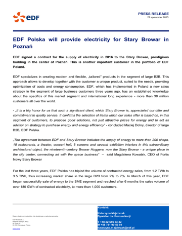 PRESS RELEASE 22 spetember 2015 EDF Polska will provide electricity for Stary Browar in Poznań EDF signed a contract for the supply of electricity in 2016 to the Stary Browar, prestigious building in the center of Poznań. This is another important customer in the portfolio of EDF Poland. EDF specializes in creating modern and flexible, „tailored” products in the segment of large B2B. This approach allows to develop together with the customer a unique product, suited to the needs, providing optimization of costs and energy consumption. EDF, which has implemented in Poland a new sales strategy in the segment of large business customers three years ago, has an established knowledge about the specifics of this market segment and international long experience - more than 38 million customers all over the world. - „It is a big honor for us that such a significant client, which Stary Browar is, appreciated our offer and commitment to quality service. It confirms the selection of items which our sales offer is based on, in this segment of customers, to propose good solutions, not just attractive prices for energy and to act as advisor on strategy to purchase energy and energy efficiency” - concluded Maciej Dolny, director of large B2B, EDF Polska. „The agreement between EDF and Stary Browar includes the supply of energy to more than 200 shops, 18 restaurants, a theater, concert hall, 8 screens and several exhibition interiors in this extraordinary architectural object, the nineteenth-century Browar Huggera, now the Stary Browar - a unique place in the city center, connecting art with the space business” – said Magdalena Kowalak, CEO of Fortis Nowy Stary Browar For the last three years, EDF Polska has tripled the volume of contracted energy sales, from 1.2 TWh to 3.5 TWh, thus increasing market share in the large B2B from 2% to 7%. In March of this year, EDF began successfully sale of energy to the SME segment and reached after 6 months the sales volume of over 180 GWh of contracted electricity, to more than 1,000 customers. Kontakt: Razem dbajmy o środowisko. Nie drukuj tego e-maila bez potrzeby. EDF Polska S.A., Budynek Skylight, XII p. ul. Złota 59 00-120 Warszawa, Polska www.edf.pl Katarzyna Majchrzak Dyrektor ds. Komunikacji T +48 22 556 53 42 M +48 781 90 53 01 [email protected] Grupa EDF w Polsce Grupa EDF posiada w Polsce 10% udziału w rynku energii elektrycznej, 15% w rynku ciepła sieciowego i zatrudnia 3000 pracowników. EDF jest największym zagranicznym inwestorem w branży energetyczne j w Polsce, największym producentem energii elektrycznej i ciepła w skojarzeniu, zaopatrując w ciepło Kraków, Gdańsk i Gdynię, Zieloną Górę, Wrocław i Siechnice oraz Toruń. EDF posiada systemową elektrownię węglową o mocy 1 775 MW w Rybniku. Grupa EDF Grupa EDF, jeden z liderów rynku energetycznego w Europie, jest zintegrowanym przedsiębiorstwem działającym we wszystkich gałęziach elektroenergetyki: w wytwarzaniu, przesyle, dystrybucji, handlu i obrocie energią. Jest największym europejskim wytwórcą energii elektrycznej. We Francji większość mocy wytwórczych Grupy to elektrownie jądrowe i wodne, zapewniające 97,6 proc. energii elektrycznej wolnej od emisji CO2. We Francji, podmioty zależne EDF odpowiadające za przesył i dystrybucję energii eksploatują 1 285 000 kilometrów napowietrznych i kablowych linii energetycznych średniego i niskiego napięcia oraz 100 000 kilometrów linii wysokich i najwyższych napięć. Grupa EDF uczestniczy w dostawach energii i usług do około 37,8 mln klientów, z czego 28,3 mln klientów we Francji. Skonsolidowane p rzychody Grupy w 2014 r. wyniosły 72,9 mld euro, z czego 45,2 proc. wypracowano poza Francją. EDF notowany jest na paryskiej giełdzie papierów wartościowych i wchodzi w skład indeksu CAC 40.