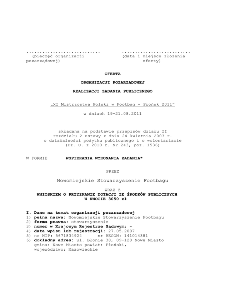 ............................ (pieczęć organizacji pozarządowej) .......................... (data i miejsce złożenia oferty) OFERTA ORGANIZACJI POZARZĄDOWEJ REALIZACJI ZADANIA PUBLICZNEGO „XI Mistrzostwa Polski w Footbag - Płońsk 2011” w dniach 19-21.08.2011 składana na podstawie przepisów działu II rozdziału 2 ustawy z dnia 24 kwietnia 2003 r. o działalności pożytku publicznego i o wolontariacie (Dz. U. z 2010 r. Nr 243, poz. 1536) W FORMIE WSPIERANIA WYKONANIA ZADANIA* PRZEZ Nowomiejskie Stowarzyszenie Footbagu WRAZ Z WNIOSKIEM O PRZYZNANIE DOTACJI ZE ŚRODKÓW PUBLICZNYCH W KWOCIE 3050 zł I. 1) 2) 3) 4) 5) 6) Dane na temat organizacji pozarządowej pełna nazwa: Nowomiejskie Stowarzyszenie Footbagu forma prawna: stowarzyszenie numer w Krajowym Rejestrze Sądowym: data wpisu lub rejestracji: 27.05.2007 nr NIP: 5671834924 nr REGON: 141014381 dokładny adres: ul. Błonie 38, 09-120 Nowe Miasto gmina: Nowe Miasto powiat: Płoński, województwo: Mazowieckie 7) tel. 663 563 222 faks: nie dotyczy e-mail: [email protected] http://www.zoska.eu 8) nazwa banku i numer rachunku: Bank Spółdzielczy w Płońsku 32 8230 0007 0201 2483 2000 0001 9) nazwiska i imiona osób upoważnionych do podpisywania umowy o wykonanie zadania publicznego: Przewodniczący Grabarczyk Jakub, Zastępca Przewodniczącego Wojtasiuk Dorota 10) nazwa, adres i telefon kontaktowy jednostki bezpośrednio wykonującej zadanie, o którym mowa w ofercie: Nowomiejskie Stowarzyszenie Footbagu, ul. Błonie 38, 09-120 nowe Miasto, tel. 663 563 222 11) osoba upoważniona do składania wyjaśnień i uzupełnień dotyczących oferty (imię i nazwisko oraz nr telefonu kontaktowego): Dorota Wojtasiuk, tel. 603 561 174 12) przedmiot działalności statutowej: a) działalność statutowa nieodpłatna § 7. Celem Stowarzyszenia jest: - Popieranie, promowanie i prowadzenie wszelkich działań związanych ze sportem Footbag, (inaczej nazywanym: Hacky sack, Zośka), który jest zbiorem zręcznościowych dyscyplin sportowych opartych na żonglowaniu, odbijaniu woreczkiem lub małą piłeczką nogami. - Wspieraniem oraz propagowaniem sportów niezależnych, ulicznych i innych dyscyplin sportowych oraz wspieranie osób i organizacji podejmujących takie działania. Wspieraniem wszelkich inicjatyw społecznych, mających na celu aktywizacje młodzieży, jak również promowaniem zdrowego trybu życia. § 8. Stowarzyszenie realizuje swoje cele poprzez: 1. organizowanie zawodów w Footbagu; 2. organizowanie bądź wspieranie lokalnych pokazów lub zawodów w Footbagu; 3. prowadzenie promocji Footbagu i innych sportów niezależnych w środkach masowego przekazu; 4. prowadzenie dystrybucji wydawnictw własnych oraz materiałów o podobnych treściach; 5. prowadzenie działalności, szkoleniowej i edukacyjnej w zakresie upowszechniania wiedzy o sporcie, również poprzez stronę internetową; 6.organizowanie wydarzeń sportowych i innych imprez kulturalnych o podobnym charakterze, w tym koncertów; 7. organizowanie kongresów, treningów, konferencji, kursów i innych spotkań służących wymianie doświadczeń kadry i personelu podmiotów działających w zakresie objętym celami stowarzyszenia: propagowanie sportu; 8. świadczenie pomocy organizacyjnej na rzecz osób fizycznych i innych podmiotów prowadzących działalność o podobnym charakterze; 9. tworzenie i udostępnianie bazy materialnej – w tym środków trwałychniezbędnej dla prowadzenia działalności statutowej 10. współprace z osobami i instytucjami krajowymi i zagranicznymi prowadzącymi działalność w zakresie objętym celami stowarzyszenia; 11.uczestniczenie w tworzeniu przedsięwzięć związanych z kulturą fizyczną; 12. inne działania realizujące cele statutowe. b) działalność statutowa odpłatna: nie dotyczy 13) jeżeli organizacja pozarządowa prowadzi gospodarczą: a) numer wpisu do rejestru przedsiębiorców, b) przedmiot działalności gospodarczej działalność Nie dotyczy II. Opis zadania 1. Nazwa zadania „XI Mistrzostwa Polski w Footbag - Płońsk 2011” 2. Miejsce wykonywania zadania Hala Sportowa Miejskiego Centrum Sportu i Rekreacji w Płońsku, ul. Kopernika 3, Kompleks Boisk “Orlik” przy Szkole Podstawowej nr 3 w Płońsku, ul. Płocka 60 Kino “Kalejdoskop” w Miejskim Centrum Kultury w Płońsku, ul. Płocka 50 3. Cel zadania ● ● ● ● ● zwiększenie liczby osób z powiatu płońskiego uprawiających zośkę/footbag; rozpowszechnienie wiedzy na temat przystępnego i atrakcyjnego sportu, jakim jest footbag; warsztaty/szkolenie dla chętnych do nauki gry w footbag; zwiększenie liczby młodych osób podejmujących samodzielne inicjatywy w kierunku rozwoju własnych zainteresowań sportowych; promocja miasta Płońska i Powiatu Płońskiego poprzez organizację zawodów sportowych wysokiej rangi; ● ● wzmocnienie więzi wśród młodych sportowców uprawiających footbag w Polsce; wyłonienie mistrzów Polski w footbag, w wielu konkurencjach. 4. Szczegółowy opis zadania /spójny z kosztorysem/ Informacje ogólne dotyczące Footbagu. Footbag jest zbiorem zręcznościowych dyscyplin sportowych polegających na podbijaniu nogami małej piłeczki, zwanej także „zośką”. Gra w „zośkę” ma w Polsce długą tradycję i pamiętają ją nawet najstarsi obywatele naszego kraju. „Zośka”, na świecie znana pod nazwą „footbag”, ma postać małej (ok. 5 cm średnicy) piłeczki uszytej z materiału, wypełnionej plastikowym granulatem. „Zośkę” w najprostszej formie gry, należy tak podbijać nogami, by nie spadła na ziemię. Na podstawie takiej aktywności powstał sport FOOTBAG. Opis Konkurencji W footbagu wyróżniamy 3 podstawowe dyscypliny: freestyle, footbag net oraz footbag golf. Najbardziej popularną dyscypliną jest freestyle, gdyż można go uprawiać praktycznie wszędzie. Potrzebna jest do tego jedynie piłeczka oraz niewielka przestrzeń – około 4 metrów kwadratowych wolnego miejsc