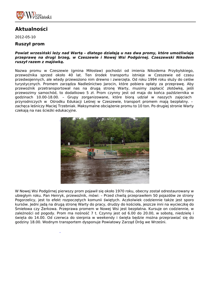 Aktualności 2012-05-10 Ruszył prom Powiat wrzesiński leży nad Wartą – dlatego działają u nas dwa promy, które umożliwiają przeprawę na drugi brzeg, w Czeszewie i Nowej Wsi Podgórnej. Czeszewski Nikodem ruszył razem z majówką. Nazwa promu w Czeszewie (gmina Miłosław) pochodzi od imienia Nikodema Przybylskiego, przewoźnika sprzed około 40 lat. Ten środek transportu istnieje w Czeszewie od czasu przedwojennych, ale wtedy przewożono nim drewno i zwierzęta. Od roku 1994 roku służy do celów turystycznych. Promem zarządza Nadleśnictwo Jarocin, które pobiera opłaty za przeprawę. Aby przewoźnik przetransportował nas na drugą stronę Warty, musimy zapłacić złotówkę, jeśli przewozimy samochód, to dodatkowo 5 zł. Prom czynny jest od maja do końca października w godzinach 10.00-18.00. – Grupy zorganizowane, które biorą udział w naszych zajęciach przyrodniczych w Ośrodku Edukacji Leśnej w Czeszewie, transport promem mają bezpłatny. – zachęca leśniczy Maciej Trzebniak. Maksymalne obciążenie promu to 10 ton. Po drugiej stronie Warty czekają na nas ścieżki edukacyjne. W Nowej Wsi Podgórnej pierwszy prom pojawił się około 1970 roku, obecny został odrestaurowany w ubiegłym roku. Pan Henryk, przewoźnik, mówi: – Przed chwilą przeprawiłem 50 pojazdów ze strony Pogorzelicy, jest to efekt rozpoczętych komunii świętych. Aczkolwiek codziennie także jest sporo kursów. Jedni jadą na drugą stronę Warty do pracy, drudzy do kościoła, jeszcze inni na wycieczkę do Śmiełowa czy Żerkowa. Przeprawa promem w Nowej Wsi jest bezpłatna. Kursuje on codziennie, w zależności od pogody. Prom ma nośność 7 t. Czynny jest od 6.00 do 20.00, w sobotę, niedzielę i święta do 14.00. Od czerwca do sierpnia w weekendy i święta będzie można przeprawiać się do godziny 18.00. Wodnym transportem dysponuje Powiatowy Zarząd Dróg we Wrześni. W powiecie przez Wartę przepływa jeszcze jeden prom – gospodarczy w Dłusku. Jednakże przepływają nim jedynie krowy na pastwisko i to tylko do końca roku, ponieważ od stycznia zostanie zlikwidowany. Hanna Fórmaniak