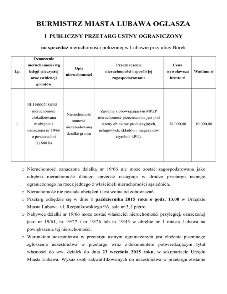 BURMISTRZ MIASTA LUBAWA OGŁASZA I PUBLICZNY PRZETARG USTNY OGRANICZONY na sprzedaż nieruchomości położonej w Lubawie przy ulicy Borek Oznaczenie nieruchomości wg Lp. księgi wieczystej oraz ewidencji Opis nieruchomości Przeznaczenie Cena nieruchomości i sposób jej wywoławcza zagospodarowania brutto zł Wadium zł gruntów EL1I/00024863/8 – nieruchomość zlokalizowana 1. w obrębie 1 oznaczona nr 19/66 o powierzchni Nieruchomość stanowi niezabudowaną działkę gruntu Zgodnie z obowiązującym MPZP nieruchomość przeznaczona jest pod tereny obiektów produkcyjnych, 78.000,00 10.000,00 usługowych, składów i magazynów (symbol 4.PU). 0,1688 ha o Nieruchomość oznaczona działką nr 19/66 nie może zostać zagospodarowana jako odrębna nieruchomość dlatego sprzedaż następuje w drodze przetargu ustnego ograniczonego na rzecz jednego z właścicieli nieruchomości sąsiednich. o Nieruchomość nie posiada obciążeń i jest wolna od zobowiązań. o Przetarg odbędzie się w dniu 1 października 2015 roku o godz. 13.00 w Urzędzie Miasta Lubawa ul. Rzepnikowskiego 9A, sala nr 3, I piętro. o Nabywcą działki nr 19/66 może zostać właściciel nieruchomości przyległej, oznaczonej jako nr 19/61, nr 19/27 i nr 19/26 lub nr 19/43 w obrębie nr 1 miasta Lubawa na powiększenie tej nieruchomości. o Warunkiem uczestnictwa w przetargu ustnym ograniczonym jest złożenie pisemnego zgłoszenia uczestnictwa w przetargu wraz z dokumentem potwierdzającym tytuł własności do ww. działek do dnia 23 września 2015 roku, w sekretariacie Urzędu Miasta Lubawa. Wykaz osób zakwalifikowanych do uczestnictwa w przetargu zostanie wywieszony na tablicy ogłoszeń Urzędu Miasta Lubawa najpóźniej do dnia 30 września 2015 roku. o Przetarg jest ważny bez względu na ilość uczestników, jeśli choć jeden uczestnik zaoferuje cenę wyższą od ceny wywoławczej. Wysokość postąpienia nie może być mniejsza niż 1% ceny wywoławczej z zaokrągleniem w górę do pełnych dziesiątek złotych i zostanie ustalona z uczestnikami przetargu. o Osoby biorące udział w przetargu zobowiązane są wpłacić wadium w podanej wyżej wysokości przelewem na konto Urzędu Miasta Lubawa - Bank Spółdzielczy Lubawa Nr 89 8832 0001 1001 0000 0332 0004. Wadium powinno znajdować się na koncie Urzędu Miasta najpóźniej do dnia 28 września 2015 roku. o Wadium wpłacone przez uczestnika przetargu, który przetarg wygrał, zostanie zaliczone na poczet ceny nabycia nieruchomości. o Wadium przepada w przypadku uchylenia się wygrywającego przetarg od zawarcia umowy notarialnej. o Cena nieruchomości osiągnięta w drodze przetargu pomniejszona o wpłacone wadium płatna jest w całości przed zawarciem umowy notarialnej, najpóźniej w ciągu 21 dni od dnia przetargu. o Burmistrz Miasta Lubawa może odwołać przetarg z uzasadnionych przyczyn. o Koszty sporządzenia umowy notarialnej oraz opłaty sądowe związane z dokonaniem wpisów w księdze wieczystej ponosi nabywca. o Ogłoszenie o przetargu podaje się do publicznej wiadomości poprzez wywieszenie w siedzibie Urzędu Miasta Lubawa przy ul. Rzepnikowskiego 9a, na stronie internetowej www.lubawa.pl oraz w BIP Urzędu Miasta http://lubawa.bip-wm.pl. o Dodatkowe informacje o nieruchomości można uzyskać w Urzędzie Miasta Lubawa, ul. Rzepnikowskiego 9a, pok. nr 8, I piętro, tel. 89 645 53 00. Burmistrz Miasta Lubawa /-/ mgr Maciej Radtke Lubawa, dnia 20 sierpnia 2015 roku Wywieszono dnia 20 sierpnia 2015 roku Zdjęto dnia ………………........... 2015 roku