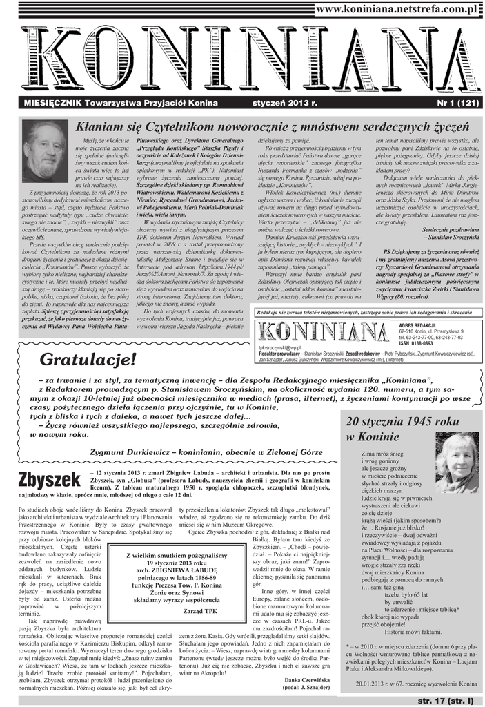 www.koniniana.netstrefa.com.pl MIESIĘCZNIK Towarzystwa Przyjaciół Konina styczeń 2013 r. Nr 1 (121) Kłaniam się Czytelnikom noworocznie z mnóstwem serdecznych życzeń Myślę, że w końcu te moje życzenia zaczną się spełniać (uniknęliśmy wszak cudem końca świata więc to już prawie czas najwyższy na ich realizację). Z przyjemnością donoszę, że rok 2013 postanowiliśmy dedykować mieszkańcom naszego miasta – stąd, często będziecie Państwo postrzegać nadtytuły typu „cudze chwalicie, swego nie znacie”, „zwykli – niezwykli” oraz oczywiście znane, sprawdzone wywiady niejakiego StS. Przede wszystkim chcę serdecznie podziękować Czytelnikom za nadesłane różnymi drogami życzenia i gratulacje z okazji dziesięciolecia „Koninianów”. Proszę wybaczyć, że wybiorę tylko nieliczne, najbardziej charakterystyczne i te, które musiały przebyć najdłuższą drogę – redaktorzy kłaniają się po staropolsku, nisko, czapkami (szkoda, że bez piór) do ziemi. To naprawdę dla nas najcenniejsza zapłata. Spieszę z przyjemnością i satysfakcją przekazać, że jako pierwsze dotarły do nas życzenia od Wydawcy Pana Wojciecha Pluta- Gratulacje! Plutowskiego oraz Dyrektora Generalnego „Przeglądu Konińskiego” Staszka Piguły i oczywiście od Koleżanek i Kolegów Dziennikarzy (otrzymaliśmy je oficjalnie na spotkaniu opłatkowym w redakcji „PK”). Natomiast wybrane życzenia zamieszczamy poniżej. Szczególne dzięki składamy pp. Romualdowi Wiatrowskiemu, Waldemarowi Kozickiemu z Niemiec, Ryszardowi Grundmanowi, Jackowi Pobojewskiemu, Marii Polniak-Dominiak i wielu, wielu innym. W wydaniu styczniowym znajdą Czytelnicy obszerny wywiad z niegdysiejszym prezesem TPK doktorem Jerzym Nawrotkiem. Wywiad powstał w 2009 r. a został przeprowadzony przez warszawską dziennikarkę dokumentalistkę Małgorzatę Bramę i znajduje się w Internecie pod adresem http://ahm.1944.pl/ Jerzy%20Antoni_Nawrotek/7. Za zgodą i wiedzą doktora zachęcam Państwa do zapoznania się z wywiadem oraz namawiam do wejścia na stronę internetową. Znajdziemy tam doktora, jakiego nie znamy, a znać wypada. Do tych wojennych czasów, do momentu wyzwolenia Konina, tradycyjnie już, powraca w swoim wierszu Jagoda Naskręcka – pięknie dziękujemy za pamięć. Również z przyjemnością będziemy w tym roku przedstawiać Państwu dawne „gorące ujęcia reporterskie” znanego fotografika Ryszarda Fórmanka z czasów „rodzenia” się nowego Konina. Ryszardzie, witaj na pokładzie „Koninianów”. Włodek Kowalczykiewicz (mł.) dumnie ogłasza wszem i wobec, iż koninianie zaczęli używać roweru na długo przed wybudowaniem ścieżek rowerowych w naszym mieście. Warto przeczytać – „delikatniej” już nie można walczyć o ścieżki rowerowe. Damian Kruczkowski przedstawia wzruszającą historię „zwykłych – niezwykłych”. I ja byłem nieraz tym kupującym, ale dopiero opis Damiana rozwinął właściwy kawałek zapomnianej „taśmy pamięci”. Wzruszył mnie bardzo artykulik pani Zdzisławy Olejniczak opisującej tak ciepło i osobiście „ostatni ukłon komina” nieistniejącej już, niestety, cukrowni (co prawda na ten temat napisaliśmy prawie wszystko, ale pozwólmy pani Zdzisławie na to ostatnie, piękne pożegnanie). Gdyby jeszcze dzisiaj istniały tak mocne związki pracownika z zakładem pracy? Dołączam wiele serdeczności do pięknych rocznicowych „laurek” Mirka Jurgielewicza skierowanych do Mirki Dimitrow oraz Józka Szyka. Przykro mi, że nie mogłem uczestniczyć osobiście w uroczystościach, ale kwiaty przesłałem. Laureatom raz jeszcze gratuluję. Serdecznie pozdrawiam – Stanisław Sroczyński PS Dziękujemy za życzenia oraz również i my gratulujemy naszemu Asowi przestworzy Ryszardowi Grundmanowi otrzymania nagrody specjalnej za „Ikarowe strofy” w konkursie jubileuszowym poświęconym zwycięstwu Franciszka Żwirki i Stanisława Wigury (80. rocznica). Redakcja nie zwraca tekstów niezamówionych, zastrzega sobie prawo ich redagowania i skracania ADRES REDAKCJI: 62-510 Konin, ul. Przemys³owa 9 tel. 63-243-77-00, 63-243-77-03 ISSN 0138-0893 [email protected] Redaktor prowadzący – Stanisław Sroczyński, Zespół redakcyjny – Piotr Rybczyński, Zygmunt Kowalczykiewicz (st), Jan Sznajder, Janusz Gulczyński, Włodzimierz Kowalczykiewicz (mł), (Internet) – za trwanie i za styl, za tematyczną inwencję – dla Zespołu Redakcyjnego miesięcznika „Koniniana”, z Redaktorem prowadzącym p. Stanisławem Sroczyńskim, na okoliczność wydania 120. numeru, a tym samym z okazji 10-letniej już obecności miesięcznika w mediach (prasa, iIternet), z życzeniami kontynuacji po wsze czasy pożytecznego dzieła łączenia przy ojczyźnie, tu w Koninie, tych z bliska i tych z daleka, a nawet tych jeszcze dalej... – Życzę również wszystkiego najlepszego, szczególnie zdrowia, w nowym roku. 20 stycznia 1945 roku w Koninie Zygmunt Durkiewicz – koninianin, obecnie w Zielonej Górze Zbyszek – 12 stycznia 2013 r. zmarł Zbigniew Łabuda – architekt i urbanista. Dla nas po prostu Zbyszek, syn „Globusa” (profesora Łabudy, nauczyciela chemii i geografii w konińskim liceum). Z tableau maturalnego 1950 r. spogląda chłopaczek, szczuplutki blondynek, najmłodszy w klasie, oprócz mnie, młodszej od niego o całe 12 dni. Po studiach oboje wróciliśmy do Konina. Zbyszek pracował ty przesiedlenia lokatorów. Zbyszek tak długo „molestował” jako architekt i urbanista w wydziale Architektury i Planowania władze, aż zgodzono się na rekonstrukcję zamku. Do dziś Przestrzennego w Koninie. Były to czasy gwałtownego mieści się w nim Muzeum Okręgowe. rozwoju miasta. Pracowałam w Sanepidzie. Spotykaliśmy się Ojciec Zbyszka pochodził z gór, dokładniej z Białki nad przy odbiorze kolejnych bloków Białką. Byłam tam kiedyś ze mieszkalnych. Częste usterki Zbyszkiem. – „Chodź – powiebudowla