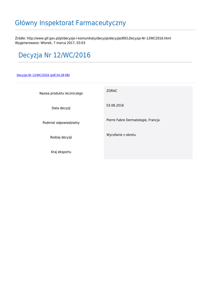 Główny Inspektorat Farmaceutyczny Źródło: http://www.gif.gov.pl/pl/decyzje-i-komunikaty/decyzje/decyzje/893,Decyzja-Nr-12WC2016.html Wygenerowano: Wtorek, 7 marca 2017, 03:03 Decyzja Nr 12/WC/2016 Decyzja Nr 12/WC/2016 (pdf,54.28 KB) Nazwa produktu leczniczego Data decyzji Podmiot odpowiedzialny Rodzaj decyzji Kraj eksportu ZORAC 03.06.2016 Pierre Fabre Dermatologie, Francja Wycofanie z obrotu