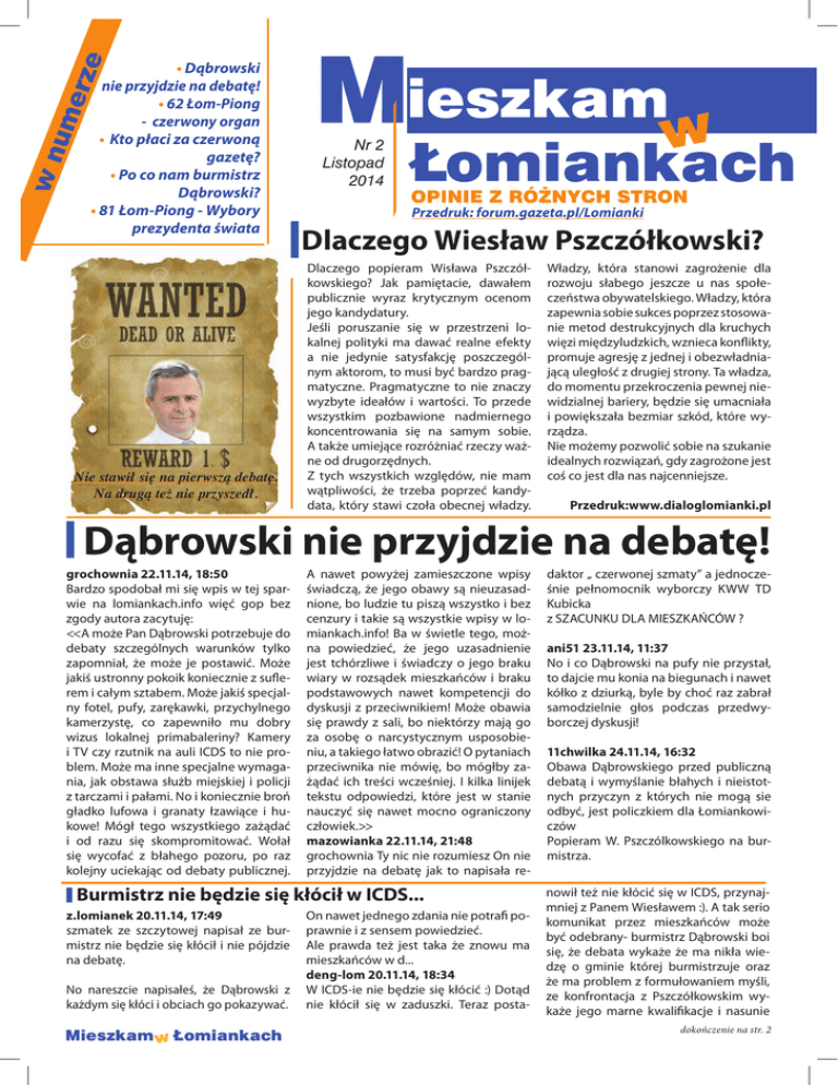 • Dąbrowski nie przyjdzie na debatę! • 62 Łom-Piong - czerwony organ • Kto płaci za czerwoną gazetę? • Po co nam burmistrz Dąbrowski? • 81 Łom-Piong - Wybory prezydenta świata Nie stawił się na pierwszą debatę. Na drugą też nie przyszedł. Nr 2 Listopad 2014 Przedruk: forum.gazeta.pl/Lomianki Dlaczego Wiesław Pszczółkowski? Dlaczego popieram Wisława Pszczółkowskiego? Jak pamiętacie, dawałem publicznie wyraz krytycznym ocenom jego kandydatury. Jeśli poruszanie się w przestrzeni lokalnej polityki ma dawać realne efekty a nie jedynie satysfakcję poszczególnym aktorom, to musi być bardzo pragmatyczne. Pragmatyczne to nie znaczy wyzbyte ideałów i wartości. To przede wszystkim pozbawione nadmiernego koncentrowania się na samym sobie. A także umiejące rozróżniać rzeczy ważne od drugorzędnych. Z tych wszystkich względów, nie mam wątpliwości, że trzeba poprzeć kandydata, który stawi czoła obecnej władzy. Władzy, która stanowi zagrożenie dla rozwoju słabego jeszcze u nas społeczeństwa obywatelskiego. Władzy, która zapewnia sobie sukces poprzez stosowanie metod destrukcyjnych dla kruchych więzi międzyludzkich, wznieca konflikty, promuje agresję z jednej i obezwładniającą uległość z drugiej strony. Ta władza, do momentu przekroczenia pewnej niewidzialnej bariery, będzie się umacniała i powiększała bezmiar szkód, które wyrządza. Nie możemy pozwolić sobie na szukanie idealnych rozwiązań, gdy zagrożone jest coś co jest dla nas najcenniejsze. Przedruk:www.dialoglomianki.pl Dąbrowski nie przyjdzie na debatę! grochownia 22.11.14, 18:50 Bardzo spodobał mi się wpis w tej sparwie na lomiankach.info więć gop bez zgody autora zacytuję: <<A może Pan Dąbrowski potrzebuje do debaty szczególnych warunków tylko zapomniał, że może je postawić. Może jakiś ustronny pokoik koniecznie z suflerem i całym sztabem. Może jakiś specjalny fotel, pufy, zarękawki, przychylnego kamerzystę, co zapewniło mu dobry wizus lokalnej primabaleriny? Kamery i TV czy rzutnik na auli ICDS to nie problem. Może ma inne specjalne wymagania, jak obstawa służb miejskiej i policji z tarczami i pałami. No i koniecznie broń gładko lufowa i granaty łzawiące i hukowe! Mógł tego wszystkiego zażądać i od razu się skompromitować. Wołał się wycofać z błahego pozoru, po raz kolejny uciekając od debaty publicznej. A nawet powyżej zamieszczone wpisy świadczą, że jego obawy są nieuzasadnione, bo ludzie tu piszą wszystko i bez cenzury i takie są wszystkie wpisy w lomiankach.info! Ba w świetle tego, można powiedzieć, że jego uzasadnienie jest tchórzliwe i świadczy o jego braku wiary w rozsądek mieszkańców i braku podstawowych nawet kompetencji do dyskusji z przeciwnikiem! Może obawia się prawdy z sali, bo niektórzy mają go za osobę o narcystycznym usposobieniu, a takiego łatwo obrazić! O pytaniach przeciwnika nie mówię, bo mógłby zażądać ich treści wcześniej. I kilka linijek tekstu odpowiedzi, które jest w stanie nauczyć się nawet mocno ograniczony człowiek.>> mazowianka 22.11.14, 21:48 grochownia Ty nic nie rozumiesz On nie przyjdzie na debatę jak to napisała re- Burmistrz nie będzie się kłócił w ICDS... z.lomianek 20.11.14, 17:49 szmatek ze szczytowej napisał ze burmistrz nie będzie się kłócił i nie pójdzie na debatę. No nareszcie napisałeś, że Dąbrowski z każdym się kłóci i obciach go pokazywać. On nawet jednego zdania nie potrafi poprawnie i z sensem powiedzieć. Ale prawda też jest taka że znowu ma mieszkańców w d... deng-lom 20.11.14, 18:34 W ICDS-ie nie będzie się kłócić :) Dotąd nie kłócił się w zaduszki. Teraz posta- daktor „ czerwonej szmaty” a jednocześnie pełnomocnik wyborczy KWW TD Kubicka z SZACUNKU DLA MIESZKAŃCÓW ? ani51 23.11.14, 11:37 No i co Dąbrowski na pufy nie przystał, to dajcie mu konia na biegunach i nawet kółko z dziurką, byle by choć raz zabrał samodzielnie głos podczas przedwyborczej dyskusji! 11chwilka 24.11.14, 16:32 Obawa Dąbrowskiego przed publiczną debatą i wymyślanie błahych i nieistotnych przyczyn z których nie mogą sie odbyć, jest policzkiem dla Łomiankowiczów Popieram W. Pszczólkowskiego na burmistrza. nowił też nie kłócić się w ICDS, przynajmniej z Panem Wiesławem :). A tak serio komunikat przez mieszkańców może być odebrany- burmistrz Dąbrowski boi się, że debata wykaże że ma nikła wiedzę o gminie której burmistrzuje oraz że ma problem z formułowaniem myśli, ze konfrontacja z Pszczółkowskim wykaże jego marne kwalifikacje i nasunie dokończenie na str. 2 Burmistrz nie będzie się kłócił w ICDS... dokończenie ze str. 1 przypuszczenie że to nie burmistrz TD rządzi gminą, a ktoś inny :). Zła decyzja, bo mieszkańcy mają prawo do informacji i możliwości bezpośredniego poznania poglądów kandydatów. marcinek005 20.11.14, 22:19 Mam prawo oczekiwać od przyszłego burmistrza mojego miasta opłacanego z naszych pieniędzy, żeby zaprezentował wizję rozwoju Łomianek. To jest obowiązek takiej osoby a nie łaska. Debata jest konieczna. Chcę mieć możliwość porównania obu kandydatów. Chcę mieć możliwość świadomego wyboru kandydata, który będzie mi bardziej odpowiadał. grom.z.lomianek 20.11.14, 22:36 Zwracam Ci uwagę, że to nie z portalem lomianki.info kandydat na burmistrza ma dyskutować tylko zaprezentować sie przed wyborcami. I co powiedział Dąbrowski mieszkańcom „spadaj na drzewo”. Takiego aroganta to jeszcze nie było. marmit1 21.11.14, 10:55 No trudno. Osobiście wolałbym debatę, zawsze to coś ciekawego we wsi Łomianki. Na debatę radnych w mojej wsi przyszła garstka osób, ale zabieram córkę, żeby pokazać na czym polega demokracja, polityka, itp. Ja od polityki się trzymam z daleka, ale może moje dzieci będą chciały wziąć sprawę w swoje ręce, jak mówił Wałęsa, i to powiedzenie podoba mi się. Grochówki te