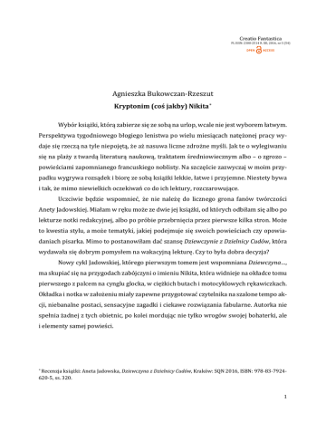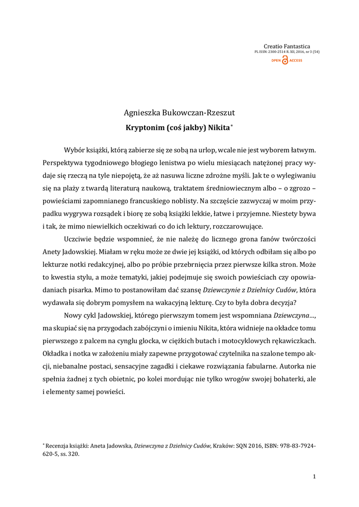 Creatio Fantastica PL ISSN: 2300-2514 R. XII, 2016, nr 3 (54) Agnieszka Bukowczan-Rzeszut Kryptonim (coś jakby) Nikita ∗ Wybór książki, którą zabierze się ze sobą na urlop, wcale nie jest wyborem łatwym. Perspektywa tygodniowego błogiego lenistwa po wielu miesiącach natężonej pracy wydaje się rzeczą na tyle niepojętą, że aż nasuwa liczne zdrożne myśli. Jak te o wylegiwaniu się na plaży z twardą literaturą naukową, traktatem średniowiecznym albo – o zgrozo – powieściami zapomnianego francuskiego noblisty. Na szczęście zazwyczaj w moim przypadku wygrywa rozsądek i biorę ze sobą książki lekkie, łatwe i przyjemne. Niestety bywa i tak, że mimo niewielkich oczekiwań co do ich lektury, rozczarowujące. Uczciwie będzie wspomnieć, że nie należę do licznego grona fanów twórczości Anety Jadowskiej. Miałam w ręku może ze dwie jej książki, od których odbiłam się albo po lekturze notki redakcyjnej, albo po próbie przebrnięcia przez pierwsze kilka stron. Może to kwestia stylu, a może tematyki, jakiej podejmuje się swoich powieściach czy opowiadaniach pisarka. Mimo to postanowiłam dać szansę Dziewczynie z Dzielnicy Cudów, która wydawała się dobrym pomysłem na wakacyjną lekturę. Czy to była dobra decyzja? Nowy cykl Jadowskiej, którego pierwszym tomem jest wspomniana Dziewczyna…, ma skupiać się na przygodach zabójczyni o imieniu Nikita, która widnieje na okładce tomu pierwszego z palcem na cynglu glocka, w ciężkich butach i motocyklowych rękawiczkach. Okładka i notka w założeniu miały zapewne przygotować czytelnika na szalone tempo akcji, niebanalne postaci, sensacyjne zagadki i ciekawe rozwiązania fabularne. Autorka nie spełnia żadnej z tych obietnic, po kolei mordując nie tylko wrogów swojej bohaterki, ale i elementy samej powieści. Recenzja książki: Aneta Jadowska, Dziewczyna z Dzielnicy Cudów, Kraków: SQN 2016, ISBN: 978-83-7924620-5, ss. 320. ∗ 1 Pierwszym denatem jest akcja, która może i byłaby wartka, gdyby nie psuły jej re- trospekcje bohaterki i rozbudowane opisy jej stanów psychicznych. Nikita, jak na lodo- watą zabójczynię jest dość mocno rozchwiana emocjonalnie, o czym szerzej za chwilę. Wi- dać to najlepiej na przykładzie jej relacji z nowym partnerem, którego opisuje jako „szcze- niaka wychowanego przez bibliotekarkę”, ciśniętego jej na pożarcie „chłopca, który właśnie dowiedział się, że Święty Mikołaj nie istnieje” (s. 81). Drugie morderstwo, tym razem masowe, autorka popełnia na bohaterach, którzy może i byliby intrygujący, gdyby nie byli – no właśnie – sztampowi (może poza Fotografem). Główna bohaterka to złamana psychicznie, nieufna, agresywna i niedojrzała emo- cjonalnie młoda kobieta z niemożliwie dysfunkcyjnej rodziny. Jest odludkiem, nie ma bli- skich ani przyjaciół, a nieszczęśliwa miłość wywołała u niej potężne załamanie emocjonalne. Do swoich gości na powitanie strzela, najbardziej komfortowy poziom rozmowy według niej to taki, gdy trzyma ręce zaciśnięte na czyimś gardle, ale mimo to potrafi się rozkleić nad przygotowanym dla siebie posiłkiem. Włada tajemniczą magią, co pieczołowicie ukrywa, w wolnym czasie wyciska siódme poty na treningach, a także bez konse- kwencji dla swojej figury je czterokrotnie więcej niż zwykły człowiek, co autorka podkre- śla na tyle często, że czytelnik ma wrażenie, jakoby było to największe marzenie współczesnych trzydziestolatek. Oczywiście w ramach pieczołowicie pielęgnowanego wize- runku musi być przy tym wszystkim lesbijką oraz zdeklarowaną feministką, zresztą „jak każda myśląca kobieta, która nie widzi powodu, by część ludzkości była traktowana gorzej tylko dlatego, że ma pochwę, a nie penisa” (s. 101). Buńczuczna i arogancka Nikita przyrównuje się kilkukrotnie do bohaterki kultowego filmu Luca Bessona, lecz jej opinie i deklaracje nie mają najmniejszego pokrycia w rzeczywistości. Dlaczego? Wykreowana na lodowatą zabójczynię i skrajną egoistkę postępuje empatycznie i altruistycznie, a w jej odruchach brak instynktu samozachowawczego i nieczułości na los innych, czego można by oczekiwać po jej fachu. Nikita demonstruje wspomnianą empatię wobec byłego kolegi, którego ratuje po akcji, wobec nieznajomego, którego przyjmuje pod swój dach, wreszcie wobec porwanej prostytutki z tytułowej Dzielnicy Cudów. Jest to poważny mankament w przypadku tej postaci, bo choć Jadowska z pewnością chciała swoją bohaterkę rozwi- nąć, by wydobyć z okaleczonej fizycznie i psychicznie kobiety głęboko w niej tkwiące po- kłady dobra i pragnienia bliskości, to efekt budzi w najlepszym razie konsternację. Czy- telnik otrzymuje postać niespójną, a na podstawie jej licznych monologów tworzy sobie 2 obraz wyrachowanej twardzielki tylko po to, by za chwilę dziwić się jej reakcjom i decy- zjom. w dodatku nieustanne rozterki Nikity, czy ma zaakceptować swojego nowego, dziw- nego partnera, czy może go zabić, które przewijają się niczym mantra przez całą powieść, są niemal równie drażniące, co przerysowane komentarze na temat pełnego brutalności i agresji życia, jakie wiedzie bohaterka: Ewidentnie miał życzenie umrzeć albo wyciągnęli go z jakiejś kolonii amiszów i nie wiedział, że w tym miejscu patrzysz komuś w oczy i się uśmiechasz, tylko jeśli już trzymasz nóż w jego bebechach lub w każdej sekundzie jesteś gotowy go tam wsadzić (s. 11). Kolejnym nieudanym bohaterem jest wykreowany na tajemniczego mężczyzna, który niczym burza wkracza w życie Nikity, wzbudzając całkowicie uzasadnione obawy i podejrzenia. Nie ma w sobie nic intrygującego, nie stanowi także dla swojej partnerki oczekiwanej przeciwwagi – ot, brodaty piękniś w typie „drwaloseksualnym”, taki łagodny dryblas. Bezbarwny, uroczy i naiwny, nieporadny w brutalnym świecie, w którym ona żyje, wydaje się u jej bo