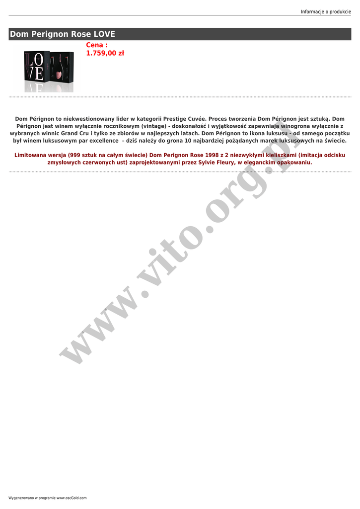 Informacje o produkcie Dom Perignon Rose LOVE Cena : 1.759,00 zł pl Dom Pérignon to niekwestionowany lider w kategorii Prestige Cuvée. Proces tworzenia Dom Pérignon jest sztuką. Dom Pérignon jest winem wyłącznie rocznikowym (vintage) - doskonałość i wyjątkowość zapewniają winogrona wyłącznie z wybranych winnic Grand Cru i tylko ze zbiorów w najlepszych latach. Dom Pérignon to ikona luksusu - od samego początku był winem luksusowym par excellence – dziś należy do grona 10 najbardziej pożądanych marek luksusowych na świecie. w w w .v it o. or g. Limitowana wersja (999 sztuk na całym świecie) Dom Perignon Rose 1998 z 2 niezwykłymi kieliszkami (imitacja odcisku zmysłowych czerwonych ust) zaprojektowanymi przez Sylvie Fleury, w eleganckim opakowaniu. Wygenerowano w programie www.oscGold.com