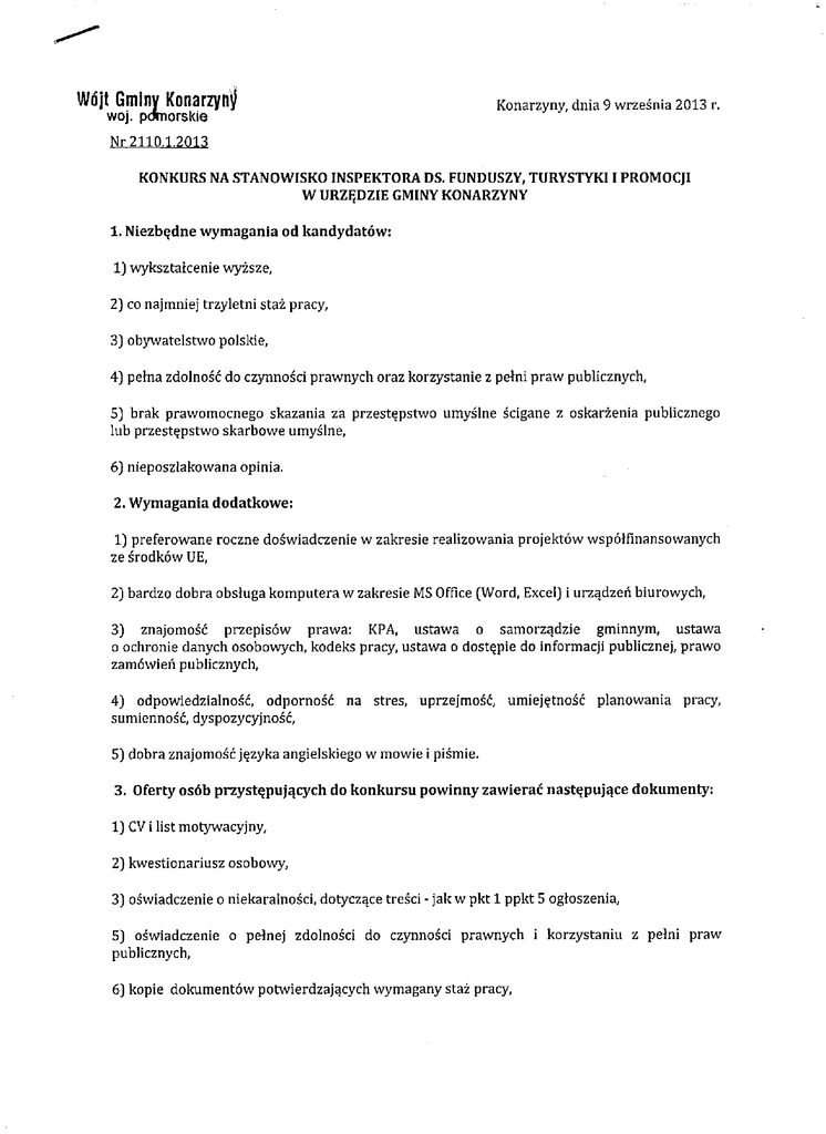 WÓjt Gminy Konarzyn Konarzyny, dnia 9 września 2013 r. woj. pomorskie Nr 2110.1.2013 KONKURS NA STANOWISKO INSPEKTORA DS. FUNDUSZY, TURYSTYKI I PROMOCJI W URZĘDZIE GMINY KONARZYNY 1. Niezbędne wymagania od kandydatów: 1] wykształcenie wyższe, 2) co najmniej trzyletni staż pracy, 3) obywatelstwo polskie, 4) pełna zdolność do czynności prawnych oraz korzystanie z pełni praw publicznych, 5) brak prawomocnego skazania za przestępstwo umyślne ścigane z oskarżenia publicznego lub przestępstwo skarbowe umyślne, 6) nieposzlakowana opinia. 2. Wymagania dodatkowe: 1) preferowane roczne doświadczenie w zakresie realizowania projektów współfinansowanych ze środków UE, 2] bardzo dobra obsługa komputera w zakresie MS Office (Word, Excel) i urządzeń biurowych, 3) znajomość przepisów prawa: KPA, ustawa o samorządzie gminnym, ustawa o ochronie danych osobowych, kodeks pracy, ustawa o dostępie do informacji publicznej, prawo zamówień publicznych, 4) odpowiedzialność, odporność sumienność, dyspozycyjność, na stres, uprzejmość, umiejętność planowania pracy, 5) dobra znajomość języka angielskiego w mowie i piśmie. 3. Oferty osób przystępujących do konkursu powinny zawierać następujące dokumenty: 1) CV i list motywacyjny, 2) kwestionariusz osobowy, 3) oświadczenie o niekaralności, dotyczące treści - jak w pkt 1 ppkt 5 ogłoszenia, 5) oświadczenie o pełnej zdolności do czynności prawnych i korzystaniu z pełni praw publicznych, 6) kopie dokumentów potwierdzających wymagany staż pracy, 7) kopie dyplomu ukończenia studiów wyższych i dokumentów potwierdzających dodatkowe kwalifikacje, 8) Pisemne oświadczenie o korzystaniu z pełni prac publicznych, 9) Pisemne oświadczenie lub zaświadczenie o niekaralności za przestępstwo umyślnie ścigane z oskarżenia publicznego lub umyślne przestępstwo skarbowe 10) Oświadczenie ani dyscyplinarne kandydata, że nie toczy się przeciwko 11) aktualne zaświadczenie lekarskie o do wykonywania pracy na stanowisku inspektora braku niemu postępowanie przeciwwskazań karne zdrowotnych 12) oświadczenie, że kandydat wyraża zgodę na przetwarzanie swoich danych osobowych zgodnie z ustawą z dnia 29 sierpnia 1997 roku o ochronie danych osobowych (Dz. U. z 2002 r. Nr 101, poz. 926 ze zm.), 13) osoby niepełnosprawne - kopię dokumentu potwierdzającego niepełnosprawność, jeżeli zamierzają skorzystać z uprawnienia, o którym mowa w art. 13a ust. 2 ustawy z dnia 21 listopada 2008 r. o pracownikach samorządowych (Dz. U. Nr 223, poz. 1458 ze zm.), Uwaga: wszelkie dokumenty za zgodność z oryginałem. 4. złożone w postaci kopii muszą być potwierdzone Zakres zadań wykonywanych na stanowisku. 1) wyszukiwanie odpowiednich programów dla celów i potrzeb gminy oraz przygotowywanie aplikacji o pozyskanie środków pomocowych z funduszy unijnych oraz funduszy krajowych; 2) udział w przygotowaniu projektów i dokumentacji inwestycji; 3) zarządzanie projektami inwestycji realizowanymi na terenie gminy, w tym finansowanymi z funduszy pomocowych oraz ich rozliczanie; 4) opracowywanie programów rozwoju gminy, a także programów operacyjnych dotyczących wsparcia z funduszy zewnętrznych; 5) inicjowanie, współpraca oraz realizacja projektów partnerskich; 6) prowadzenie monitoringu realizacji Strategii Gminy Konarzyny i innych programów; 7) prowadzenie spraw związanych z zamówieniami publicznymi dotyczącymi zadań dofinansowanych z funduszy zewnętrznych wraz z przygotowaniem i prowadzeniem dokumentacji przetargowych; 8) przygotowywanie tekstów promocyjnych na potrzeby gminy; 9) organizacja, koordynacja, weryfikacja i realizacja działań promocyjnych gminy; 10) współpraca z innymi jednostkami realizującymi działania promocyjne; 11) opracowywanie programów i kierunków rozwoju turystyki i wypoczynku na terenie gminy; 12) wykonywanie i koordynowanie wszystkich zadań związanych z turystyką; 13) współdziałanie z wszystkimi instytucjami i organizacjami prowadzącymi działalność turystyczną; 14) opracowywanie materiałów do publikacji na stronie internetowej gminy z zakresu turystyki i promocji; 15) wykonywanie innych zadań zleconych przez Wójta Gminy Konarzyny. 5. Uwaga: Umowa zostanie zawarta na czas określony. 6. Warunki pracy na stanowisku. 1) Praca posiada charakter administracyjno-biurowy i zaliczana jest do prac lekkich pod względem obciążenia fizycznego. Pracownicy nie są narażeni na występowanie uciążliwych i szkodliwych czynników. 2) Główna część pracy wykonywana jest w siedzibie Urzędu Gminy Konarzyny, w godzinach - od 7.30 do 15.30. 3) Wyjazdy służbowe związane są przede wszystkim z uczestnictwem w szkoleniach, kursach podwyższających kwalifikacje zawodowe. Na stanowisku wykorzystywany jest niezbędny sprzęt komputerowy i biurowy - komputery stacjonarne, monitory, drukarki, kserokopiarki, niszczarki, itp. 7. Informacja dotycząca wskaźnika zatrudnienia osób niepełnosprawnych w jednostce. Wskaźnik zatrudnienia osób niepełnosprawnych, w rozumieniu przepisów o rehabilitacji zawodowej i społecznej oraz zatrudnianiu osób niepełnosprawnych w miesiącu poprzedzającym datę upublicznienia ogłoszenia o naborze był niższy niż 6 %. 8. Miejsce i termin złożenia dokumentów. Wymagane dokumenty należy złożyć osobiście w sekretariacie Urzędu Gminy Konarzyny lub przesłać na adres Urzędu Gminy Konarzyny, ul. Szkolna 7, 89- 607 Konarzyny w zamkniętej kopercie z dopiskiem: „Nabór na stanowisko inspektora ds. funduszy, turystyki i promocji" do dnia 24 września 2013 r. do godz. 15.00.0 zachowaniu terminu decyduje data wpływu do urzędu. 9. Informacje dodatkowe 1) Aplikacje, które wpłyną do Urzędu niekompletne lub po upływie wskazanego wyżej terminu nie będą rozpatrywane. 2) Lista kandydatów, którzy spełnili wymagania formalne i tym samym zakwalifikowane zostały do postępowania konkursowego zostanie ogłoszona w Biuletynie info