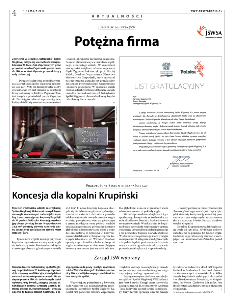 4 w w w.now ygornik.pl 1–15 M a j a 2 013 a k t u a l n o ś c i jubileusz 20-lecia JSW Potężna firma 2 kwietnia w siedzibie Jastrzębskiej Spółki Węglowej odbyła się uroczystość z okazji jubileuszu 20-lecia JSW. Zaproszonych gości przywitali Jarosław Zagórowski, prezes zarządu JSW, oraz Józef Myrczek, przewodniczący rady nadzorczej. Materiały Prasowe jsw – Dwadzieścia lat temu pomysł utworzenia Jastrzębskiej Spółki Węglowej odbierano jako żart. Miło mi dzisiaj powitać osoby, dzięki którym ten żart zamienił się w potężną firmę notowaną na Giełdzie Papierów Wartościowych – powiedział prezes Zagórowski. Później głos zabierali zaproszeni goście, którzy dzielili się swoimi wspomnieniami i życzyli obecnemu zarządowi sukcesów. Po części oficjalnej wszyscy zasiedli do wspólnego, uroczystego obiadu. W kameralnej uroczystości wzięli udział m.in. wojewoda śląski Zygmunt Łukaszczyk, prof. Maciej Kaliski, Dyrektor Departamentu Górnictwa Ministerstwa Gospodarki, który przekazał na ręce prezesa zarządu list gratulacyjny od Janusza Piechocińskiego, wicepremiera i ministra gospodarki. W spotkaniu wzięli również udział członkowie dotychczasowych zarządów oraz rad nadzorczych Jastrzębskiej Spółki Węglowej, obecni dyrektorzy kopalń i dyrektorzy biura zarządu. l Przedłużone życie o kilkanaście lat Koncesja dla kopalni Krupiński Minister środowiska udzielił Jastrzębskiej Spółce Węglowej SA koncesji na wydobywanie węgla kamiennego i metanu jako kopaliny towarzyszącej przez kopalnię Krupiński do 31 grudnia 2030 roku. Koncesją został objęty obszar górniczy Suszec IV o powierzchni 33,8 km2 położony głównie na terenie gminy Suszec oraz częściowo na terenie miast Orzesze i Żory. Tym samym wygasła koncesja przyznana kopalni w 1994 roku na wydobywanie węgla do końca 2015 roku. Powierzchnia dotychczasowego obszaru górniczego wynosiła 27,6 km2. O nową koncesję kopalnia ubiegała się nie tylko ze względu na upływający termin jej ważności, ale także z powodu udokumentowania nowych zasobów węgla w złożu, powiększenia obszaru górniczego o tereny znajdujące się na północ i wschód od aktualnego obszaru górniczego i zmianę głębokości dokumentowania złoża z 1020 do 1220 metrów, co umożliwi jej kontynuowanie działalności wydobywczej przez kolejnych kilkanaście lat. Wielkość zasobów operatywnych (możliwych do wydobycia) węgla kamiennego w obszarze objętym koncesją szacowana jest na 48,8 mln ton. Do głębokości 1220 m w granicach złoża udokumentowano 72 pokłady węgla. Warunki prowadzenia eksploatacji i gospodarczego korzystania ze środowiska zostały określone w Decyzji o środowiskowych uwarunkowaniach. Wynika z niej, że kopalnia będzie prowadziła eksploatację w oparciu o istniejącą infrastrukturę zakładu górniczego i nie przewiduje budowy nowych obiektów. W obrębie terenu górniczego może wystąpić maksymalnie III kategoria szkód górniczych, a kopalnia będzie podejmowała działania mające na celu ograniczenie oddziaływania prowadzonej eksploatacji na powierzchnię. – Roboty górnicze w rozszerzonej części obszaru górniczego zostały już rozpoczęte, gdyż stanowią kontynuację wcześniej prowadzonych prac związanych z rozpoznaniem złoża – zaznacza Marian Kurpas, dyrektor kopalni Krupiński. Kopalnia Krupiński prowadzi eksploatację węgla od 1983 roku. Wydobycie dobowe kształtuje się na poziomie 8,5 tys. ton węgla. Produkuje węgiel stosowany zarówno w energetyce, jak i koksownictwie. Zatrudnia ponad 2700 osób. l Zarząd JSW wybrany Rada Nadzorcza Jastrzębskiej Spółki Węglowej na posiedzeniu 25 kwietnia przeprowadziła rozmowy kwalifikacyjne z kandydatami na trzech zastępców prezesa zarządu. Na zastępcę prezesa JSW ds. technicznych został wybrany Jerzy Borecki, zastępcą prezesa ds. handlowych pozostał Grzegorz Czornik, zastępcą prezesa ds. ekonomicznych – pełniący obecnie tę funkcję Robert Kozłowski, a za- stępcą prezesa ds. pracy i polityki społecznej – Artur Wojtków, którego 11 kwietnia pracownicy JSW wybrali jako swojego przedstawiciela w zarządzie spółki. Wcześniej, na posiedzeniu 9 kwietnia, Rada Nadzorcza JSW dokonała wyboru prezesa zarządu Jastrzębskiej Spółki Węglowej SA. Został nim ponownie Jarosław Zagórowski. Trzyletnia kadencja nowo wybranego zarządu rozpocznie się z dniem odbycia tegorocznego zwyczajnego walnego zgromadzenia. Jedynym nowym członkiem zarządu Jastrzębskiej Spółki Węglowej VIII kadencji jest Jerzy Borecki. Zastąpi on na stanowisku zastępcy prezesa ds. technicznych Andrzeja Tora, który nie zgłosił swojej kandydatury. Jerzy Borecki sprawuje obecnie funkcję dyrektora wchodzącej w skład JSW kopalni Pniówek w Pawłowicach. Pracował również na kierowniczych stanowiskach w kilku innych kopalniach należących do spółki – w zlikwidowanym Morcinku, w Krupińskim, Jas-Mosie i Zofiówce. Ma 49 lat. Jest absolwentem Akademii Górniczo-Hutniczej w Krakowie. l Na kolumnie wykorzystano materiały JSW SA.