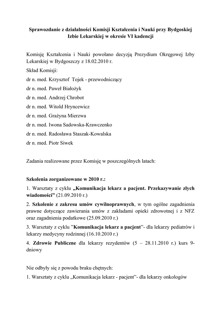 Sprawozdanie z dzialalności Komisji Kształcenia za lata 2009