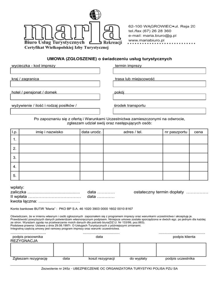 Certyfikat Wielkopolskiej Izby Turystycznej UMOWA (ZGŁOSZENIE) o świadczeniu usług turystycznych wycieczka - kod imprezy termin imprezy kraj / zagranica trasa lub miejscowość hotel / pensjonat / domek pokój wyżywienie / ilość i rodzaj posiłków / środek transportu Po zapoznaniu się z ofertą i Warunkami Uczestnictwa zamieszczonymi na odwrocie, zgłaszam udział swój oraz następujących osób: l.p. imię i nazwisko data urodz. adres / tel. nr paszportu cena 1. 2. 3. 4. 5. wpłaty: zaliczka ........................................... II wpłata ……………………………… kwota łączna: .................................. data ………… data ………… ostateczny termin dopłaty …………… Konto bankowe BUTiR ”Maria” : PKO BP S.A. 46 1020 3903 0000 1602 0010 8167 Oświadczam, że w imieniu własnym i osób zgłoszonych zapoznałem się z programem imprezy oraz warunkami uczestnictwa i akceptuję je. Prawdziwość powyższych danych potwierdzam własnoręcznym podpisem. Niniejsza umowa została sporządzona w dwóch egz. po jednym dla każdej ze stron. Wyrażam zgodę na przetwarzanie moich danych dla potrzeb biura(DZ.U. Nr 133/99, poz.883). Podstawa prawna: Ustawa z dnia 29.08.1997r. O Usługach Turystycznych z późniejszymi zmianami. Integralną częścią umowy jest ramowy program imprezy oraz warunki uczestnictwa. ............................. .............................. podpis pracownika ...................................... data podpis klienta REZYGNACJA Zgłaszam rezygnację data koszt rezygnacji do wypłaty podpis uczestnika Zezwolenie nr 245z · UBEZPIECZENIE OC ORGANIZATORA TURYSTYKI POLISA PZU SA
