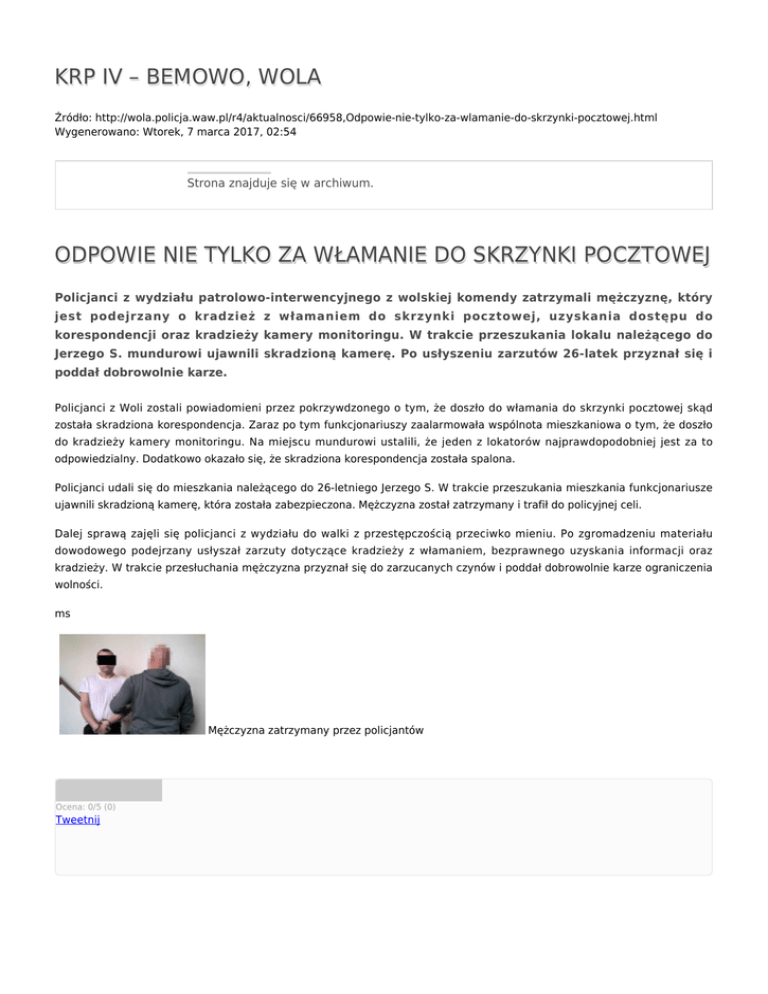 KRP IV – BEMOWO, WOLA Źródło: http://wola.policja.waw.pl/r4/aktualnosci/66958,Odpowie-nie-tylko-za-wlamanie-do-skrzynki-pocztowej.html Wygenerowano: Wtorek, 7 marca 2017, 02:54 Strona znajduje się w archiwum. ODPOWIE NIE TYLKO ZA WŁAMANIE DO SKRZYNKI POCZTOWEJ Policjanci z wydziału patrolowo-interwencyjnego z wolskiej komendy zatrzymali mężczyznę, który jest podejrzany o kradzież z włamaniem do skrzynki pocztowej, uzyskania dostępu do korespondencji oraz kradzieży kamery monitoringu. W trakcie przeszukania lokalu należącego do Jerzego S. mundurowi ujawnili skradzioną kamerę. Po usłyszeniu zarzutów 26-latek przyznał się i poddał dobrowolnie karze. Policjanci z Woli zostali powiadomieni przez pokrzywdzonego o tym, że doszło do włamania do skrzynki pocztowej skąd została skradziona korespondencja. Zaraz po tym funkcjonariuszy zaalarmowała wspólnota mieszkaniowa o tym, że doszło do kradzieży kamery monitoringu. Na miejscu mundurowi ustalili, że jeden z lokatorów najprawdopodobniej jest za to odpowiedzialny. Dodatkowo okazało się, że skradziona korespondencja została spalona. Policjanci udali się do mieszkania należącego do 26-letniego Jerzego S. W trakcie przeszukania mieszkania funkcjonariusze ujawnili skradzioną kamerę, która została zabezpieczona. Mężczyzna został zatrzymany i trafił do policyjnej celi. Dalej sprawą zajęli się policjanci z wydziału do walki z przestępczością przeciwko mieniu. Po zgromadzeniu materiału dowodowego podejrzany usłyszał zarzuty dotyczące kradzieży z włamaniem, bezprawnego uzyskania informacji oraz kradzieży. W trakcie przesłuchania mężczyzna przyznał się do zarzucanych czynów i poddał dobrowolnie karze ograniczenia wolności. ms Mężczyzna zatrzymany przez policjantów Ocena: 0/5 (0) Tweetnij