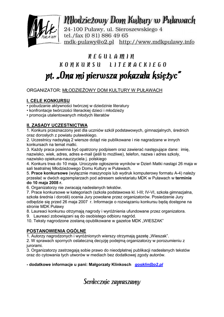REGULAMIN KONKURSU LITERACKIEGO pt. „Ona mi pierwsza pokazała księżyc ” ORGANIZATOR: MŁODZIEśOWY DOM KULTURY W PUŁAWACH I. CELE KONKURSU • pobudzanie aktywności twórczej w dziedzinie literatury • konfrontacje twórczości literackiej dzieci i młodzieŜy • promocja utalentowanych młodych literatów II. ZASADY UCZESTNICTWA 1. Konkurs przeznaczony jest dla uczniów szkół podstawowych, gimnazjalnych, średnich oraz dorosłych z powiatu puławskiego. 2. Uczestnicy nadsyłają 2 wiersze dotąd nie publikowane i nie nagradzane w innych konkursach na temat matki. 3. KaŜdy praca powinna być opatrzony podpisem oraz zawierać następujące dane: imię, nazwisko, wiek, adres, adres e-mail (jeśli to moŜliwe), telefon, nazwa i adres szkoły, nazwisko opiekuna-nauczyciela j. polskiego 4. Konkurs trwa do 10 maja. Uroczyste ogłoszenie wyników w Dzień Matki nastąpi 26 maja w sali teatralnej MłodzieŜowego Domu Kultury w Puławach. 5. Prace konkursowe (wyłącznie maszynopis lub wydruk komputerowy formatu A-4) naleŜy przesłać w dwóch egzemplarzach pod adresem sekretariatu MDK w Puławach w terminie do 10 maja 2008 r. 6. Organizatorzy nie zwracają nadesłanych tekstów. 7. Prace konkursowe w kategoriach (szkoła podstawowa kl. I-III; IV-VI, szkoła gimnazjalna, szkoła średnia i dorośli) ocenia Jury powołane przez organizatorów. Posiedzenie Jury odbędzie się przed 26 maja 2007 r. Informacje o rozwiązaniu konkursu będą dostępne na stronie MDK Puławy 8. Laureaci konkursu otrzymają nagrody i wyróŜnienia ufundowane przez organizatora. 9. Laureaci zobowiązani są do osobistego odbioru nagród. 10. Teksty nagrodzone zostaną opublikowane w gazetce MDK „WIESZAK” POSTANOWIENIA OGÓLNE 1. Autorzy nagrodzonych i wyróŜnionych wierszy otrzymają gazetę „Wieszak”. 2. W sprawach spornych ostateczną decyzję podejmą organizatorzy w porozumieniu z jurorami. 3. Organizatorzy zastrzegają sobie prawo do nieodpłatnej publikacji nadesłanych tekstów oraz do cytowania tych utworów w mediach bez dodatkowej zgody autorów. - dodatkowe informacje u pani: Małgorzaty Klinkosch [email protected] Serdecznie zapraszamy
